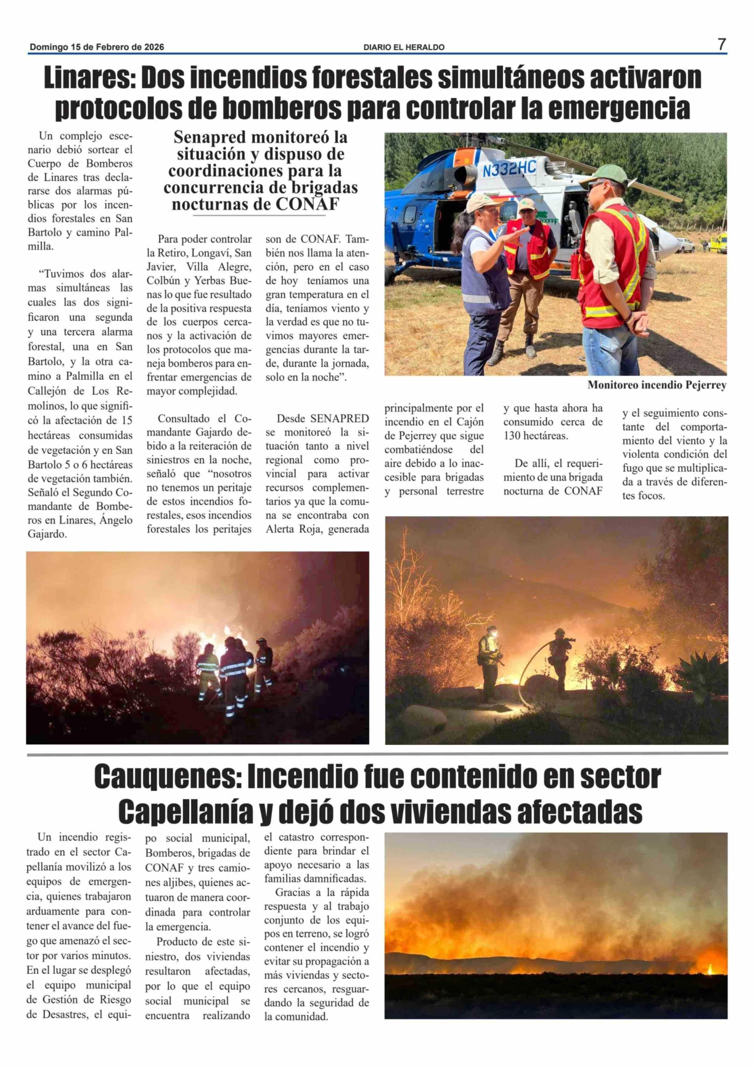Cauquenes: Incendio fue contenido en sector Capellanía y dejó dos viviendas afectadas 15-02-2026 El Heraldo |