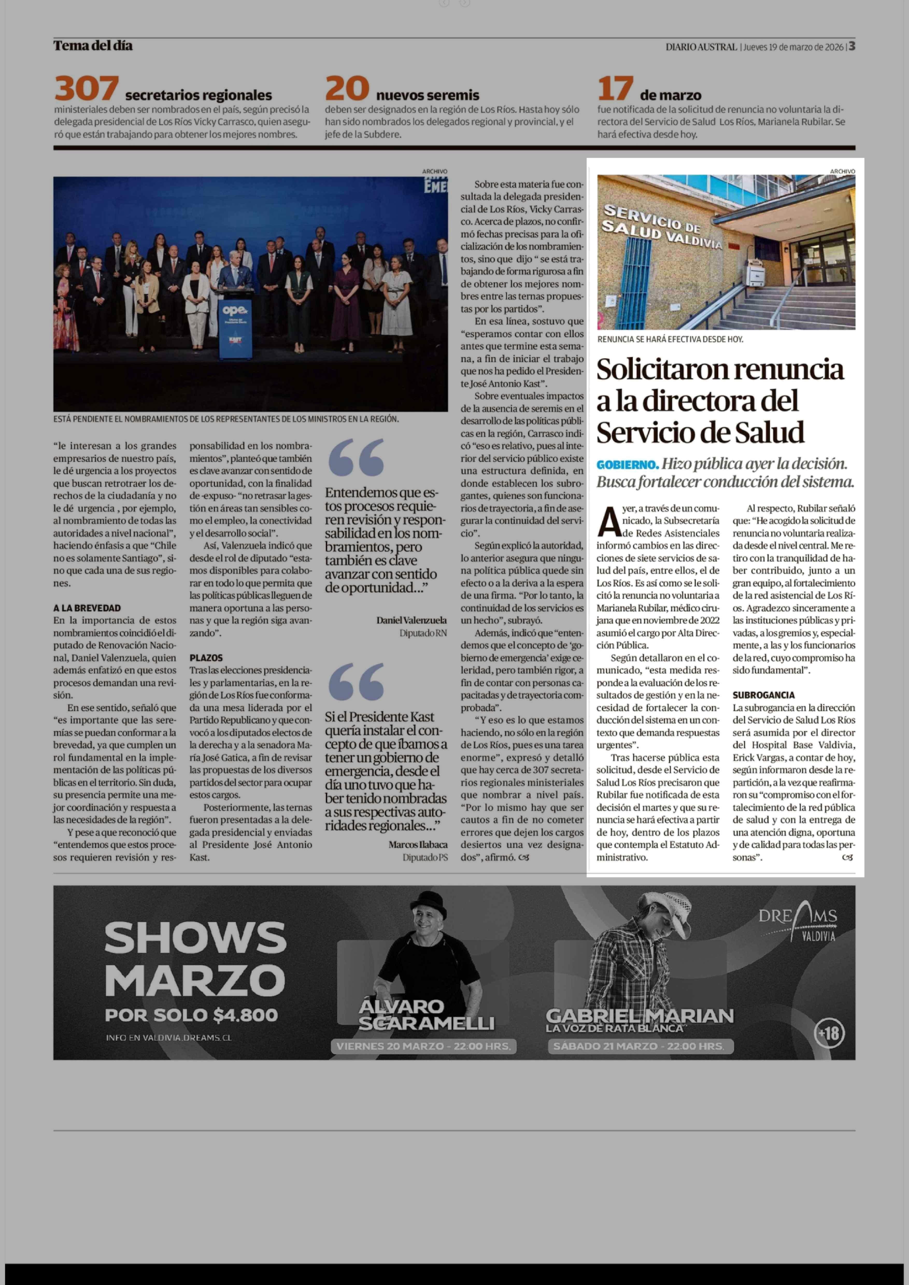 Solicitaron renuncia a la directora del Servicio de Salud 19-03-2026 Diario Austral Región de Los Ríos |