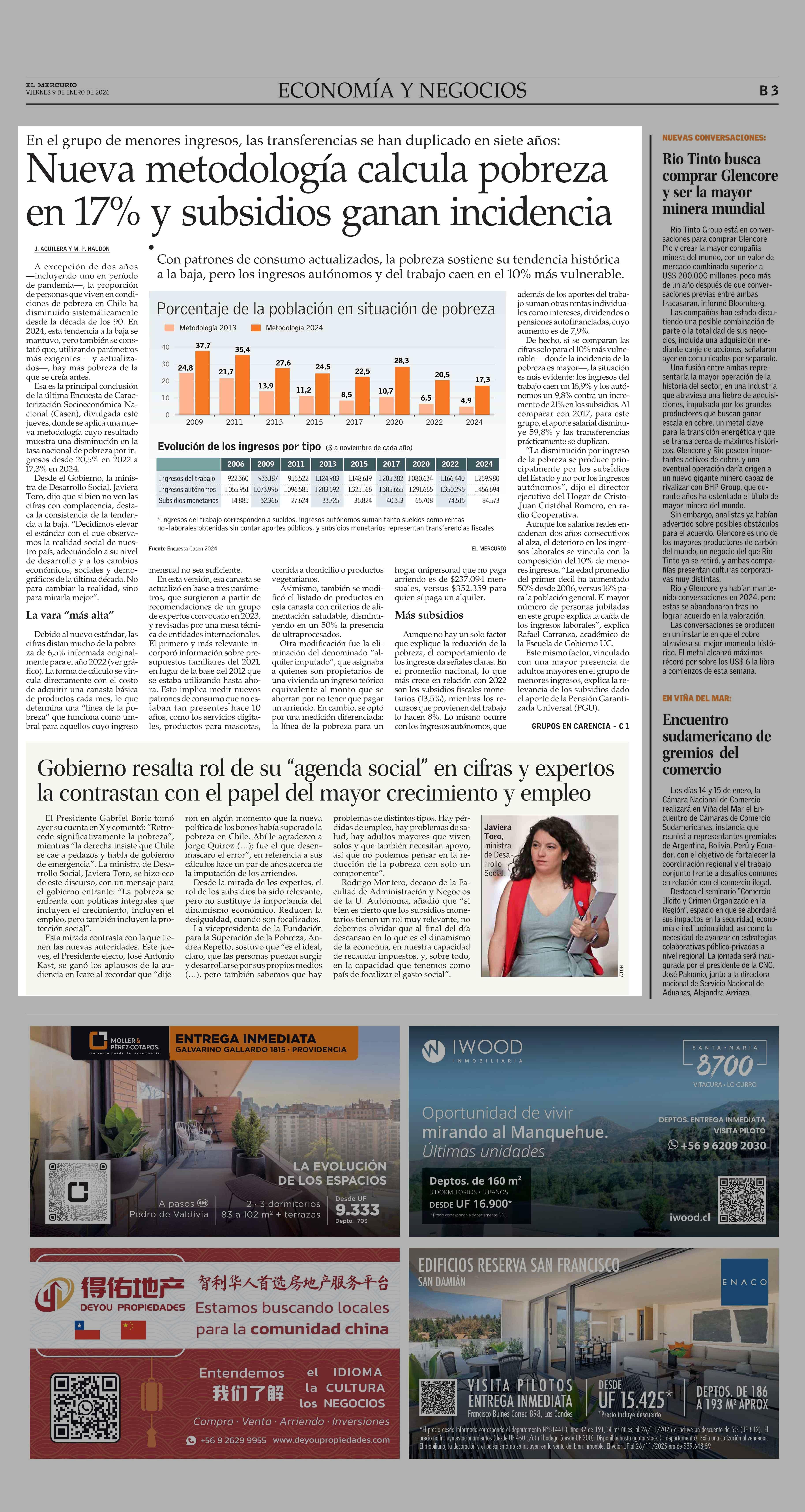 Nueva metodología calcula pobreza en 17% y subsidios ganan incidencia 09-01-2026 El Mercurio |