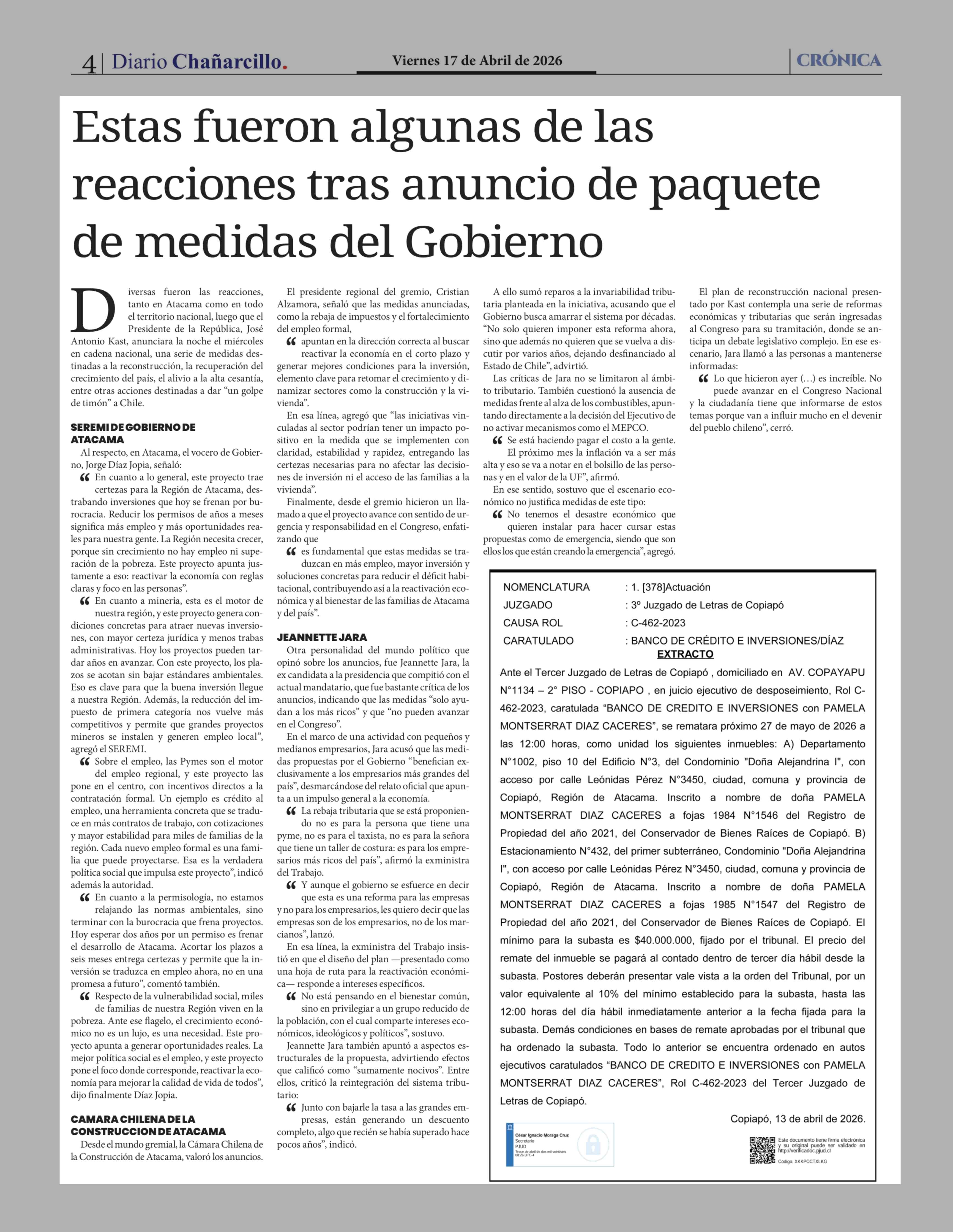 Estas fueron algunas de las reacciones tras anuncio de paquete de medidas del Gobierno 17-04-2026 Diario Chañarcillo |