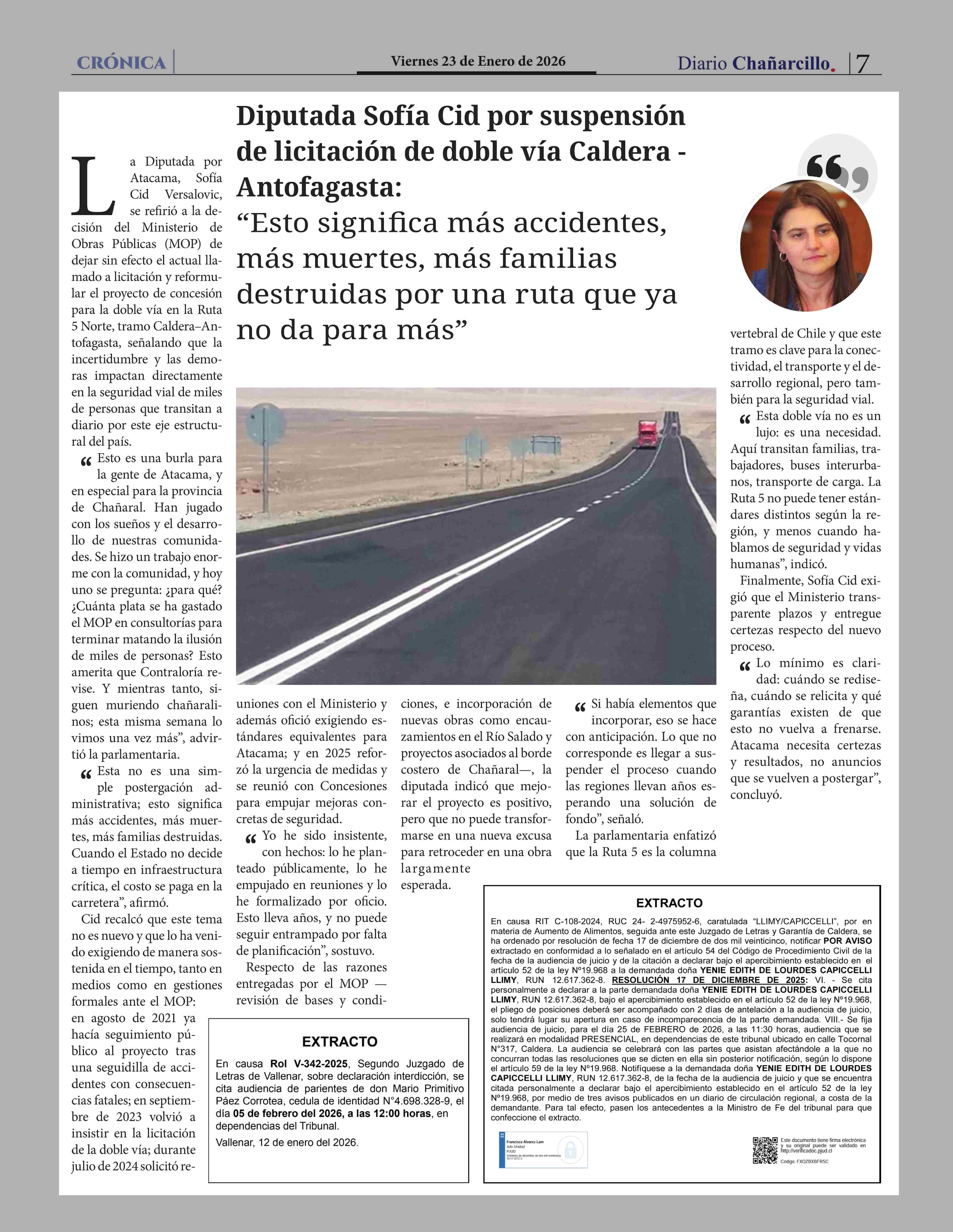 | Título: | Diputada Sofía Cid por suspensión de licitación de doble vía Caldera Antofagasta: "Esto significa más accidentes, más muertes, más familias destruidas por una ruta que ya no da para más" |