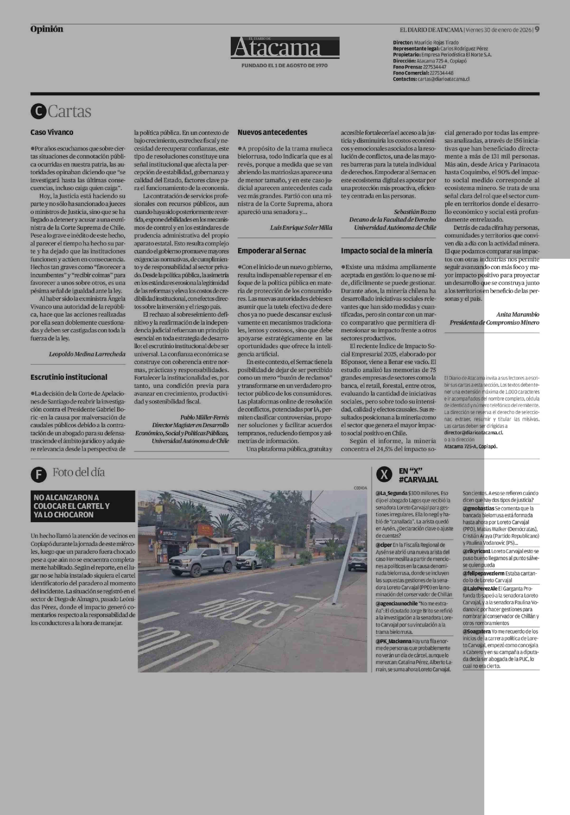 Cartas: Empoderar al Sernac 30-01-2026 El Diario de Atacama |