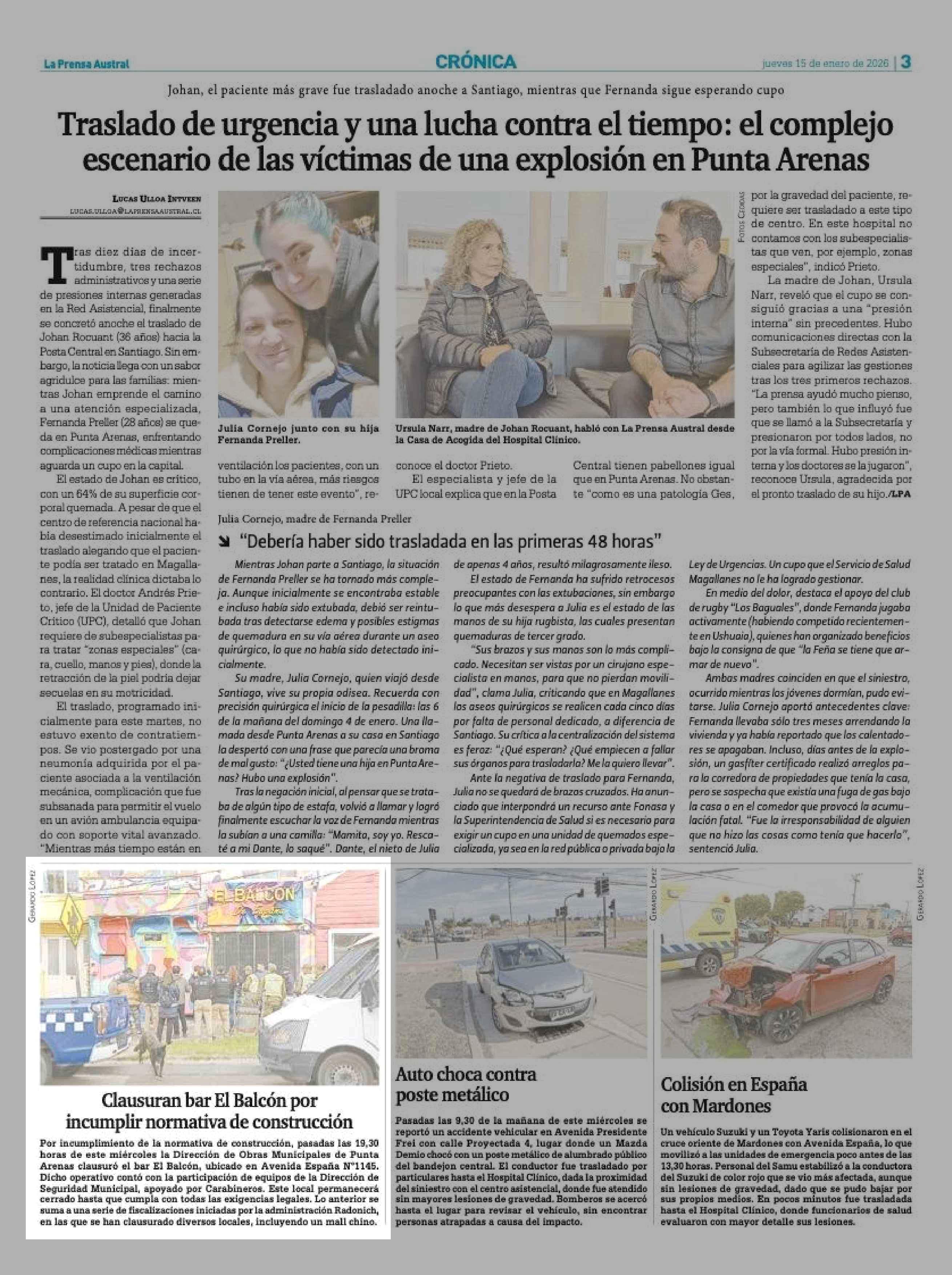 Clausuran bar El Balcón por incumplir normativa de construcción 15-01-2026 La Prensa Austral |
