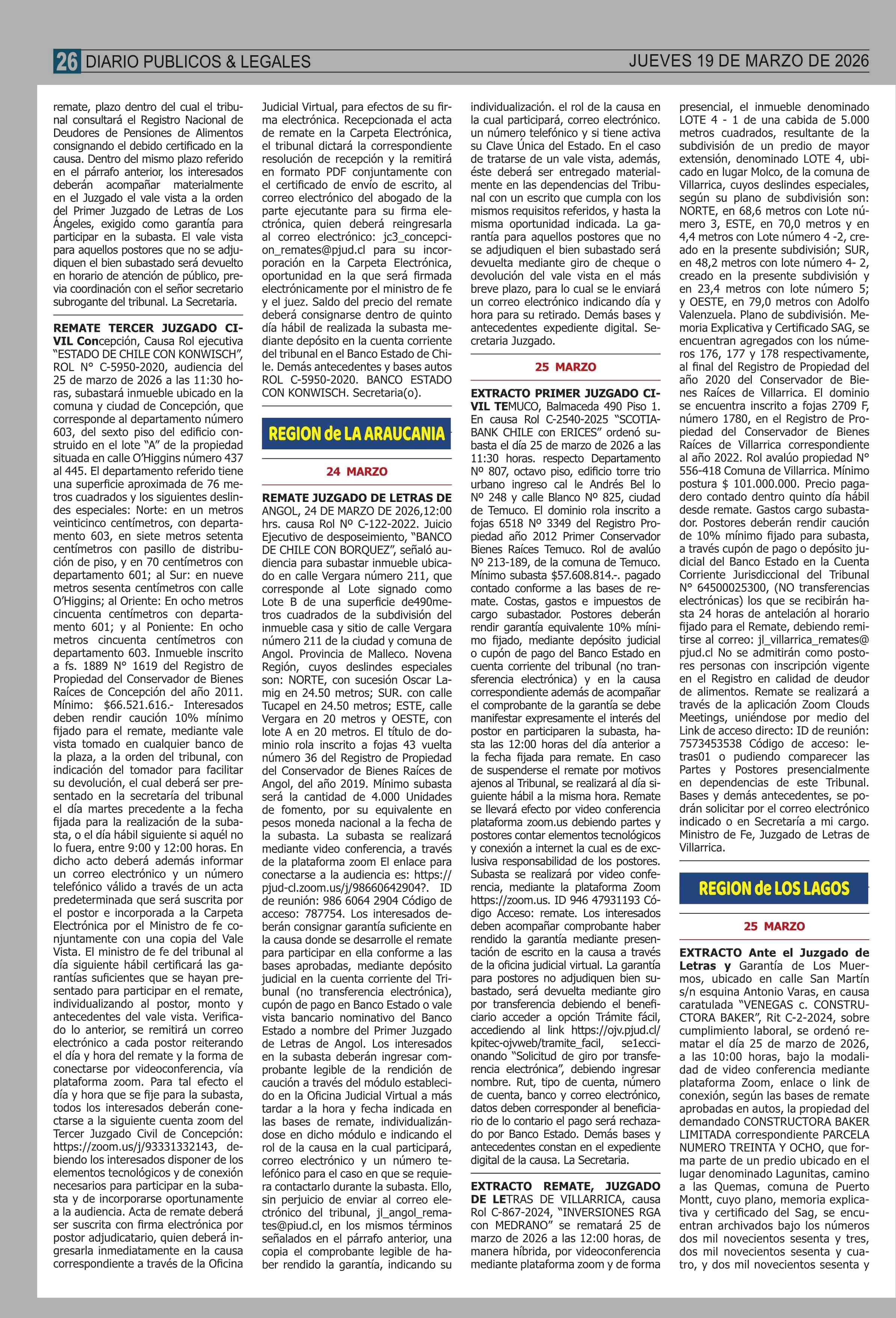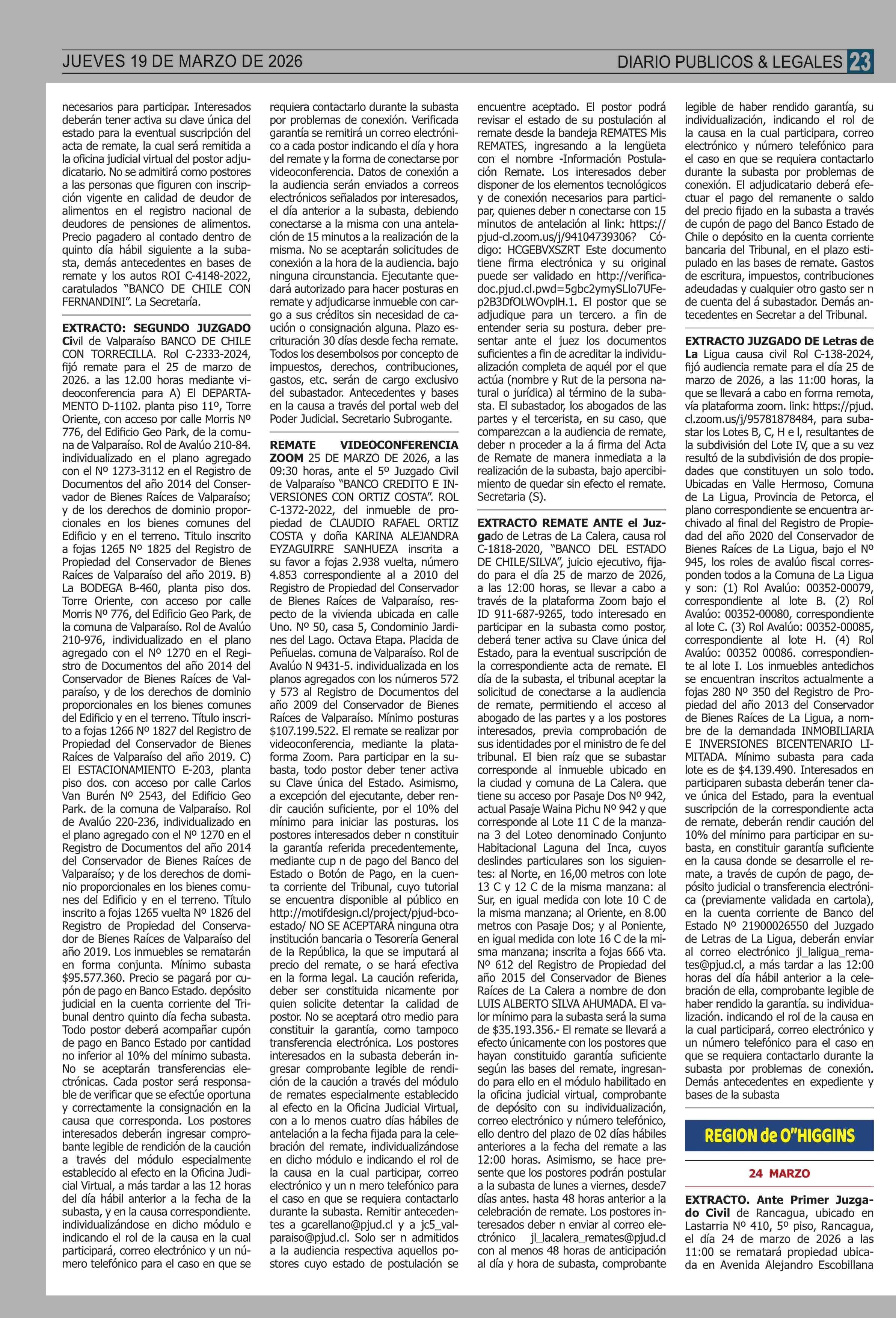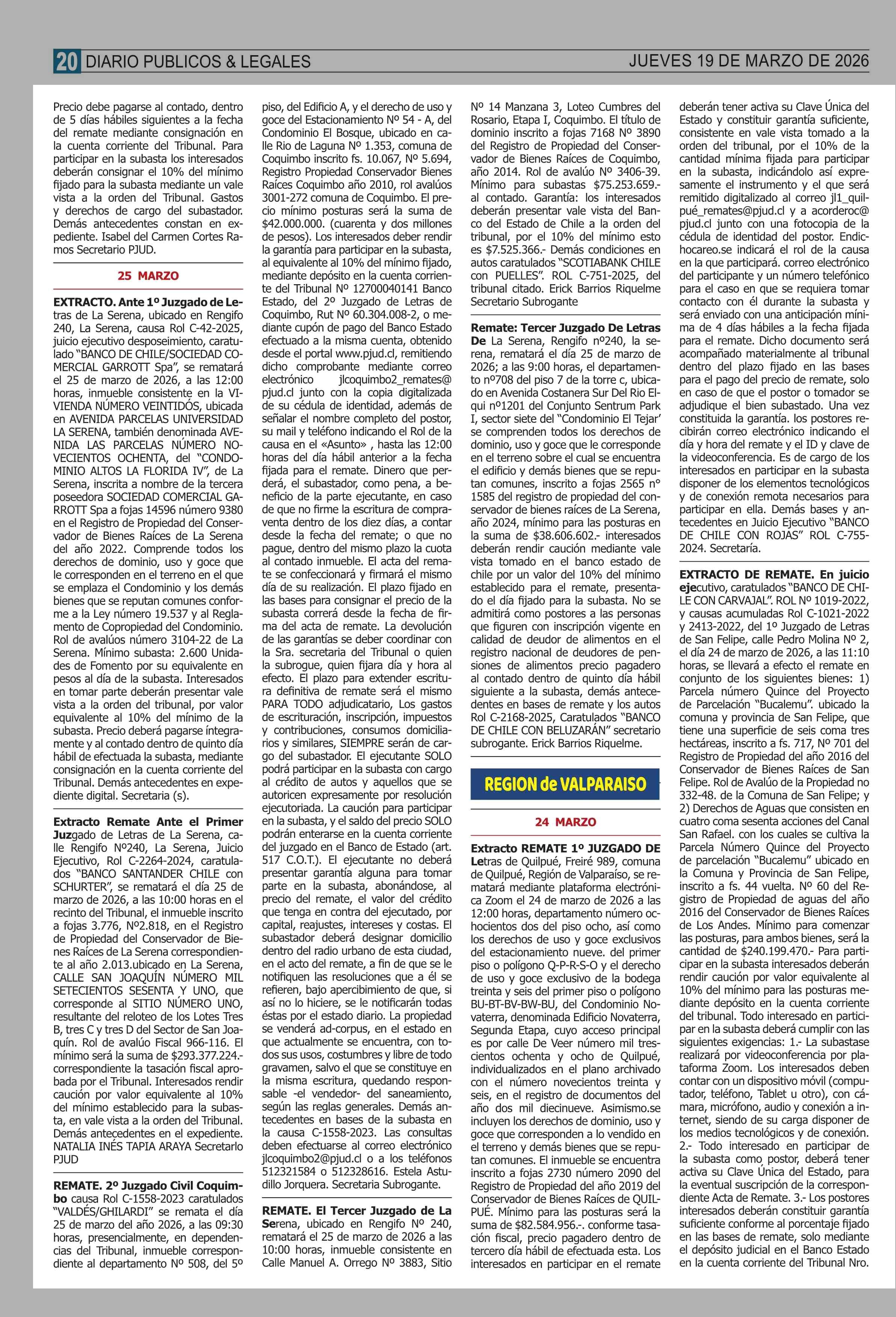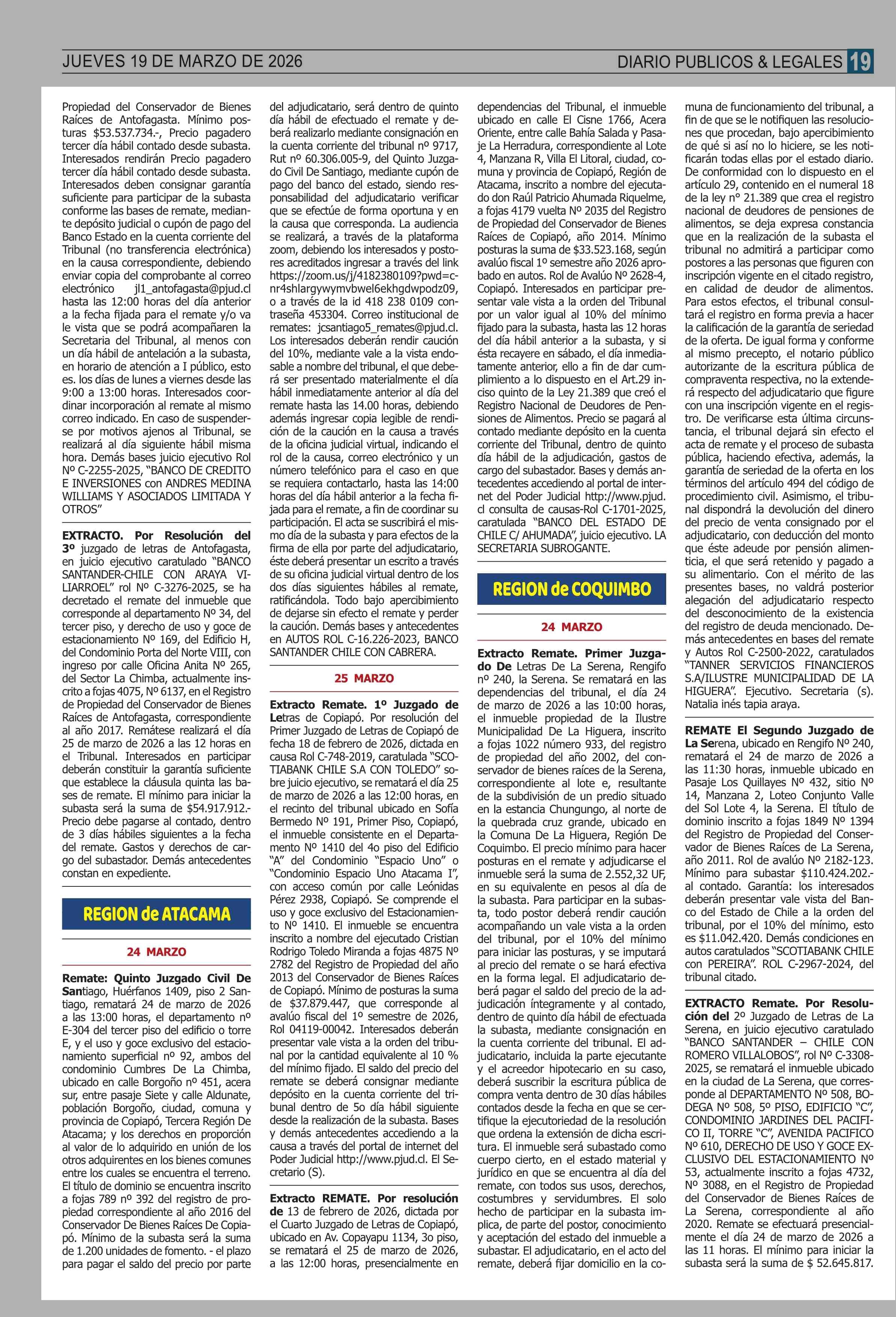 AVISO LICITACIONES: REMATES de PROPIEDADES (ORDENADOS por REGIONES 19-03-2026 P&L Públicos y Legales |
