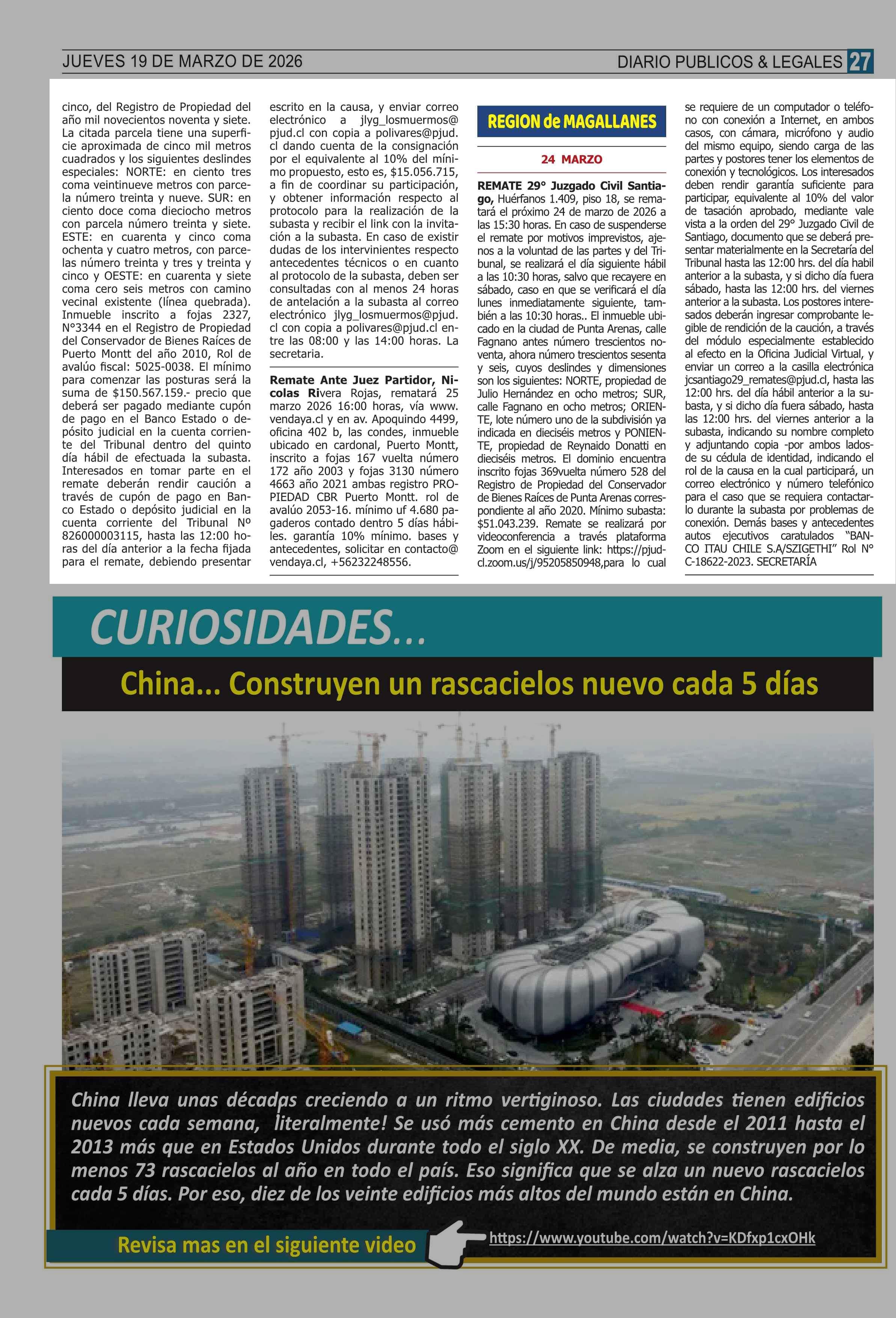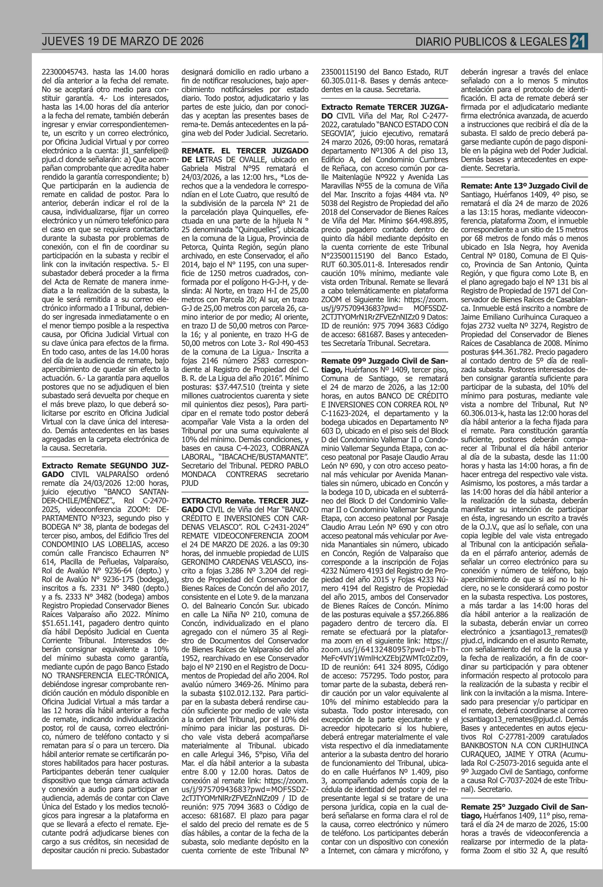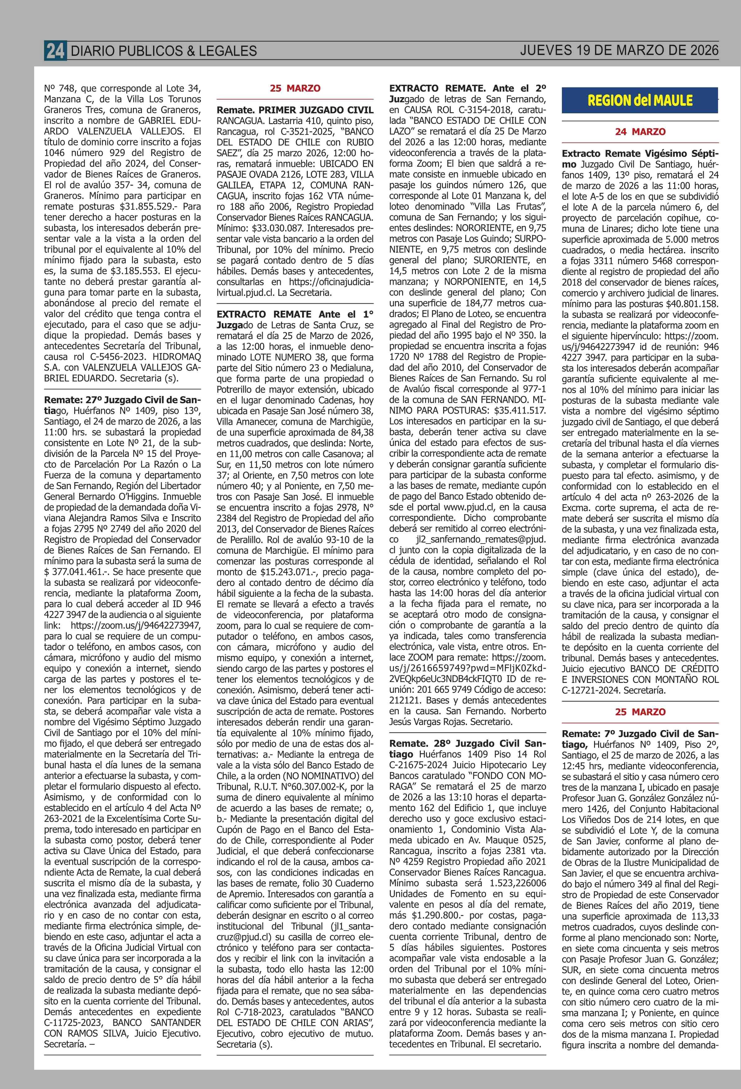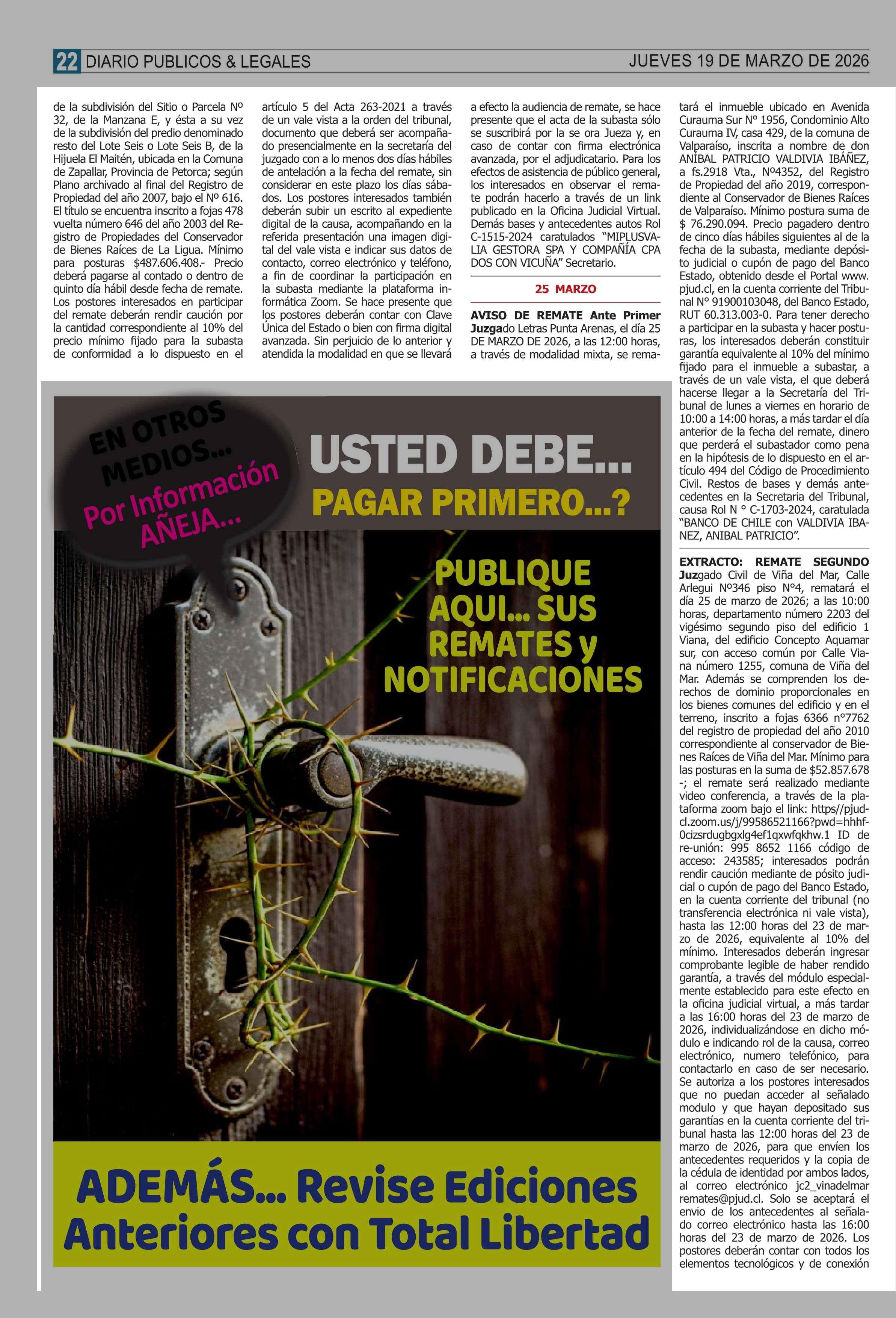 AVISO LICITACIONES: REMATES de PROPIEDADES (ORDENADOS por REGIONES 19-03-2026 P&L Públicos y Legales |