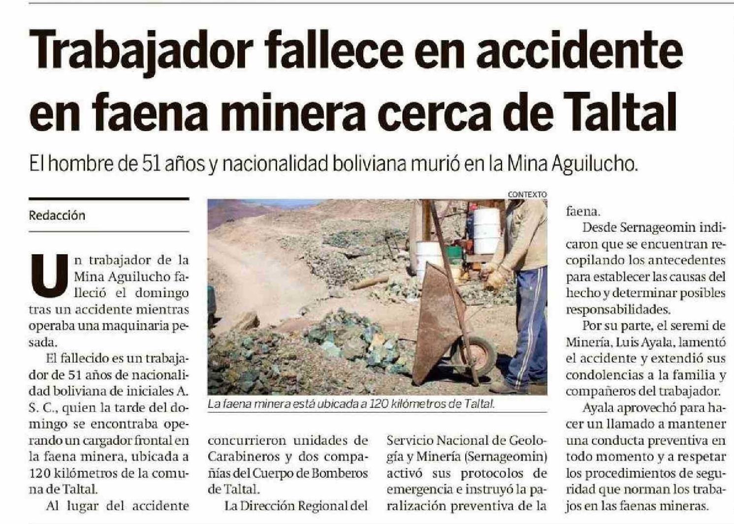 | Título: | Trabajador fallece en accidente en faena minera cerca de Taltal |