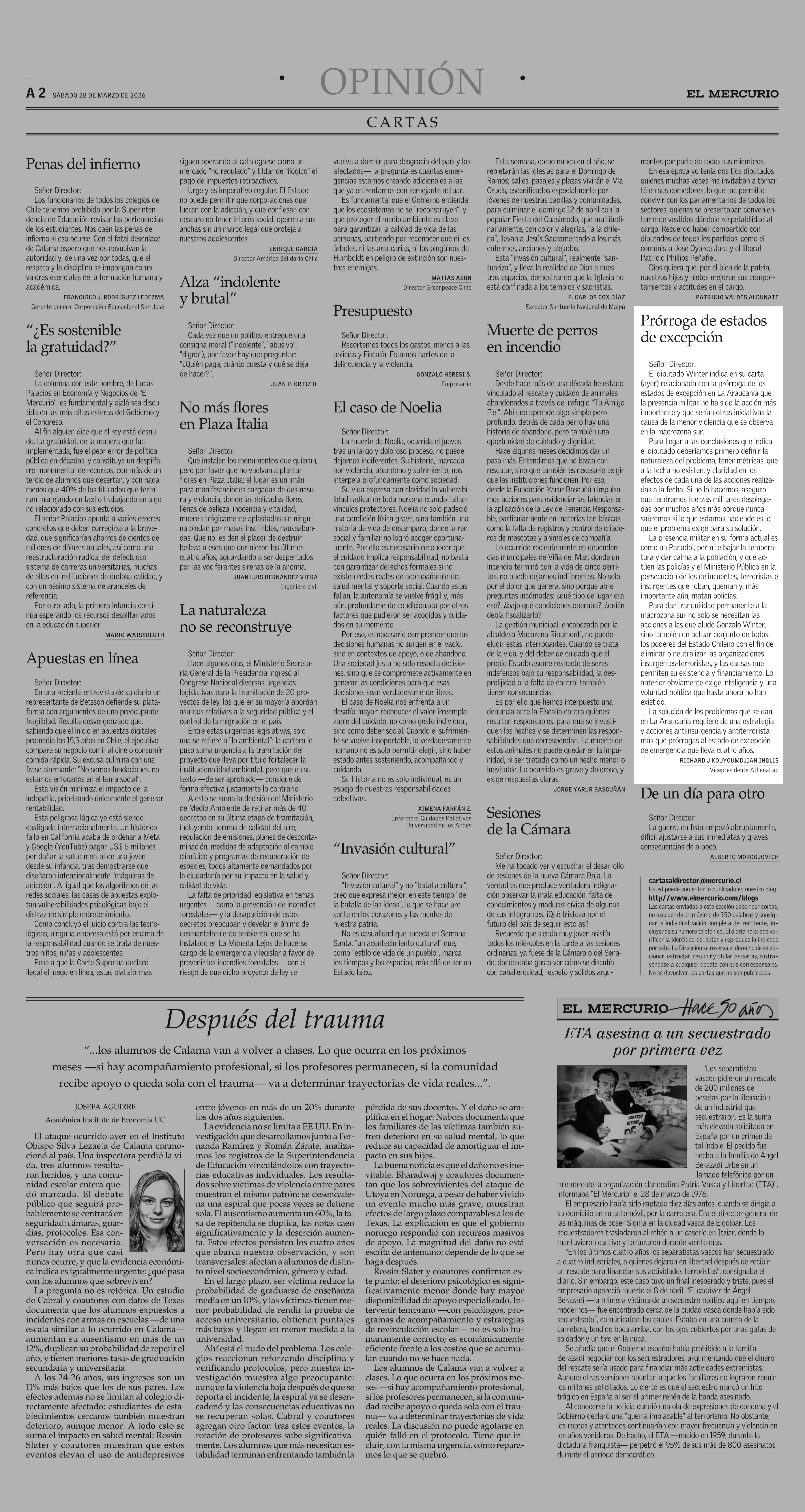 Cartas: Prórroga de estados de excepción 28-03-2026 El Mercurio |