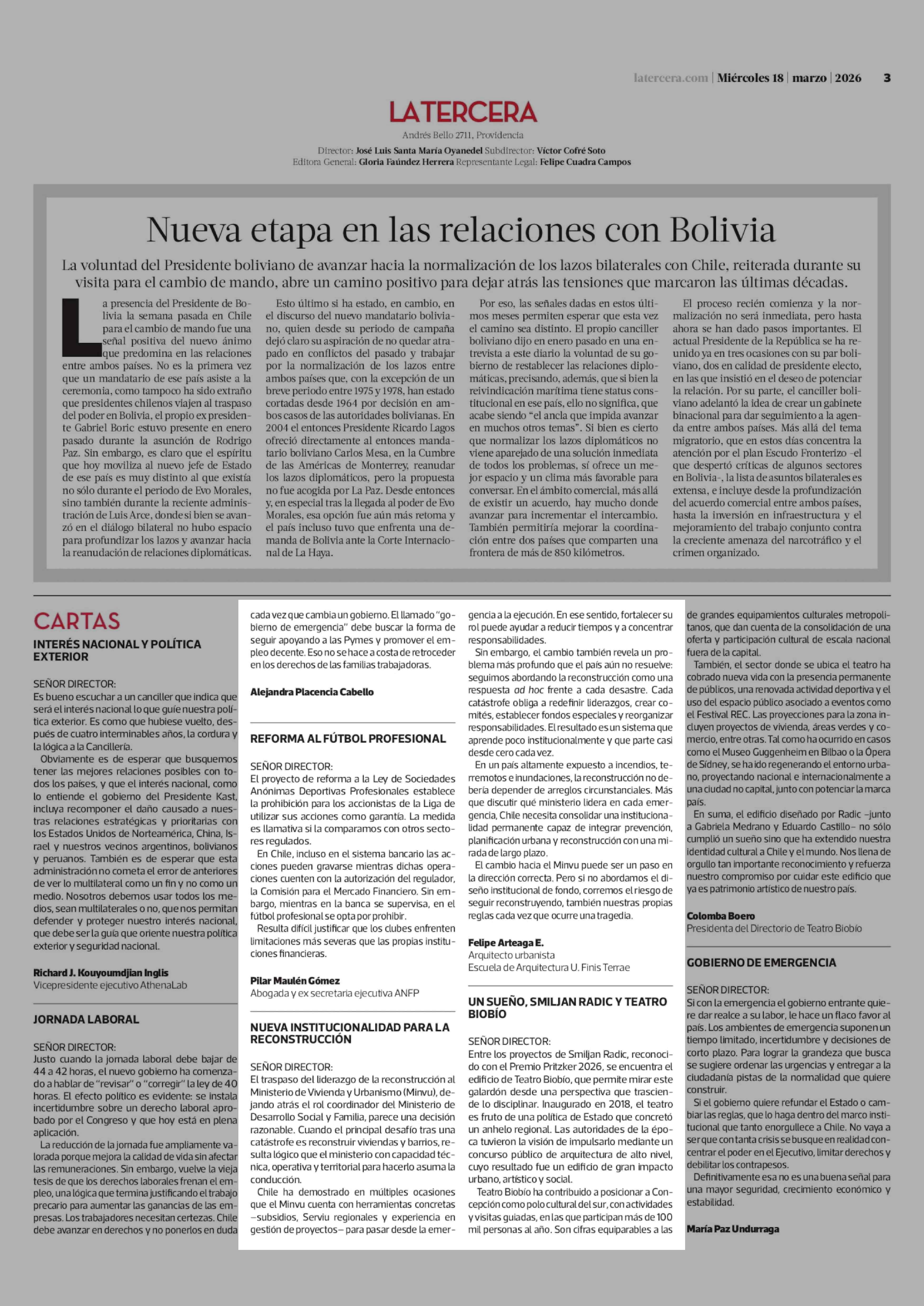 Cartas: NUEVA INSTITUCIONALIDAD PARA LA RECONSTRUCCIÓN 18-03-2026 La Tercera |