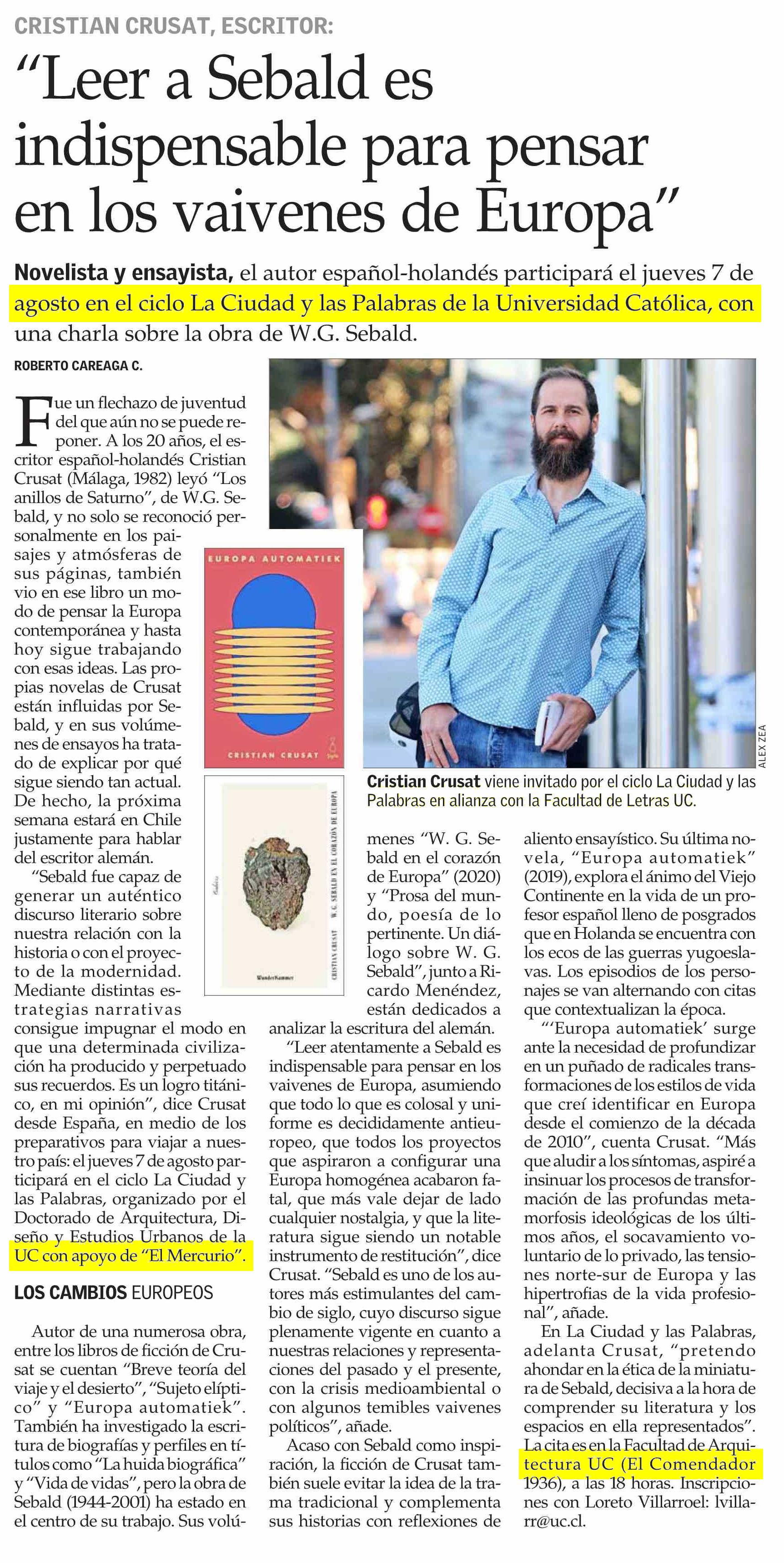 “Leer a Sebald es indispensable para pensar en los vaivenes de Europa” 01-08-2025 El Mercurio |