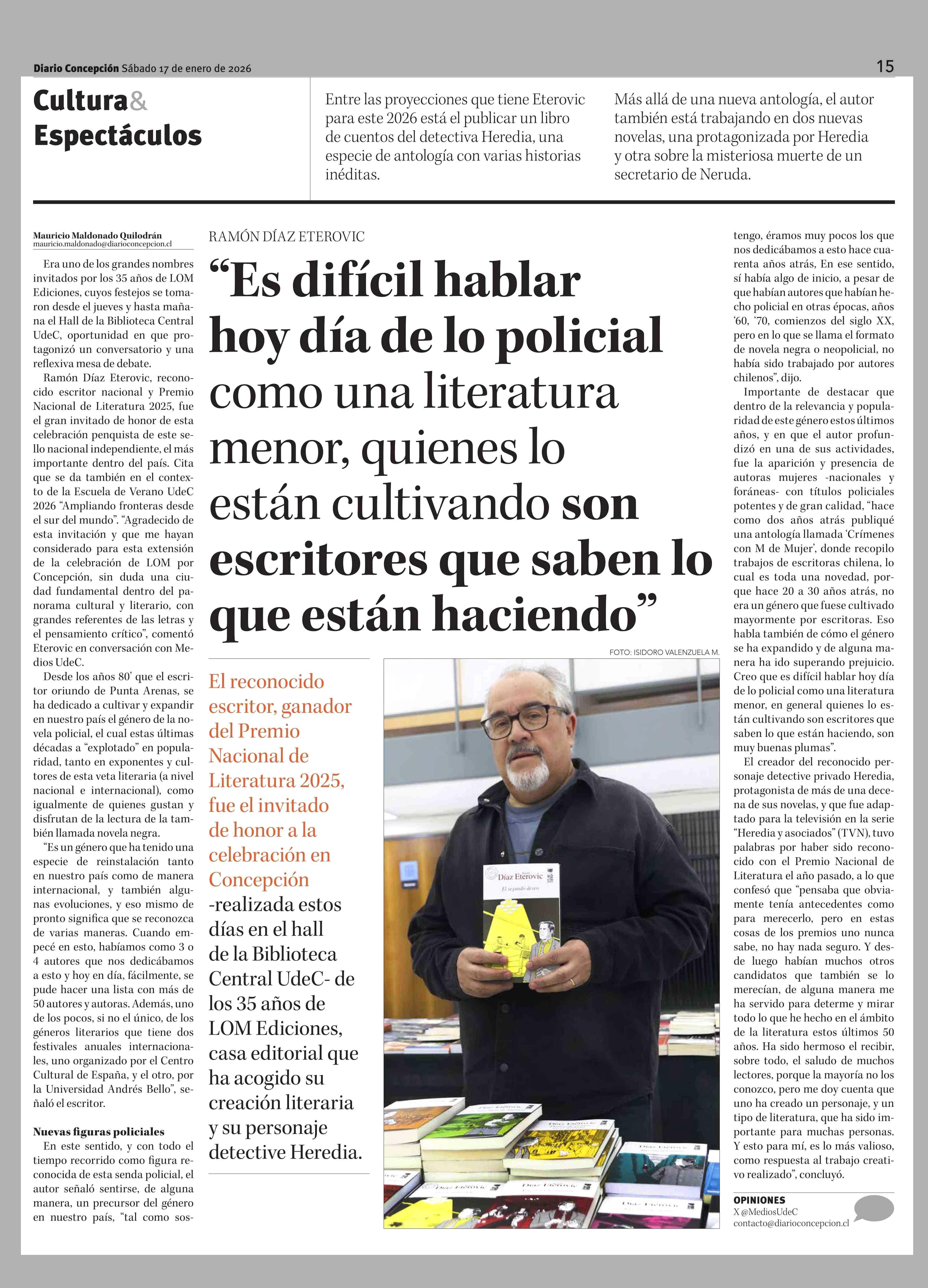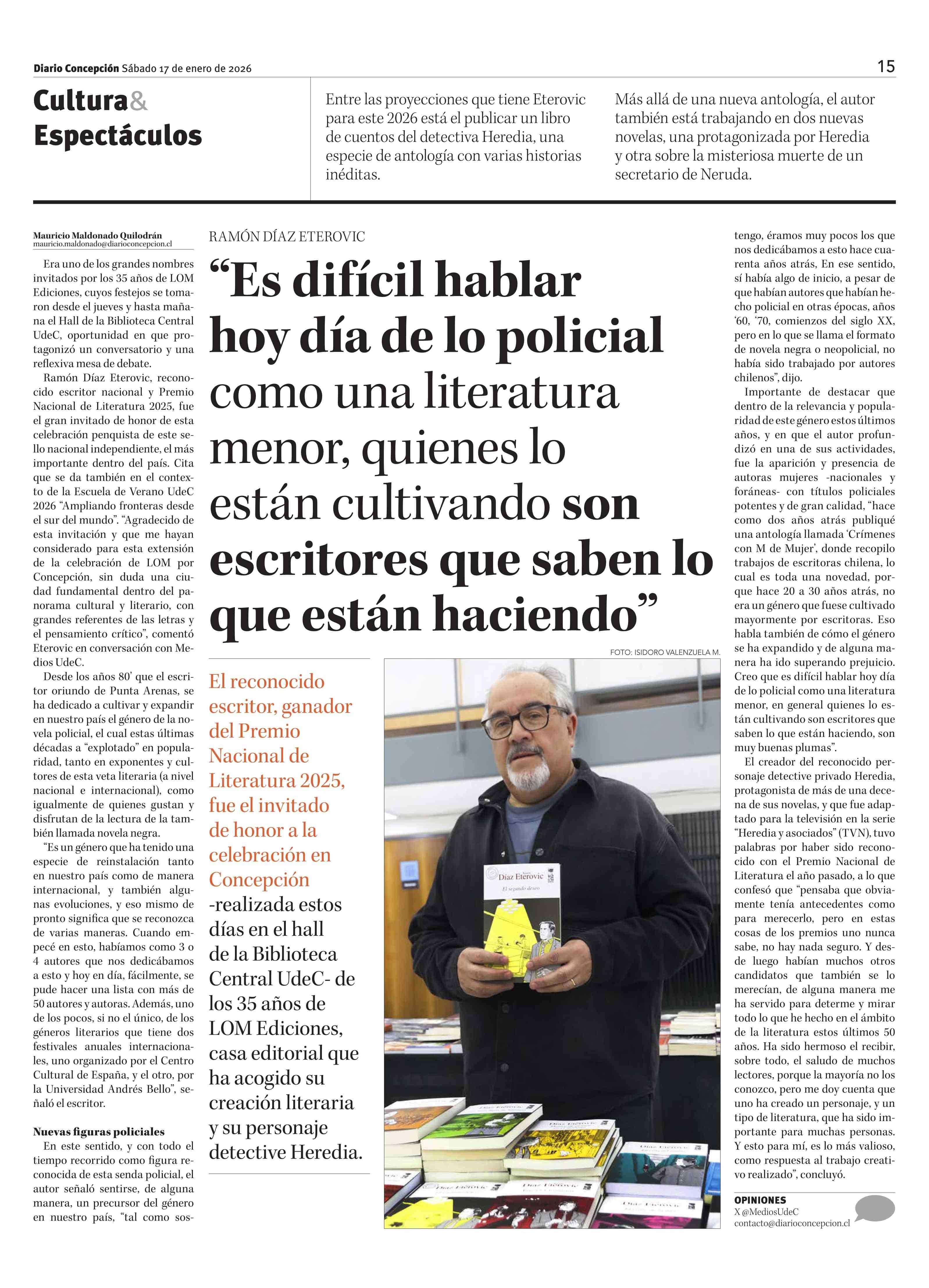 "Es difícil hablar hoy día de lo policial como una literatura menor, quienes lo están cultivando son escritores que saben lo que están haciendo" 17-01-2026 Diario Concepción |
