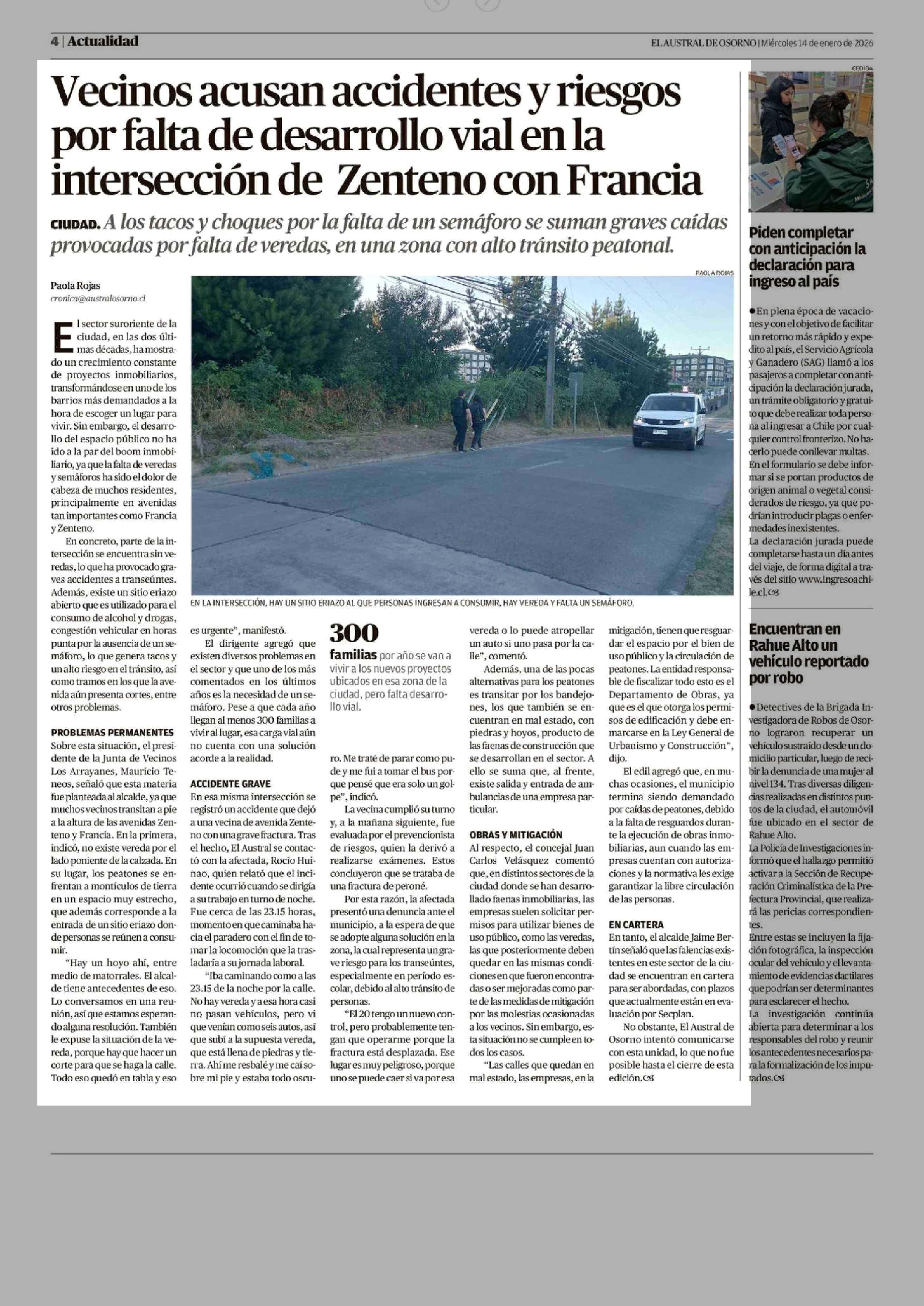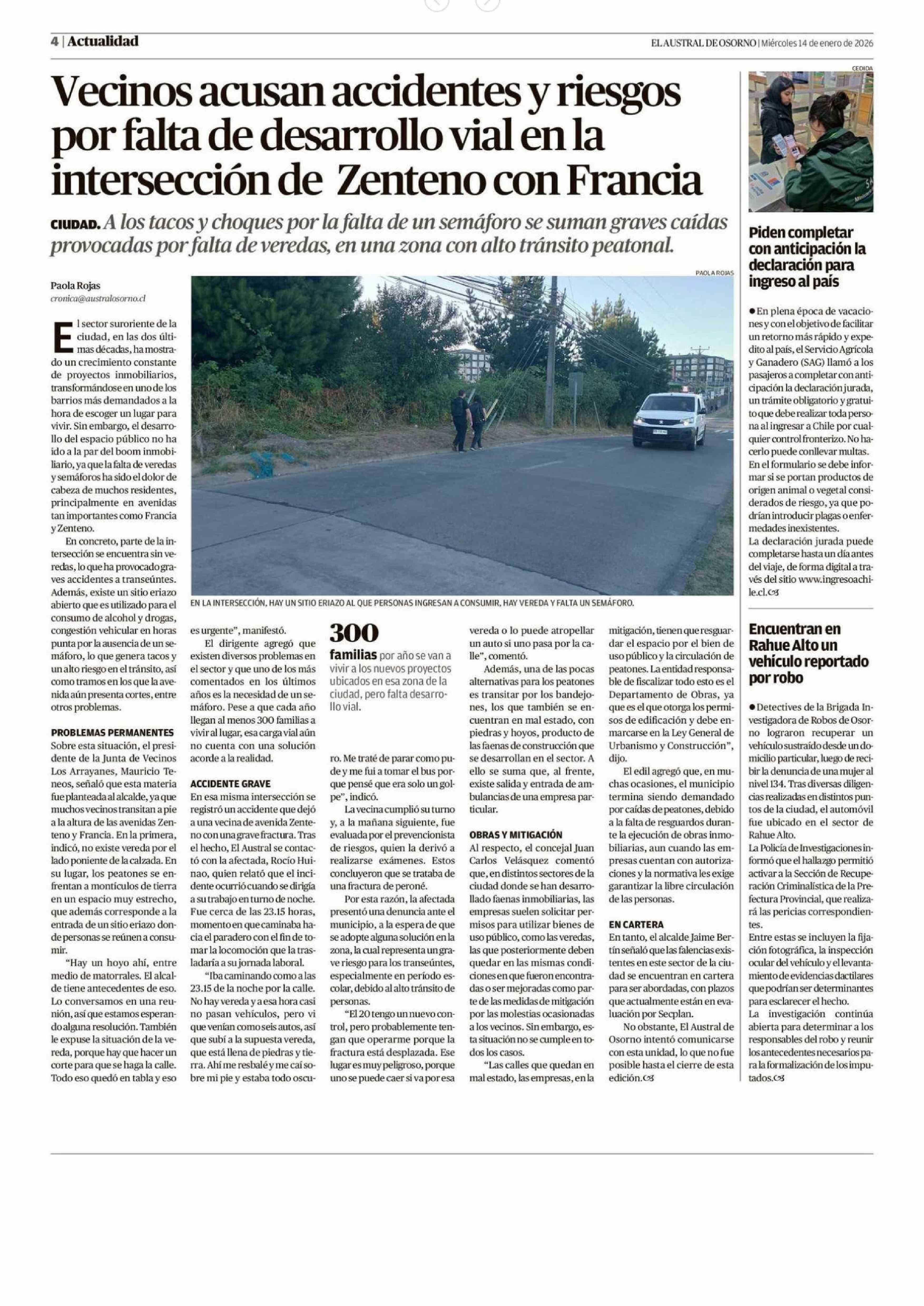 Vecinos acusan accidentes y riesgos por falta de desarrollo vial en la intersección de Zenteno con Francia 14-01-2026 El Austral de Osorno |