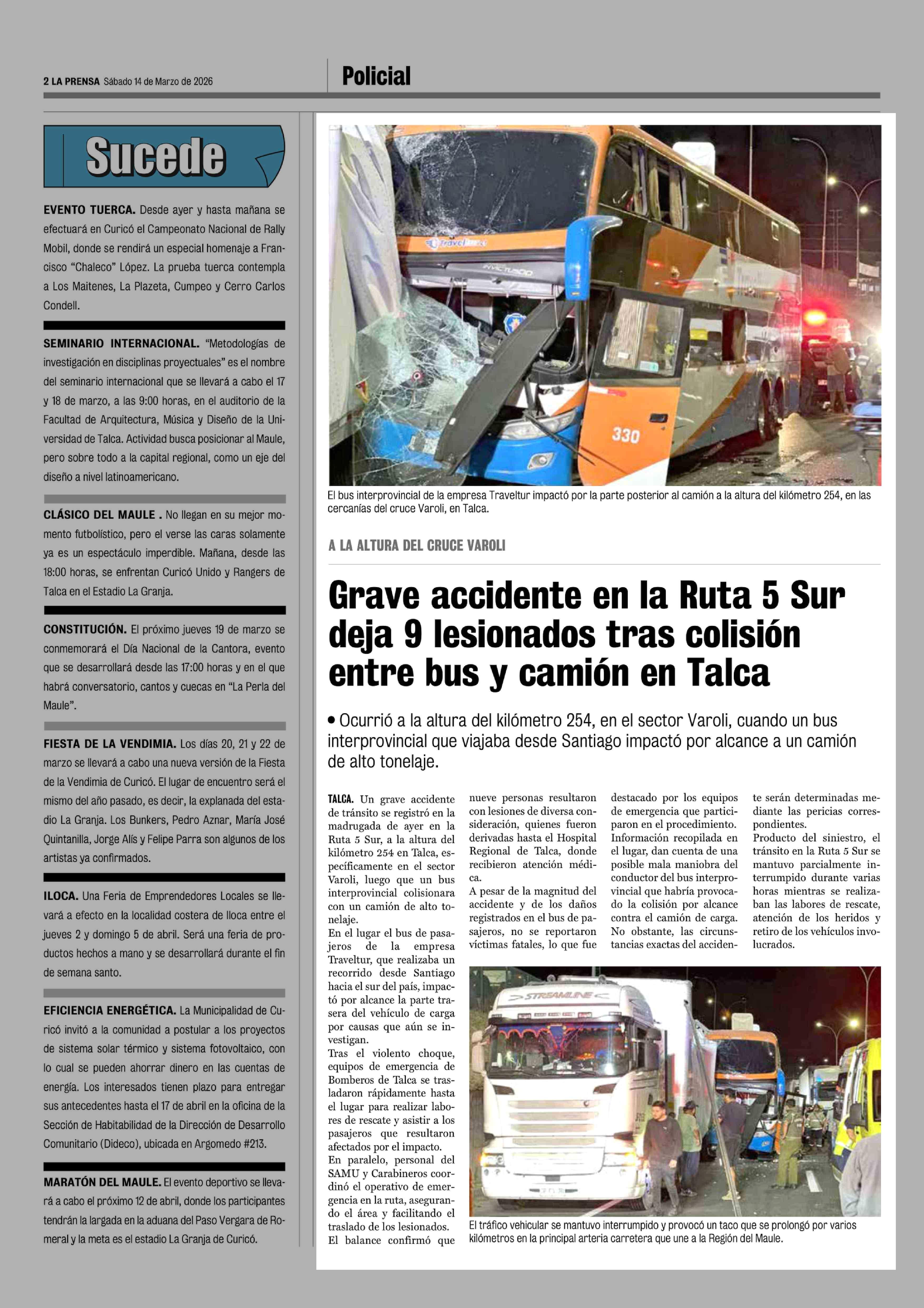 Grave accidente en la Ruta 5 Sur deja 9 lesionados tras colisión entre bus y camión en Talca 14-03-2026 La Prensa de Curicó |