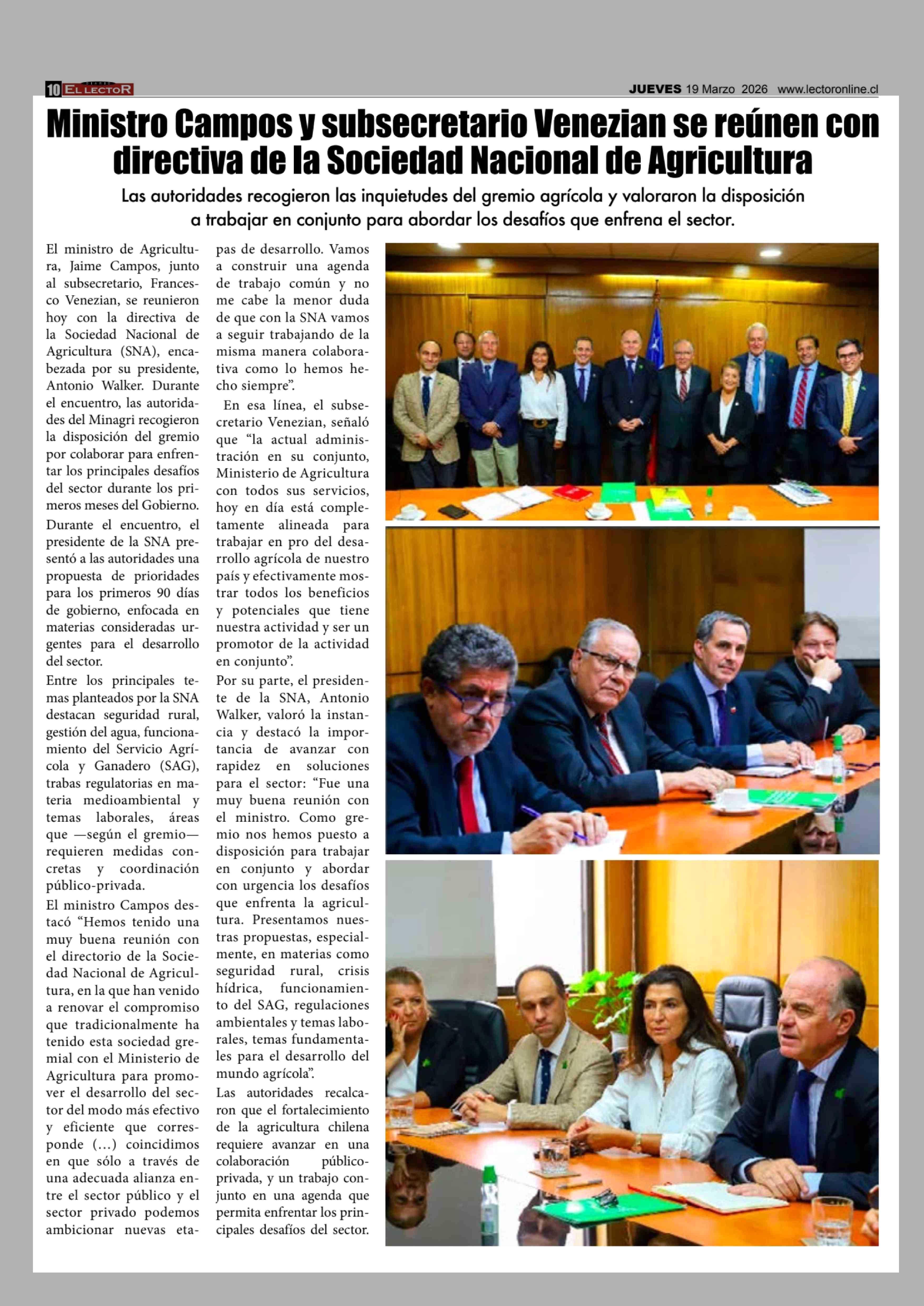 Ministro Campos y subsecretario Venezian se reúnen con directiva de la Sociedad Nacional de Agricultura 19-03-2026 El Lector |
