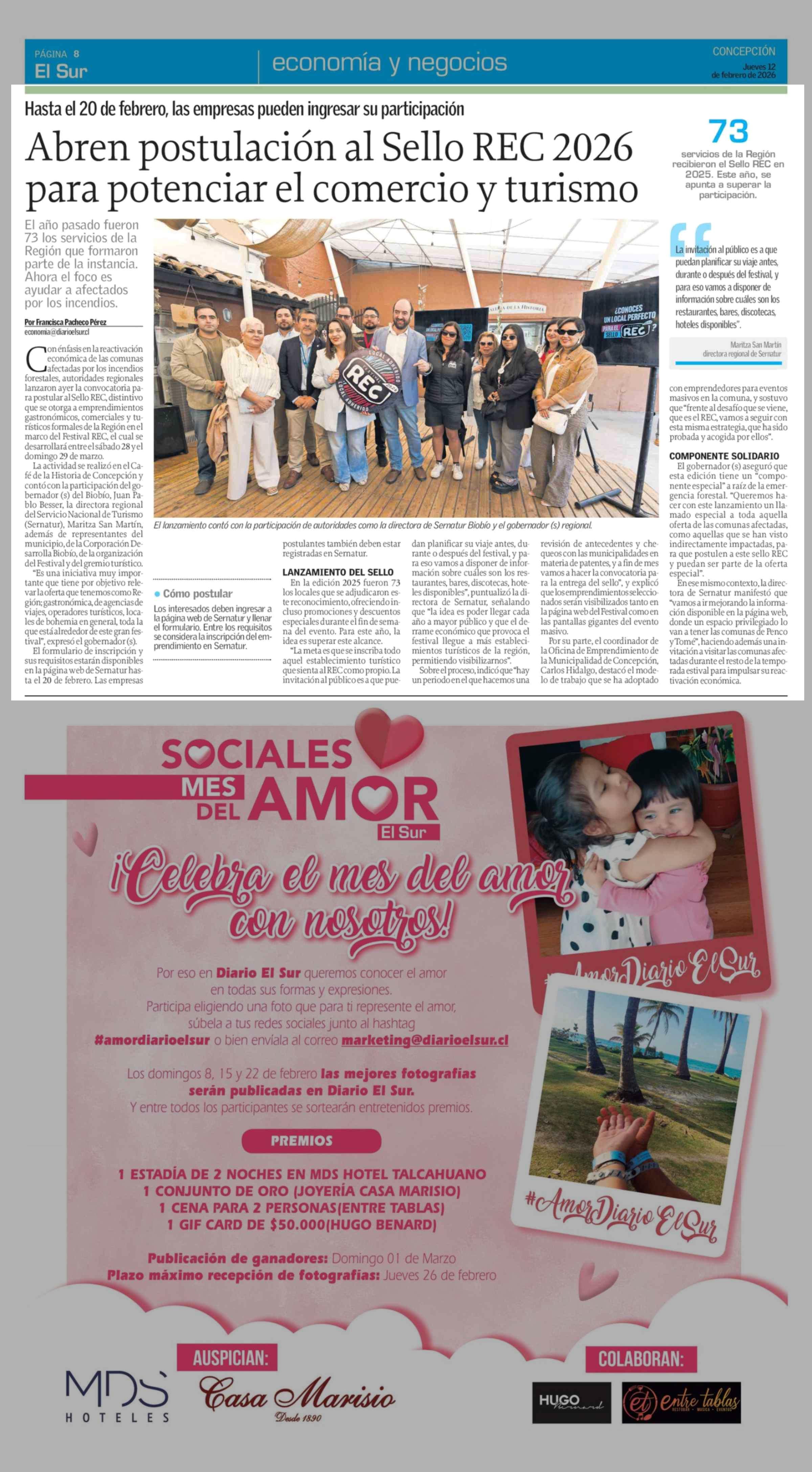Abren postulación al Sello REC 2026 para potenciar el comercio y turismo 12-02-2026 El Sur |