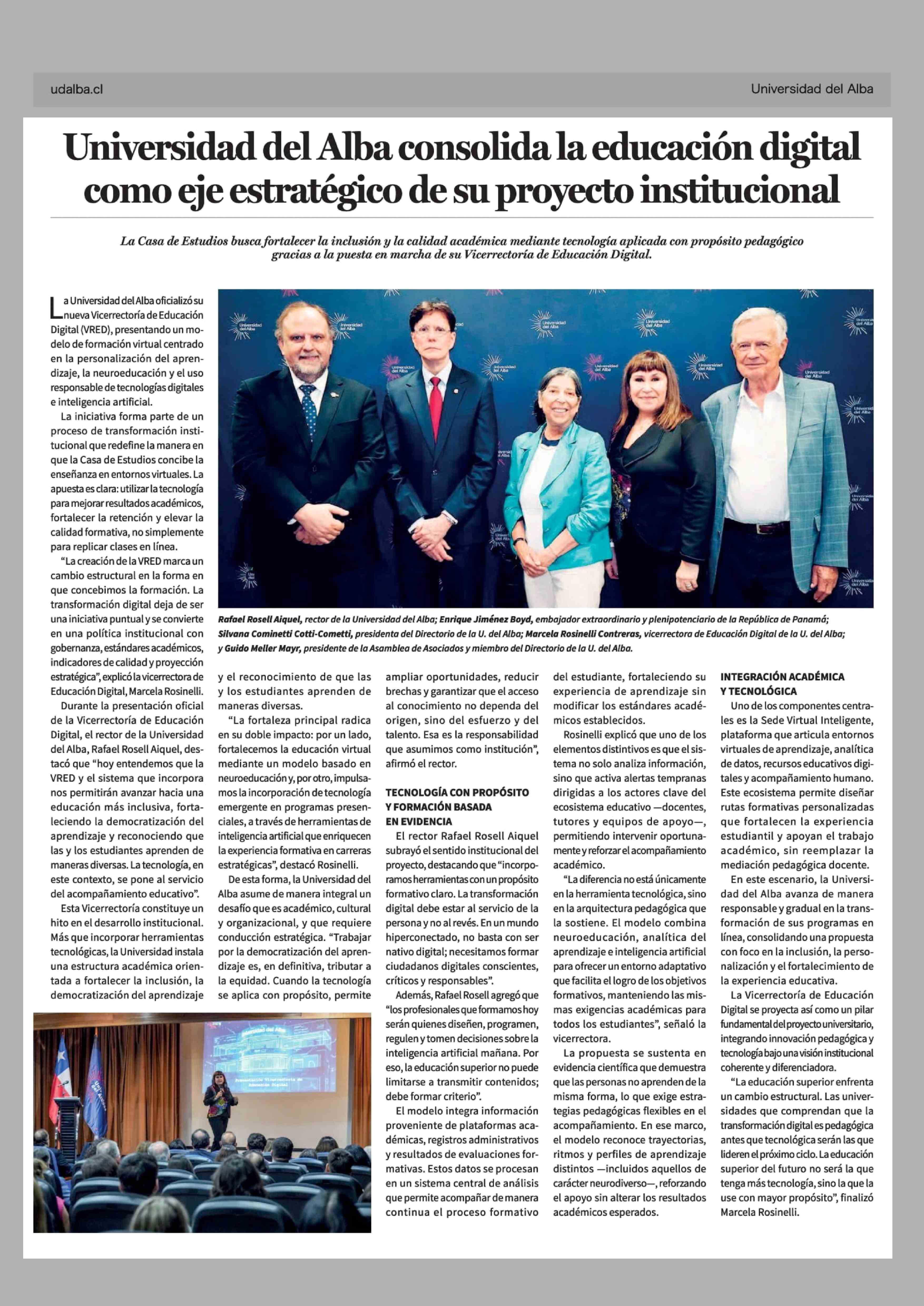 Universidad del Alba consolida la educación digital como eje estratégico de su proyecto institucional 20-02-2026 La Tercera |