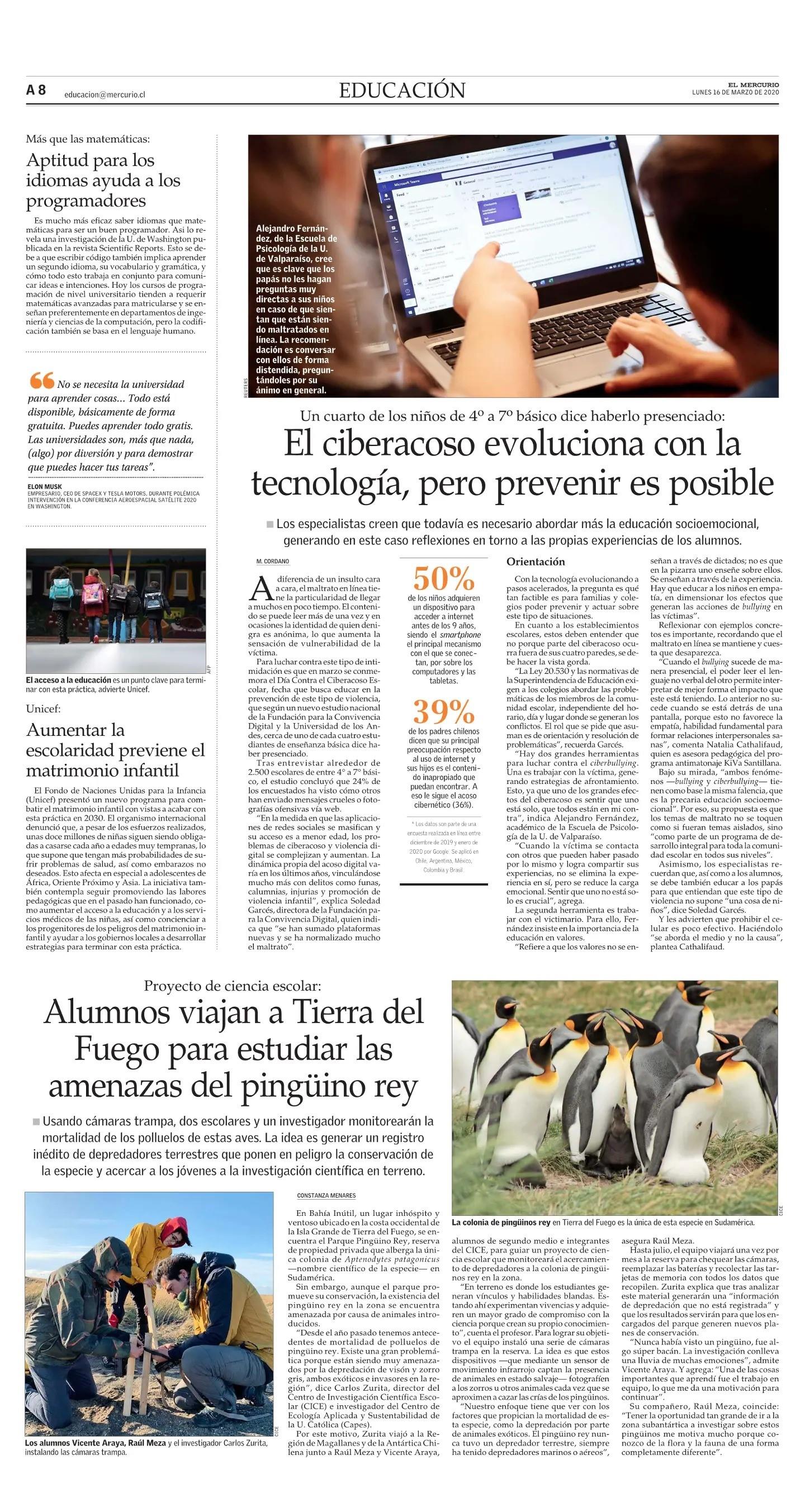 Alumnos viajan a Tierra del Fuego para estudiar las amenazas del pingüino rey 16-03-2020 El Mercurio |