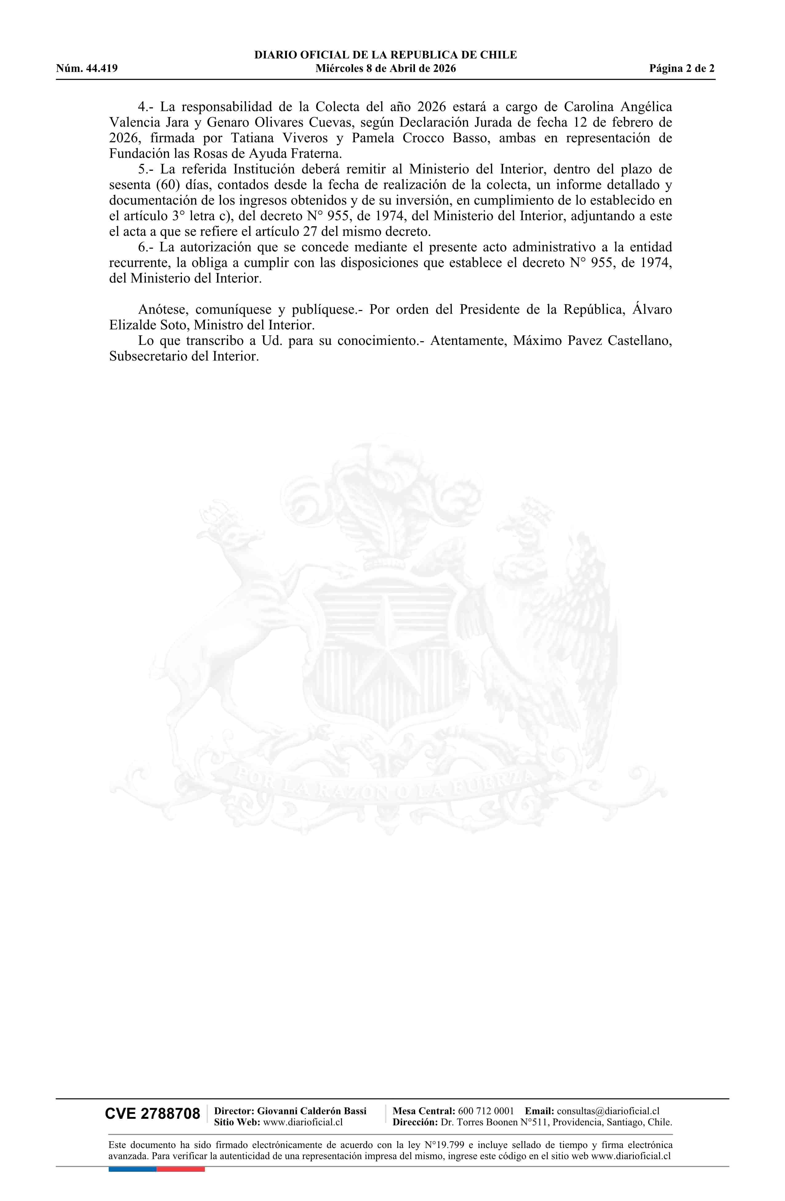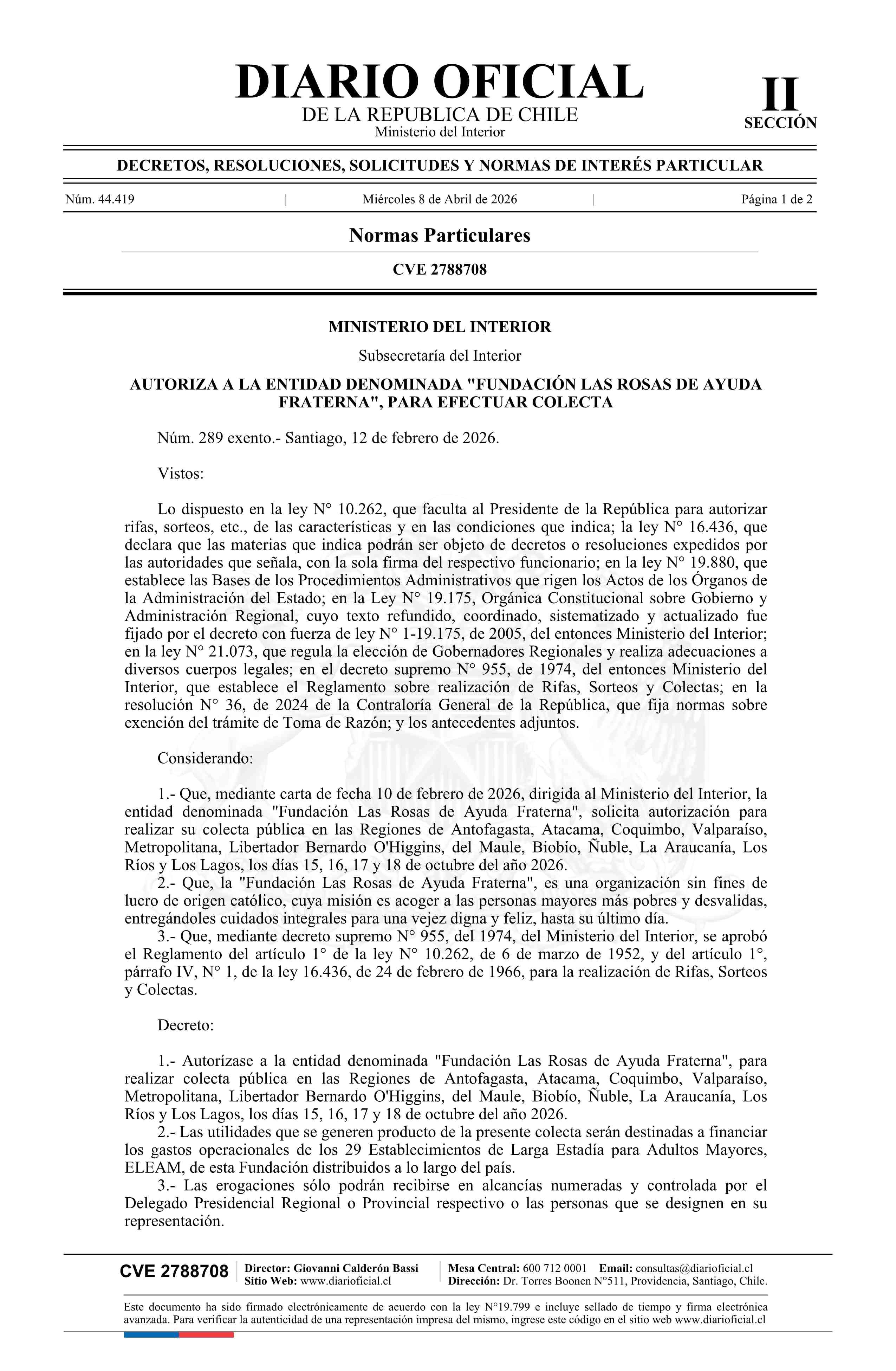 Decreto exento número 289, de 2026.- Autoriza a la entidad denominada Fundación Las Rosas de Ayuda Fraterna para efectuar colecta 08-04-2026 Diario Oficial Edición Electrónica |