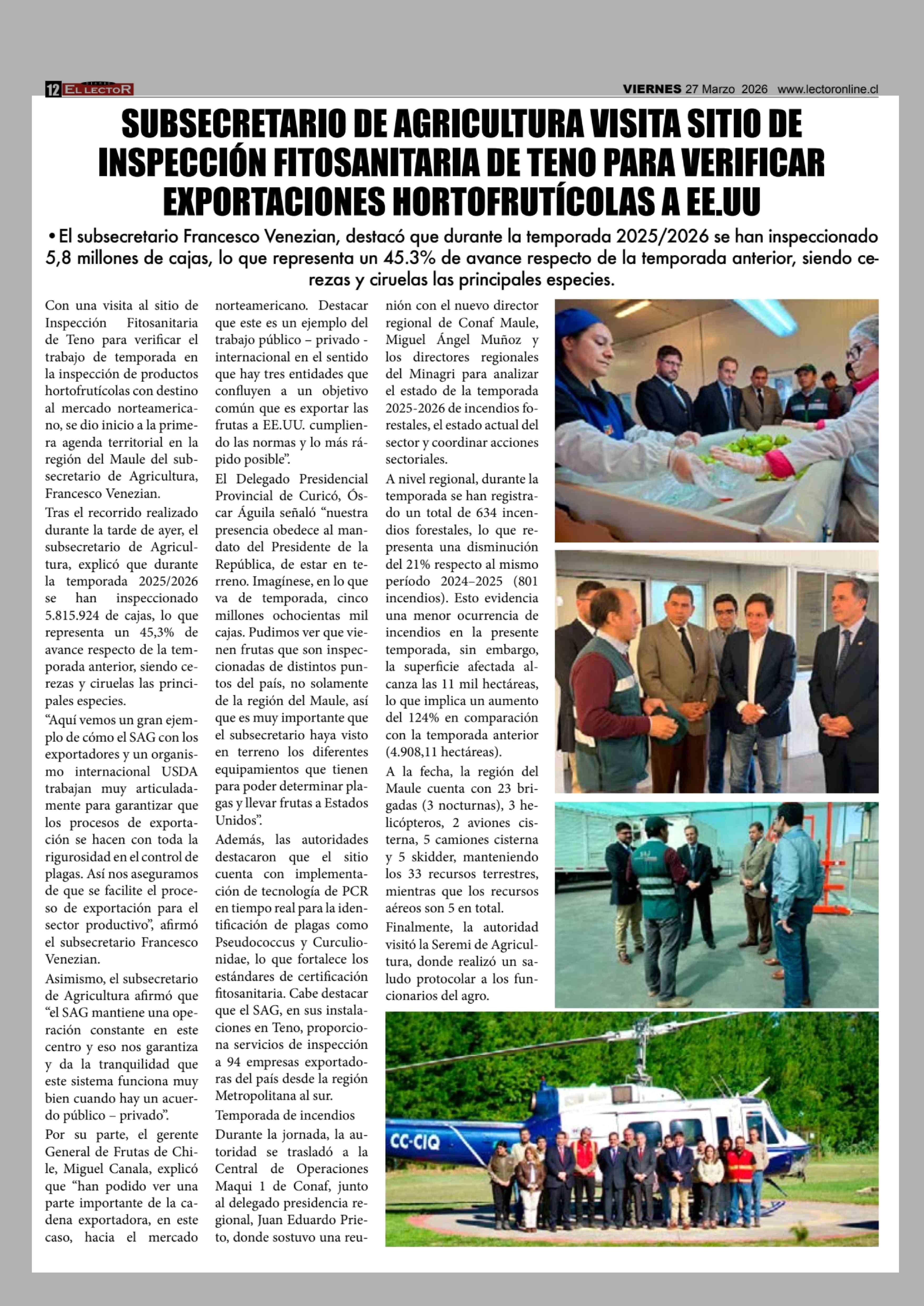 SUBSECRETARIO DE AGRICULTURA VISITA SITIO DE INSPECCIÓN FITOSANITARIA DE TENO PARA VERIFICAR EXPORTACIONES HORTOFRUTÍCOLAS A EE.UU 27-03-2026 El Lector |