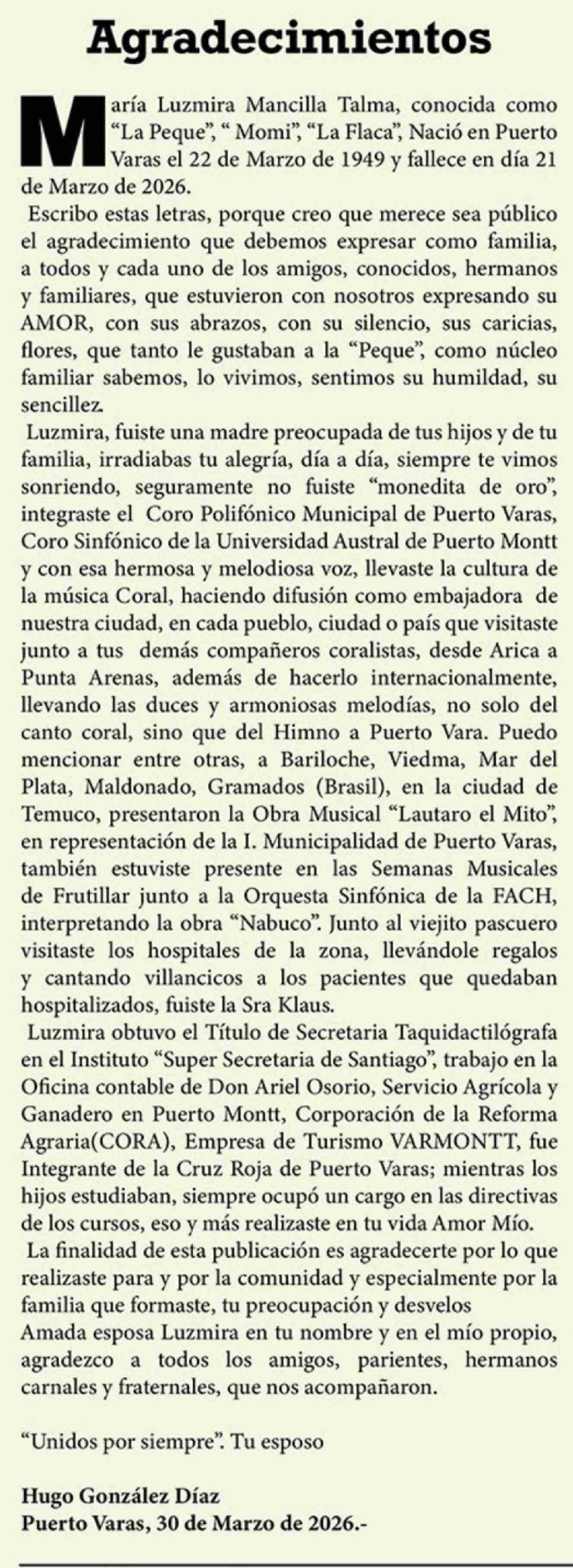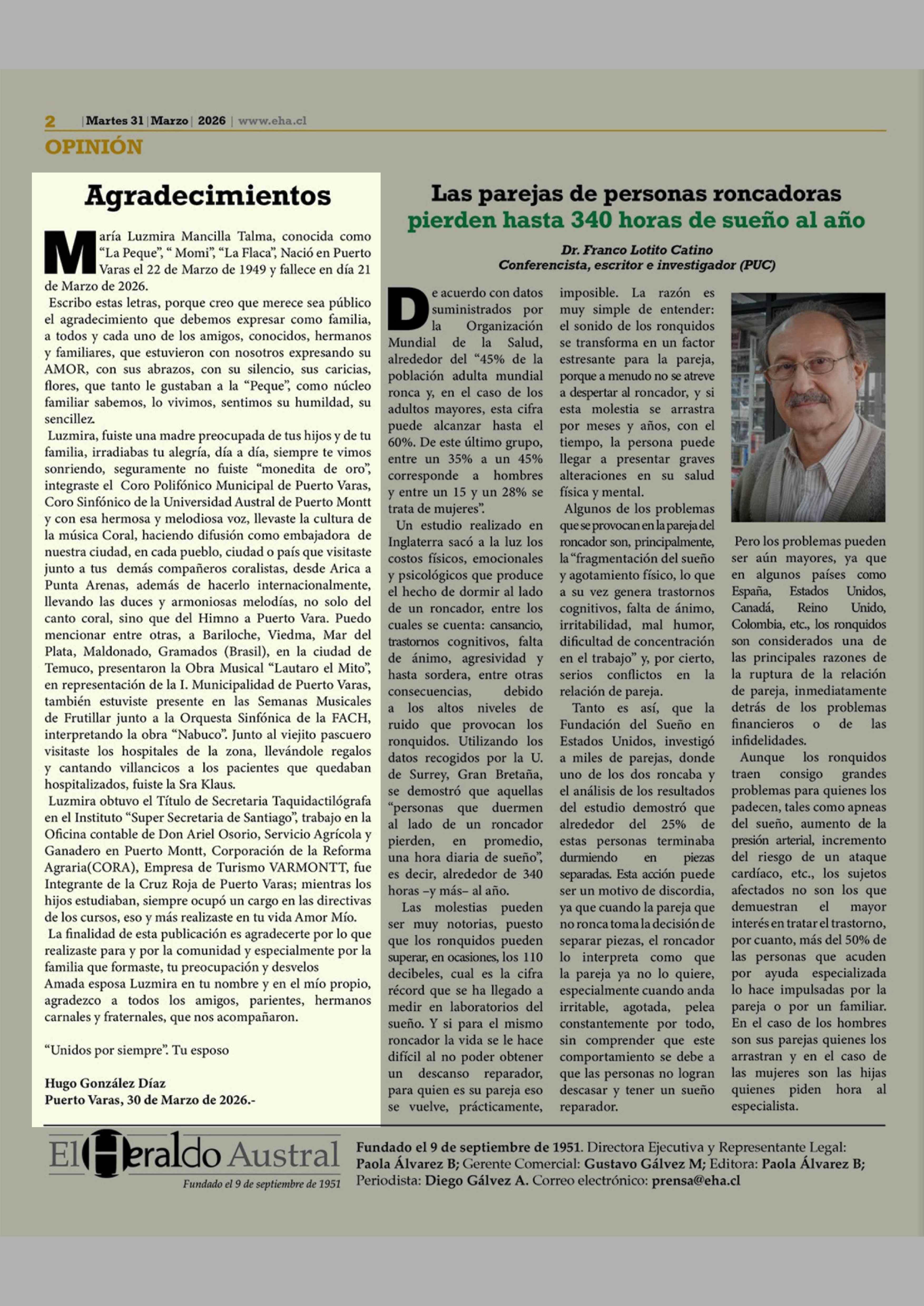 Columnas de Opinión: Agradecimientos 31-03-2026 El Heraldo Austral |