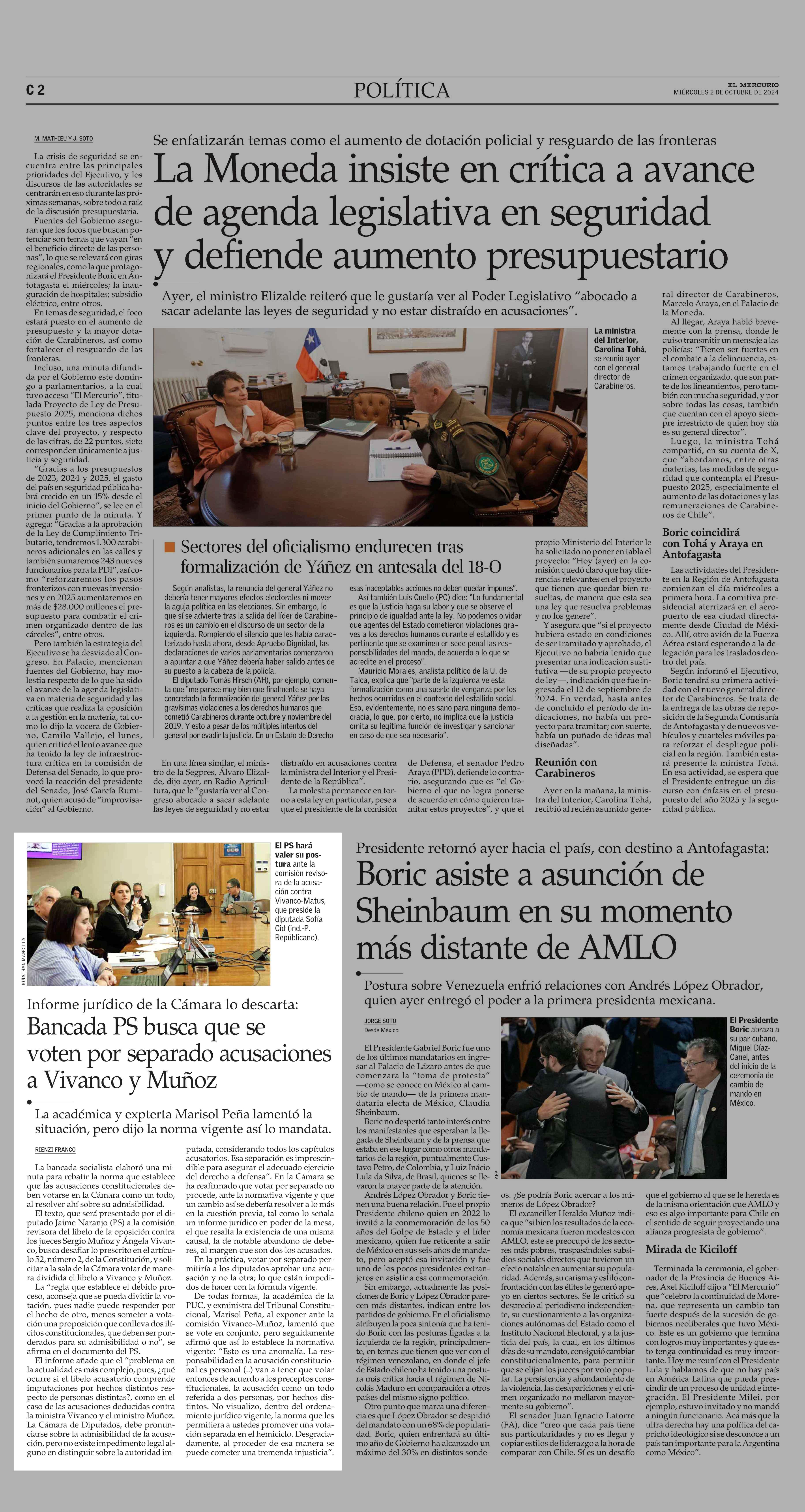 Bancada PS busca que se voten por separado acusaciones a Vivanco y Muñoz 02-10-2024 El Mercurio |