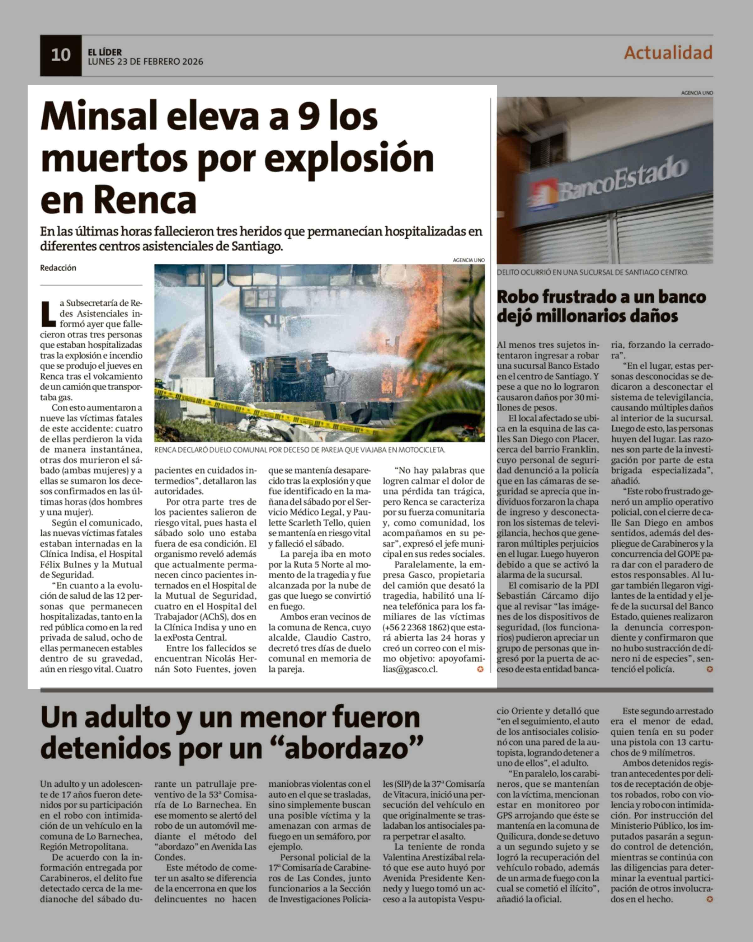 Minsal eleva a 9 los muertos por explosión en Renca 23-02-2026 El Líder |