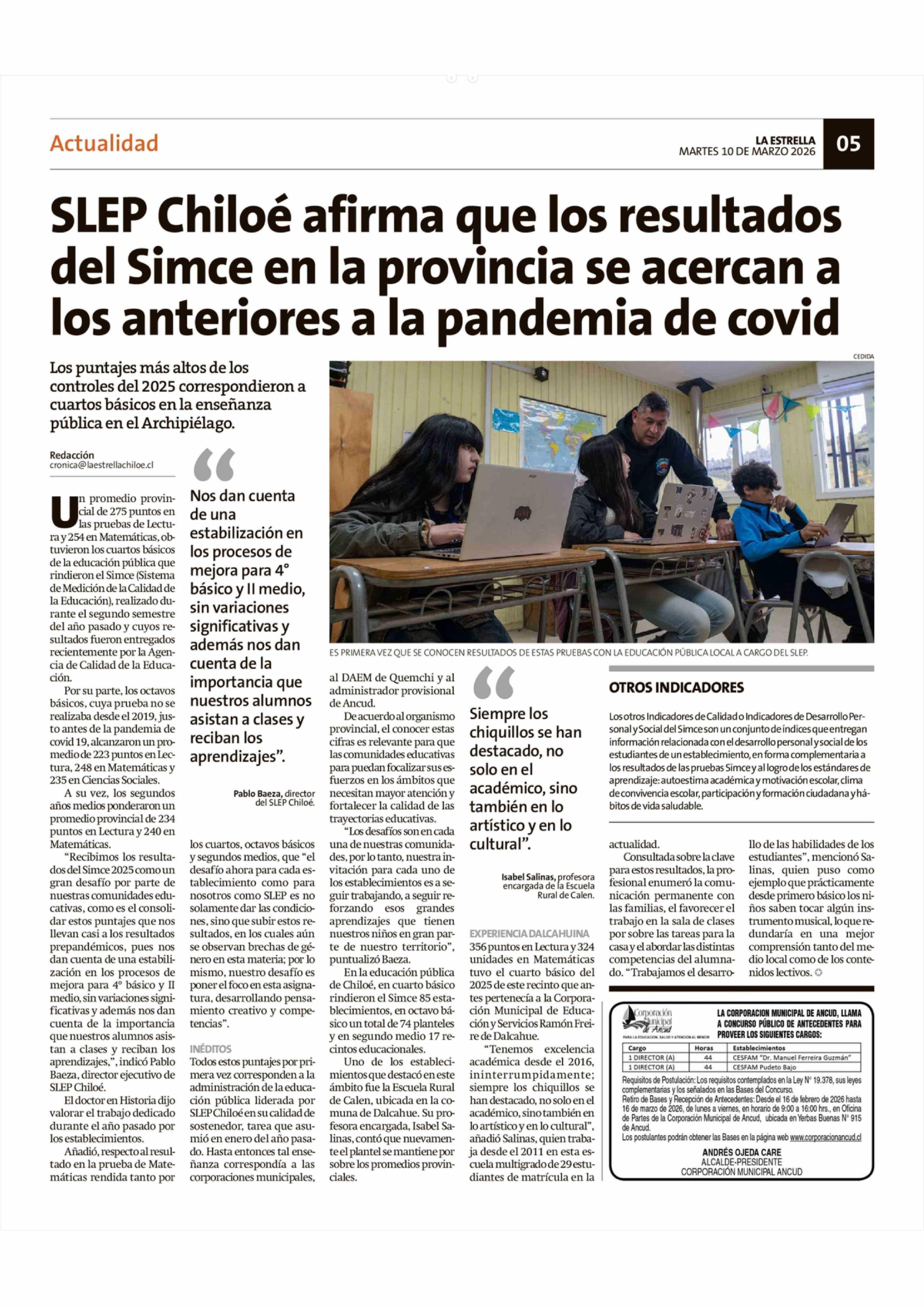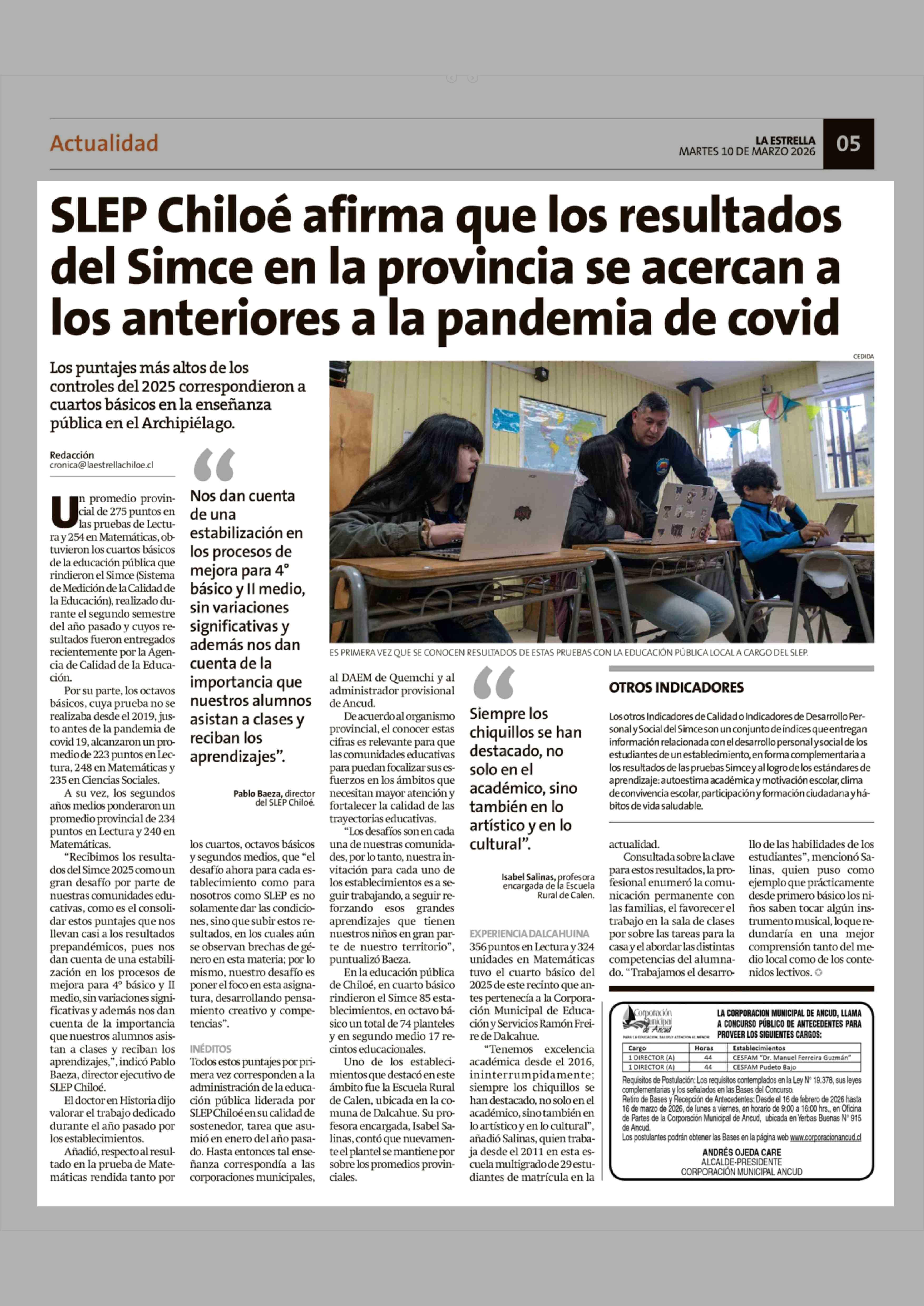 SLEP Chiloé afirma que los resultados del Simce en la provincia se acercan a los anteriores a la pandemia de covid 10-03-2026 La Estrella de Chiloé |