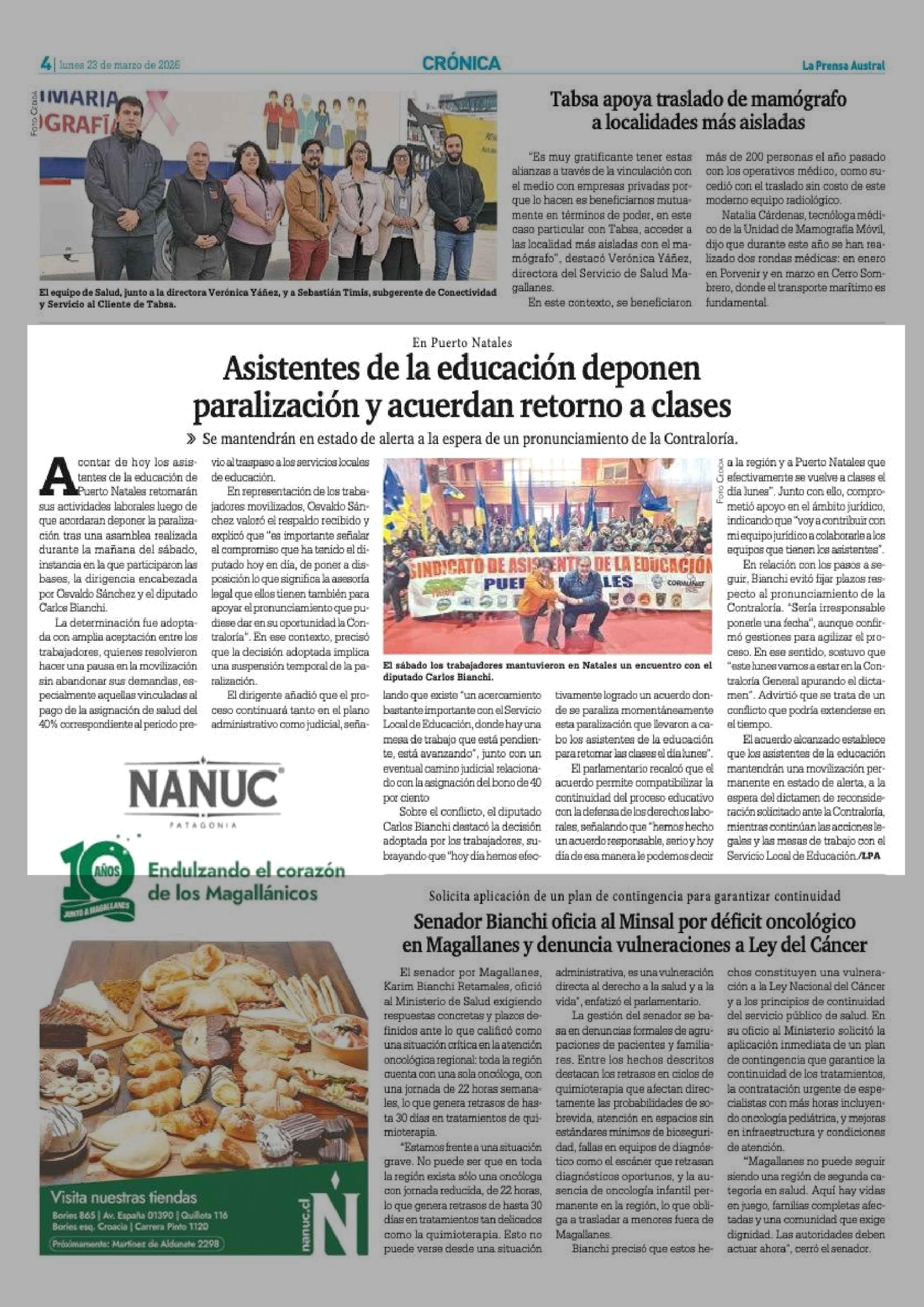 Asistentes de la educación deponen paralización y acuerdan retorno a clases 23-03-2026 La Prensa Austral |