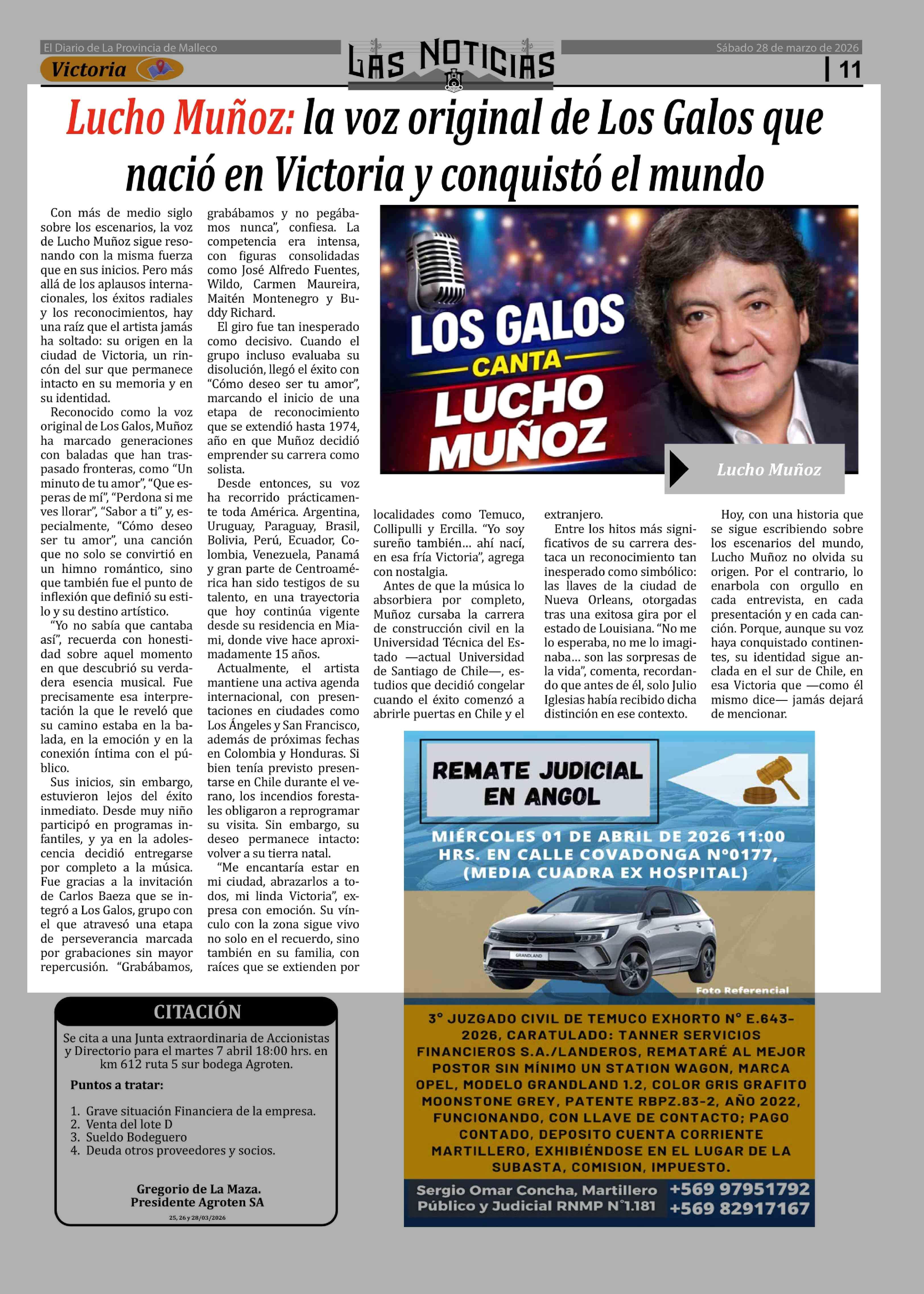 Lucho Muñoz: la voz original de Los Galos que nació en Victoria y conquistó el mundo 28-03-2026 Las Noticias |