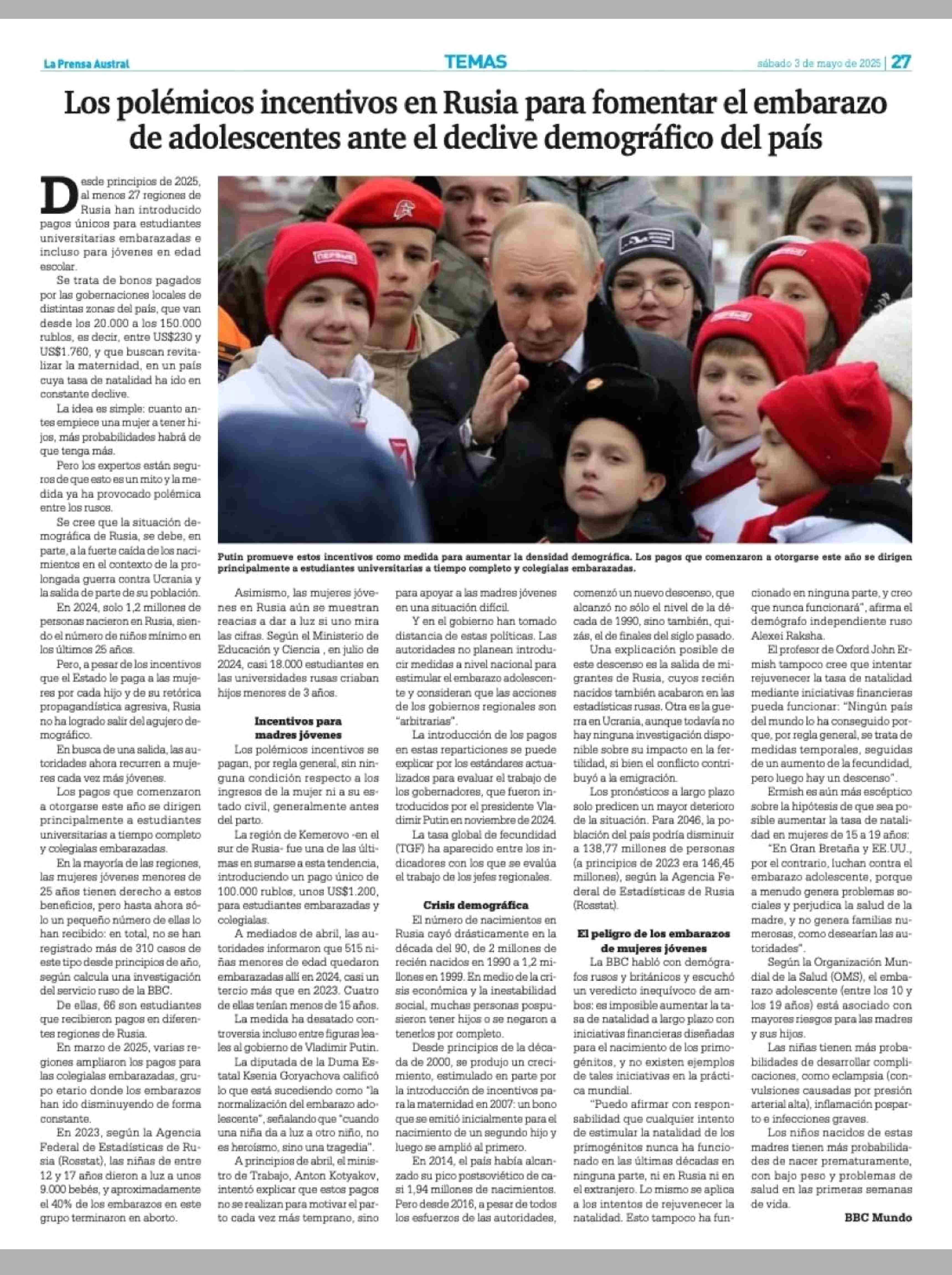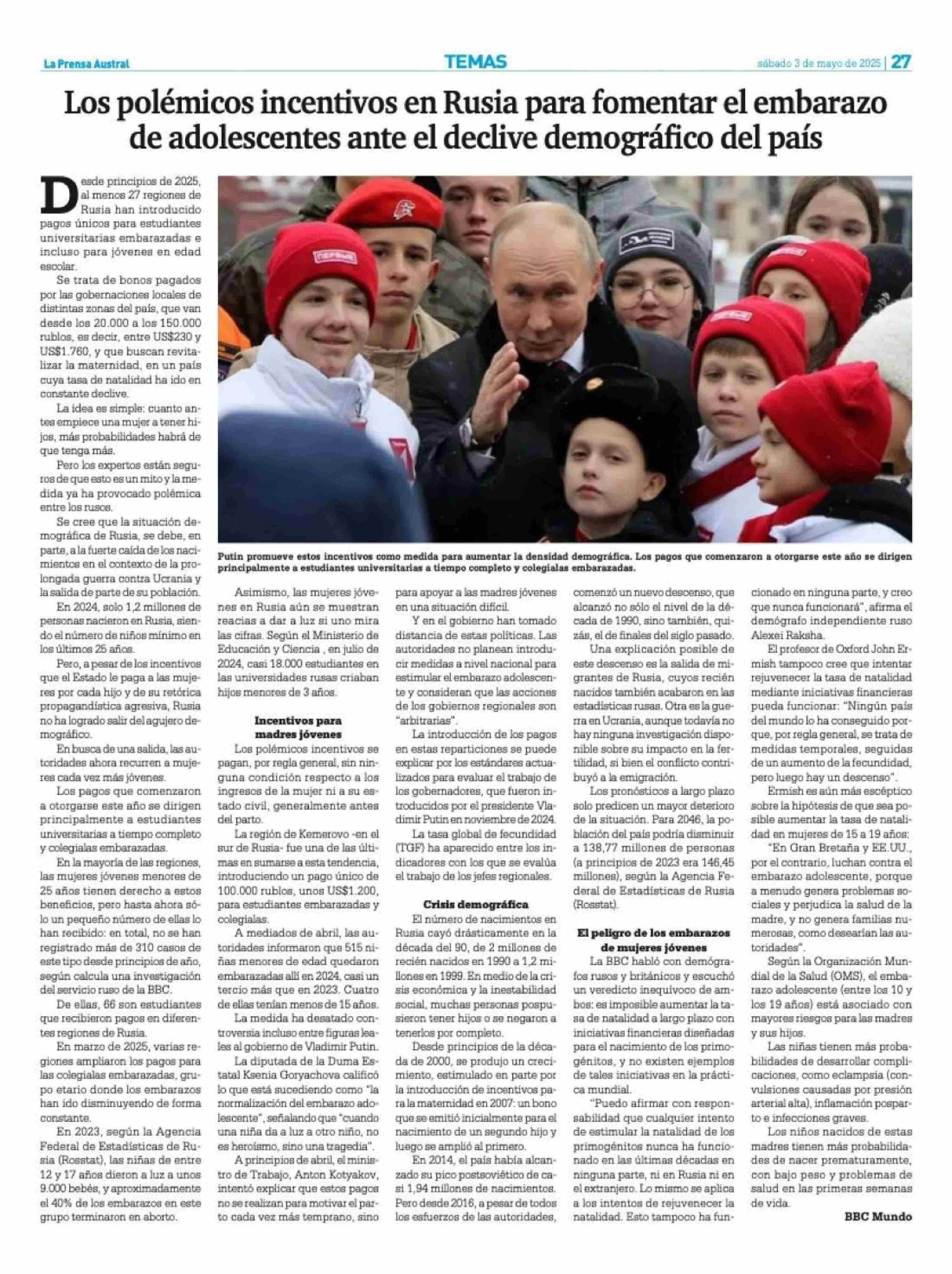 Los polémicos incentivos en Rusia para fomentar el embarazo de adolescentes ante el declive demográfico del país 03-05-2025 La Prensa Austral |