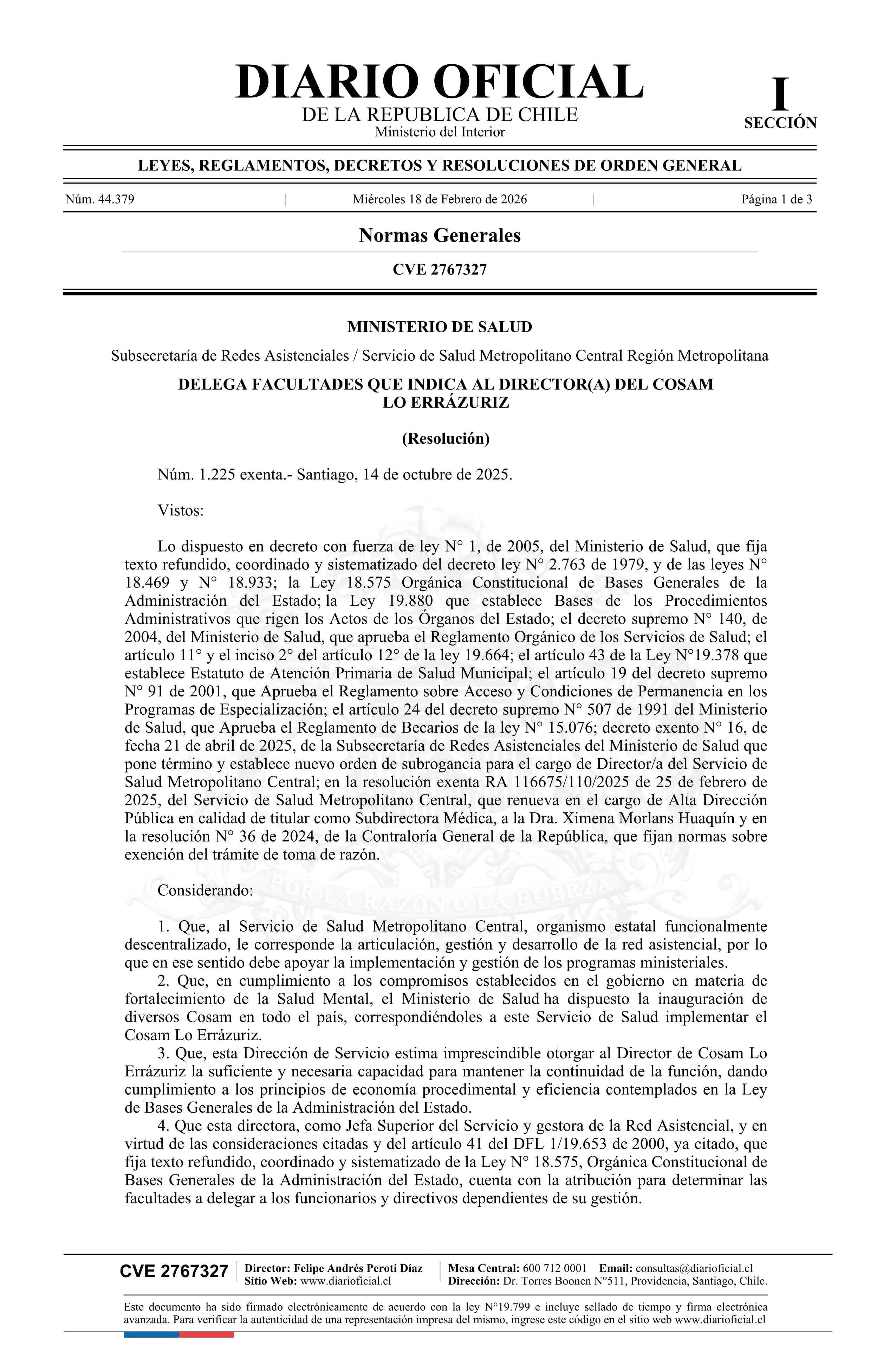 Título: Resolución exenta número 1.225, de 2025.- Delega facultades que indica al Director(a) del Cosam Lo Errázuriz