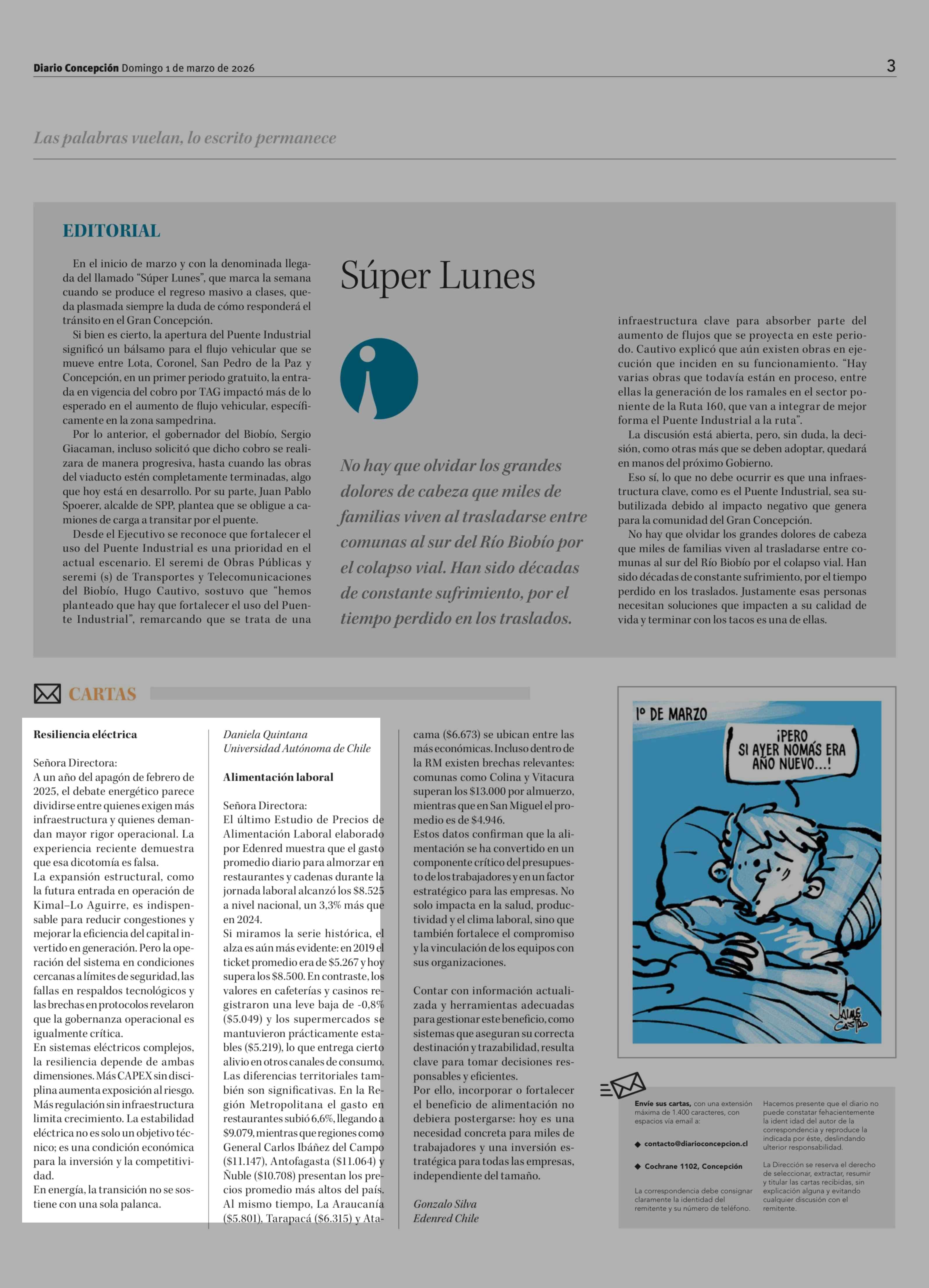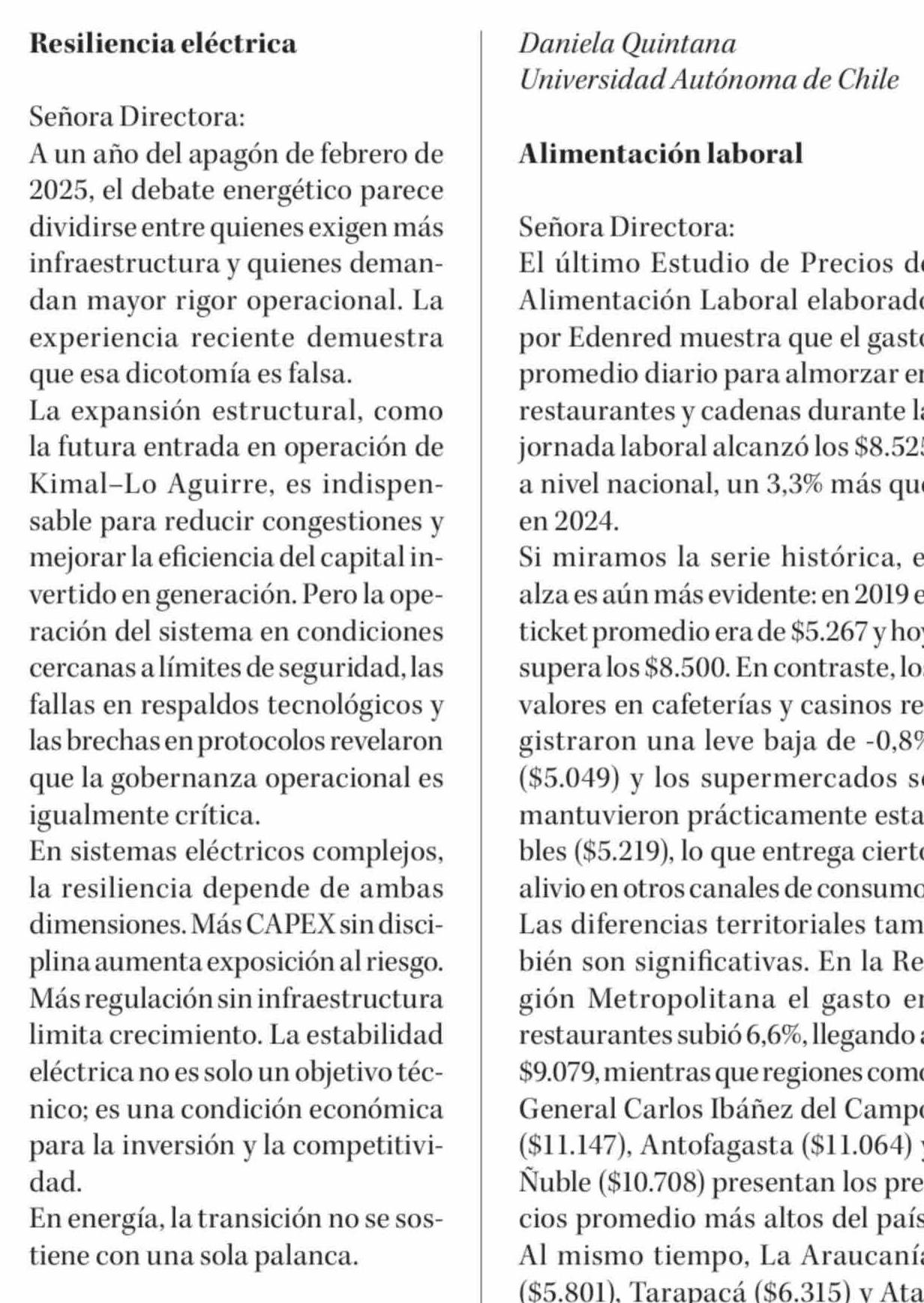 Cartas: Resiliencia eléctrica 01-03-2026 Diario Concepción |