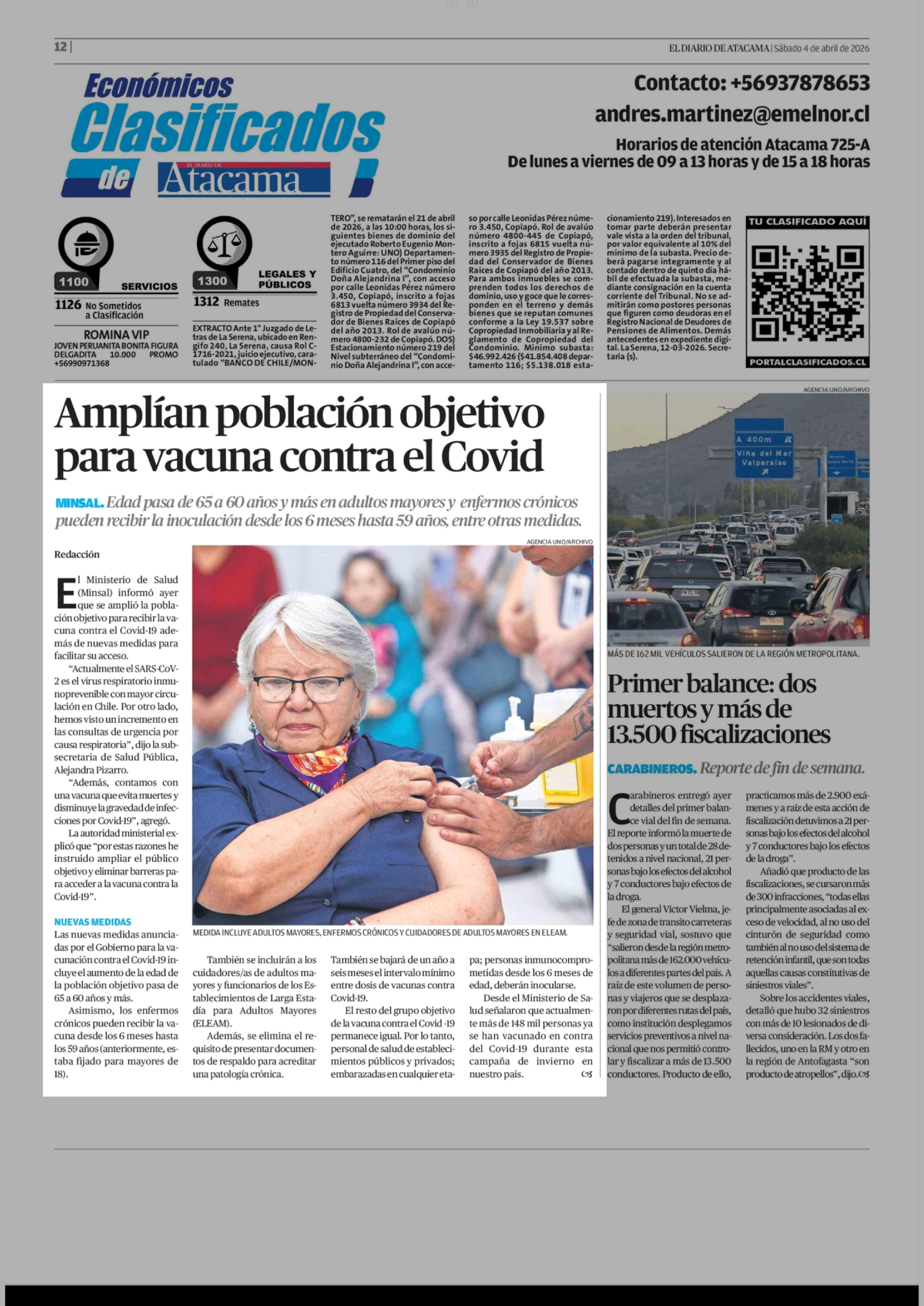 Amplían población objetivo para vacuna contra el Covid 04-04-2026 El Diario de Atacama |
