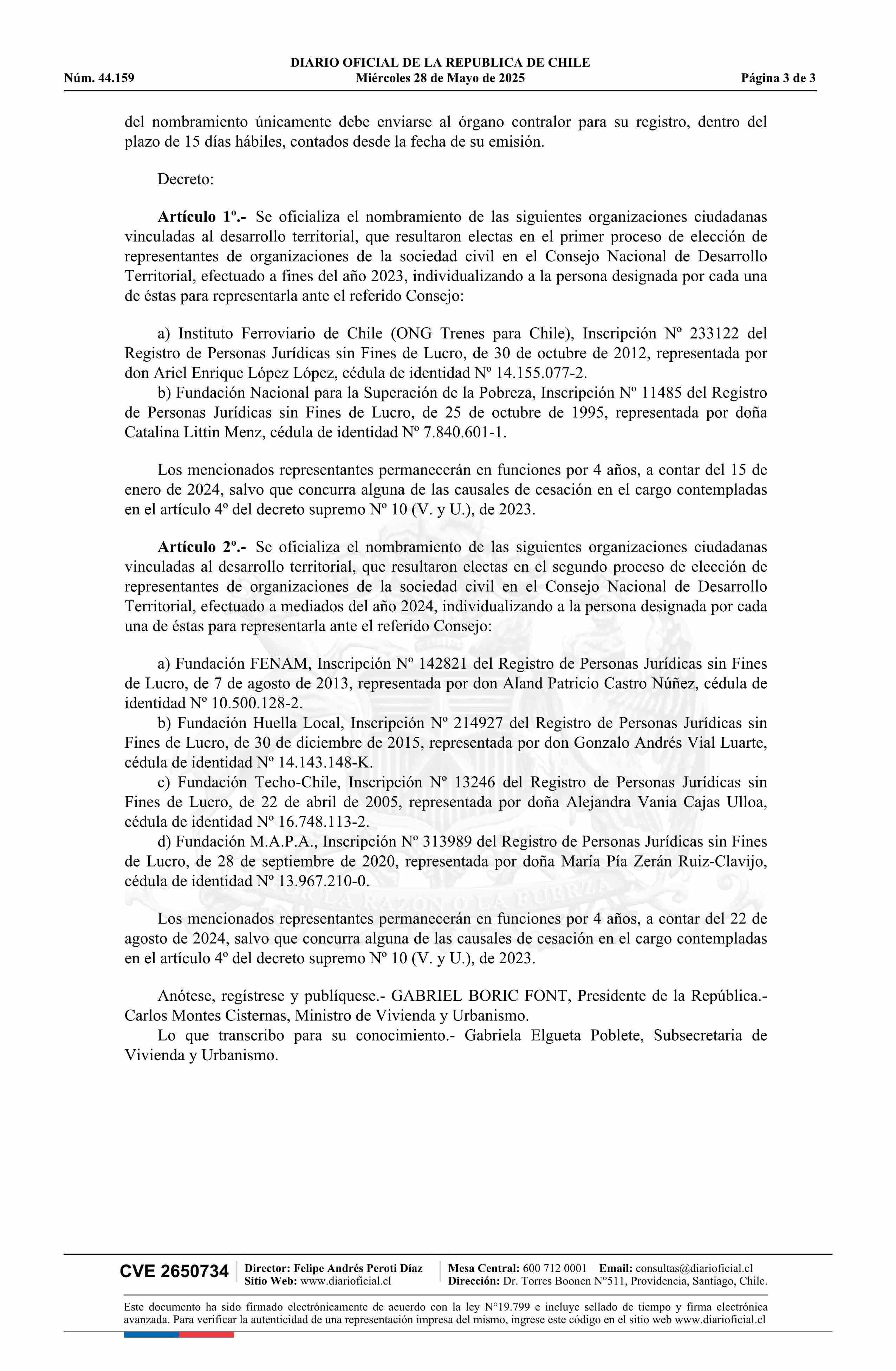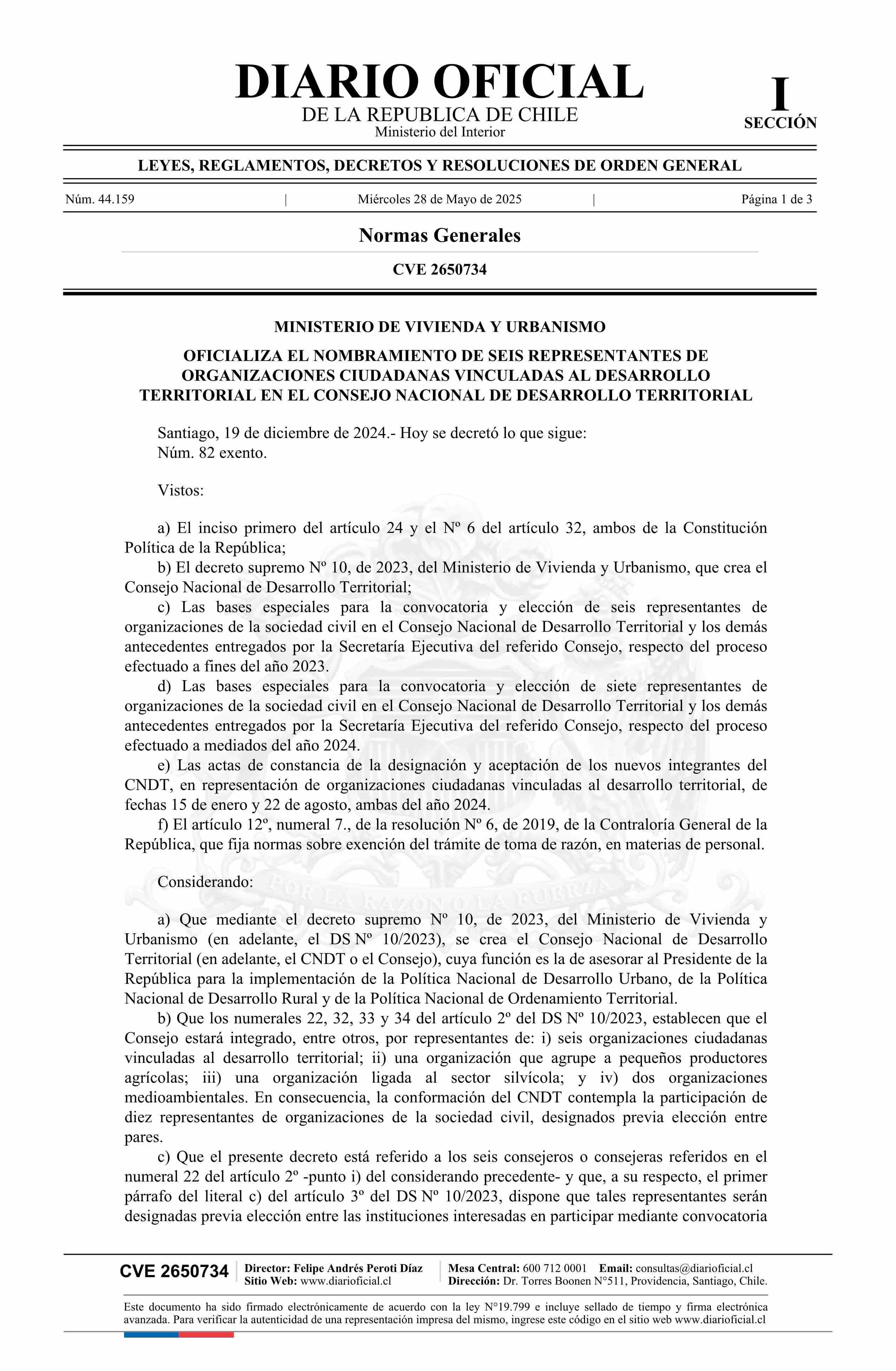 | Título: | Decreto exento número 82, de 2024.- Oficializa el nombramiento de seis representantes de organizaciones ciudadanas vinculadas al desarrollo territorial en el Consejo Nacional de Desarrollo Territorial |