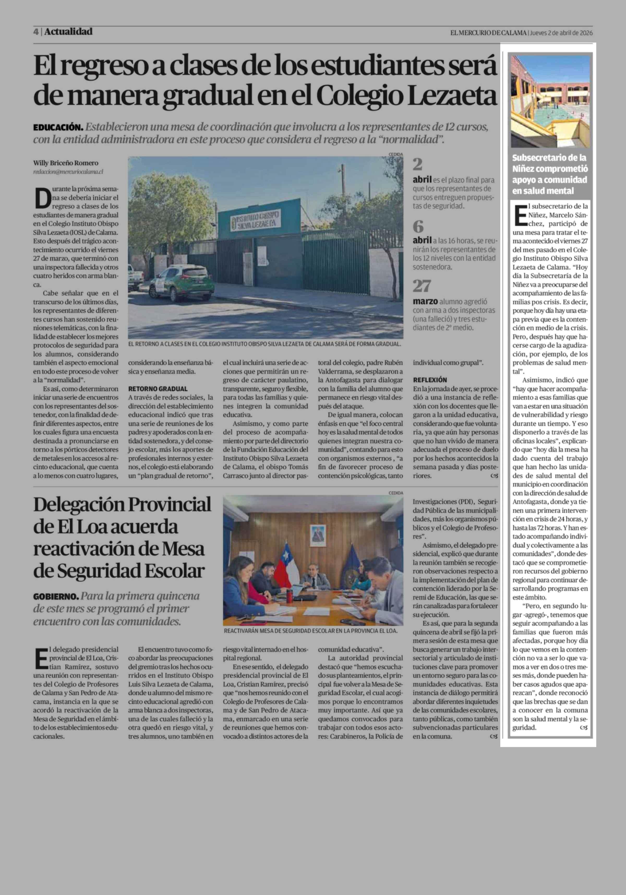 Subsecretario de la Niñez comprometió apoyo a comunidad en salud mental 02-04-2026 El Mercurio de Calama |