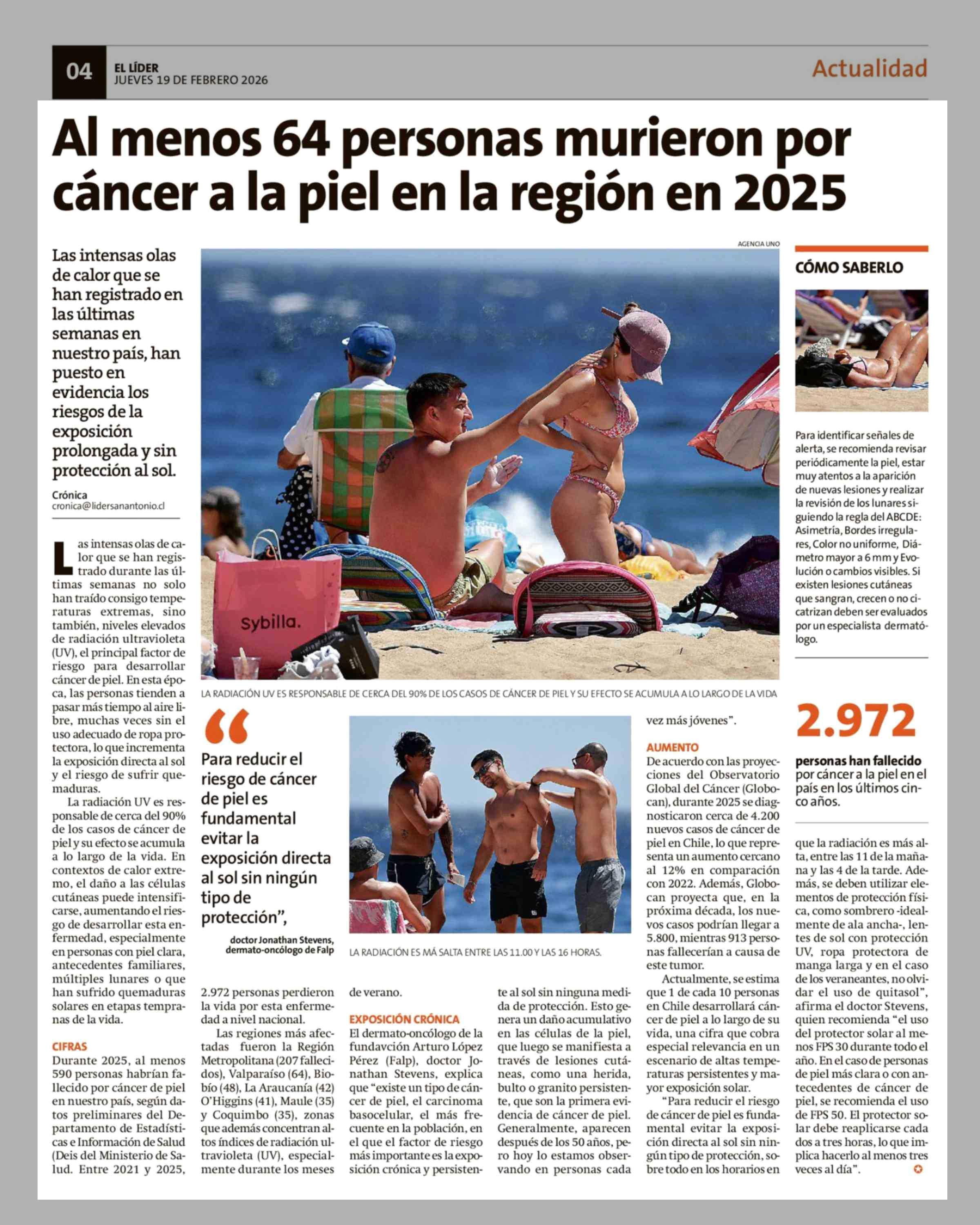 Al menos 64 personas murieron por cáncer a la piel en la región en 2025 19-02-2026 El Líder |