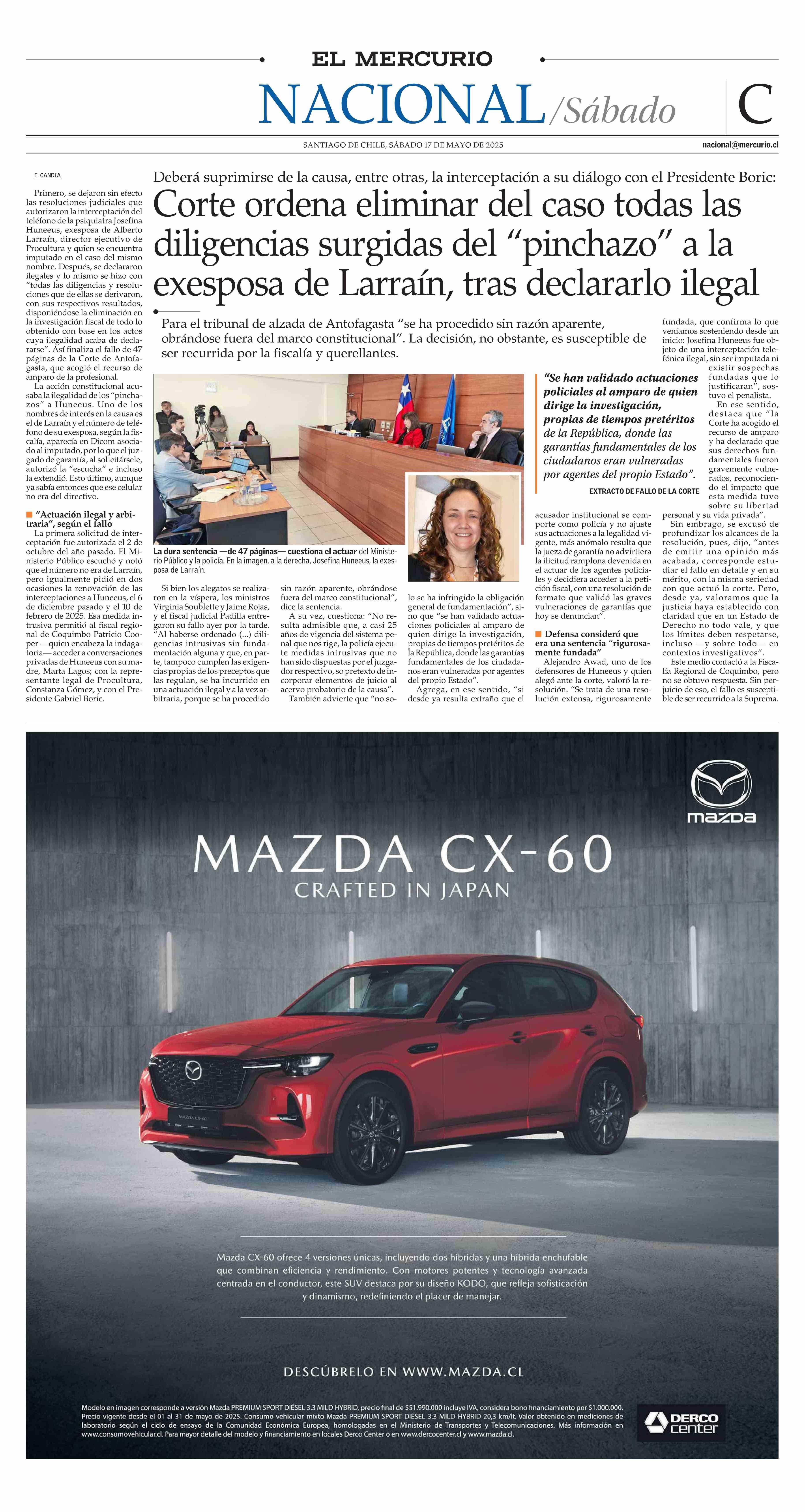 Corte ordena eliminar del caso todas las diligencias surgidas del “pinchazo” a la exesposa de Larraín, tras declararlo ilegal 17-05-2025 El Mercurio |