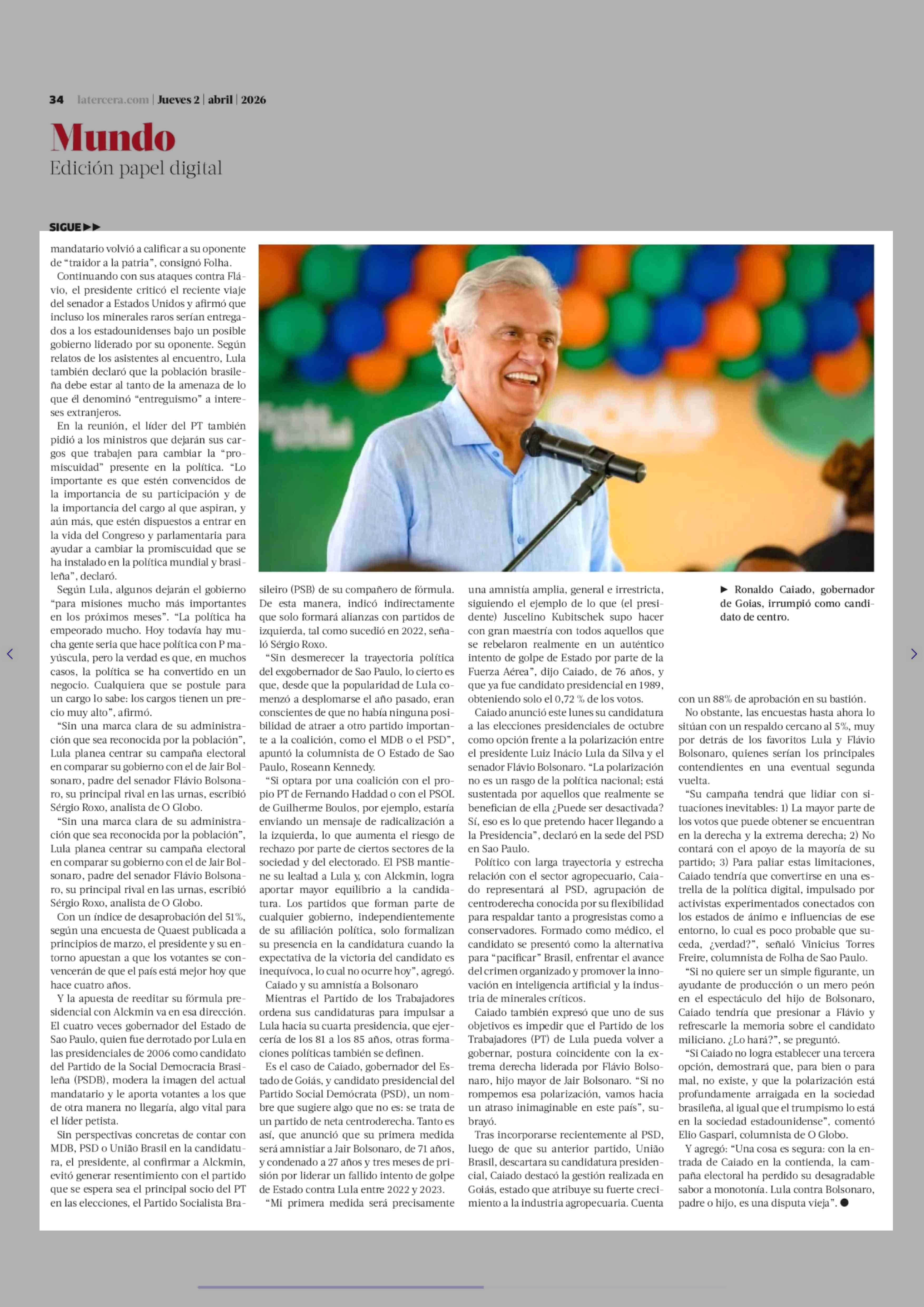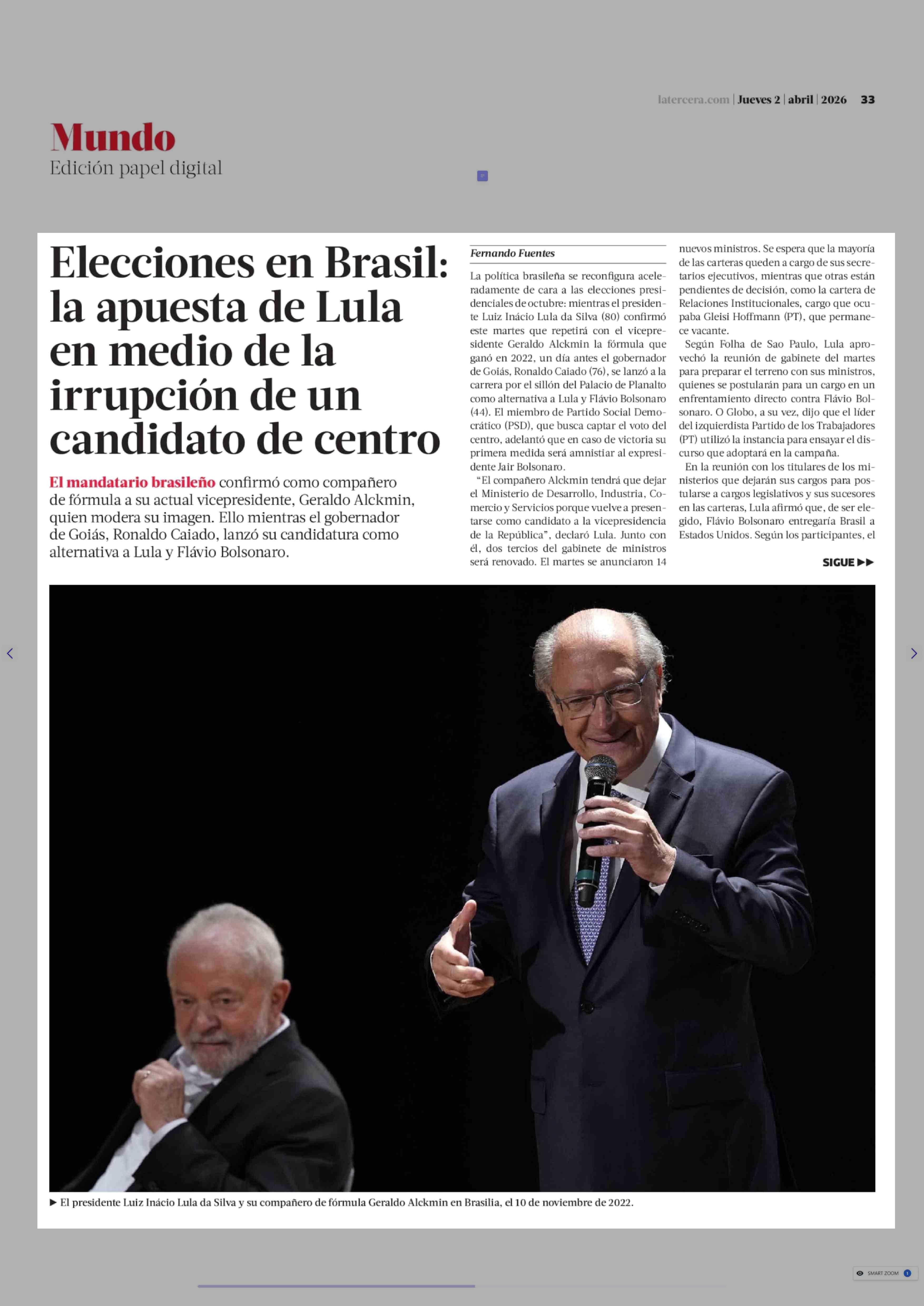 Elecciones en Brasil: la apuesta de Lula en medio de la irrupción de un candidato de centro 02-04-2026 La Tercera |