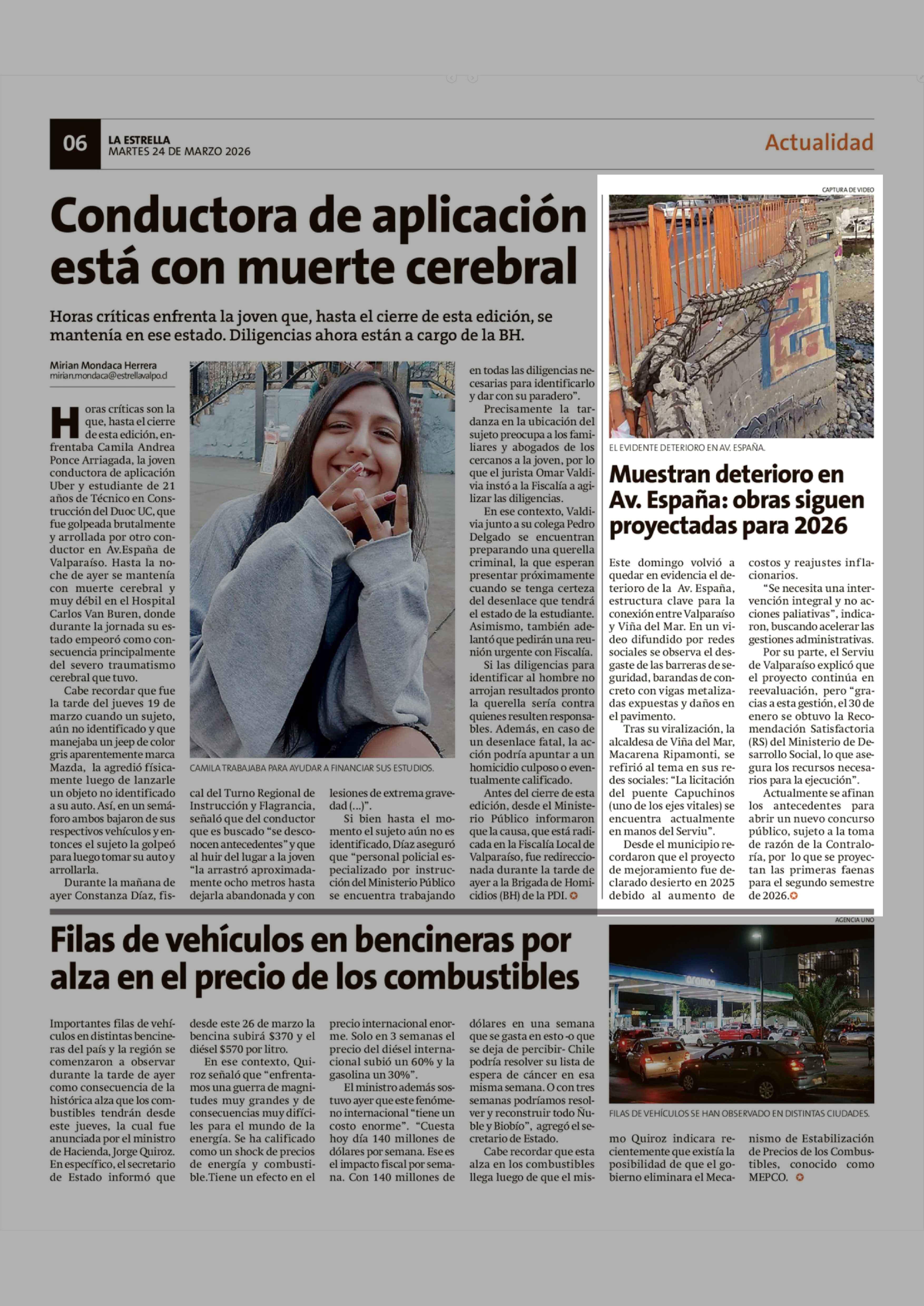 Muestran deterioro en Av. España: obras siguen proyectadas para 2026 24-03-2026 La Estrella de Valparaíso |