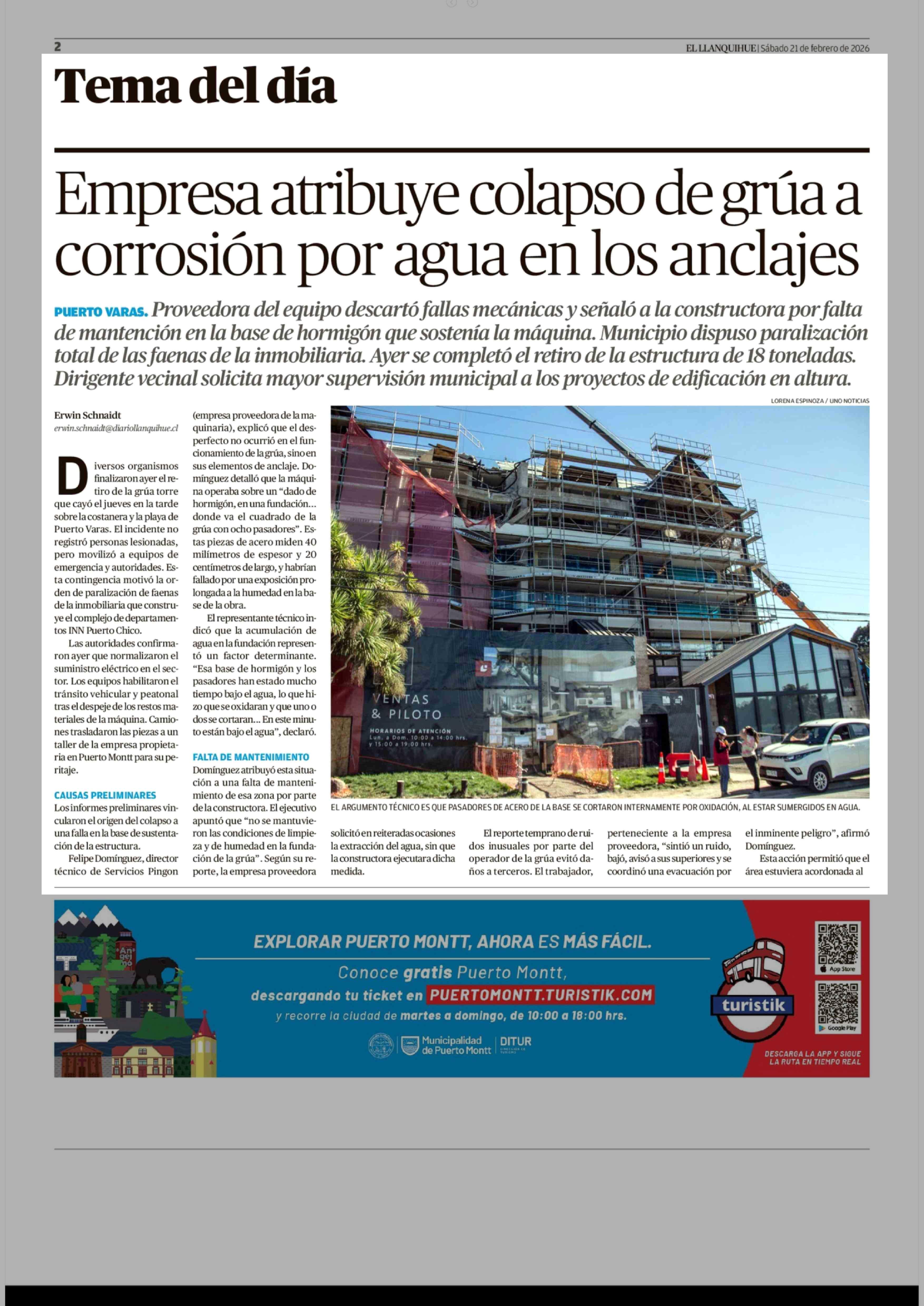 Título: Empresa atribuye colapso de grúa a corrosión por agua en los anclajes
