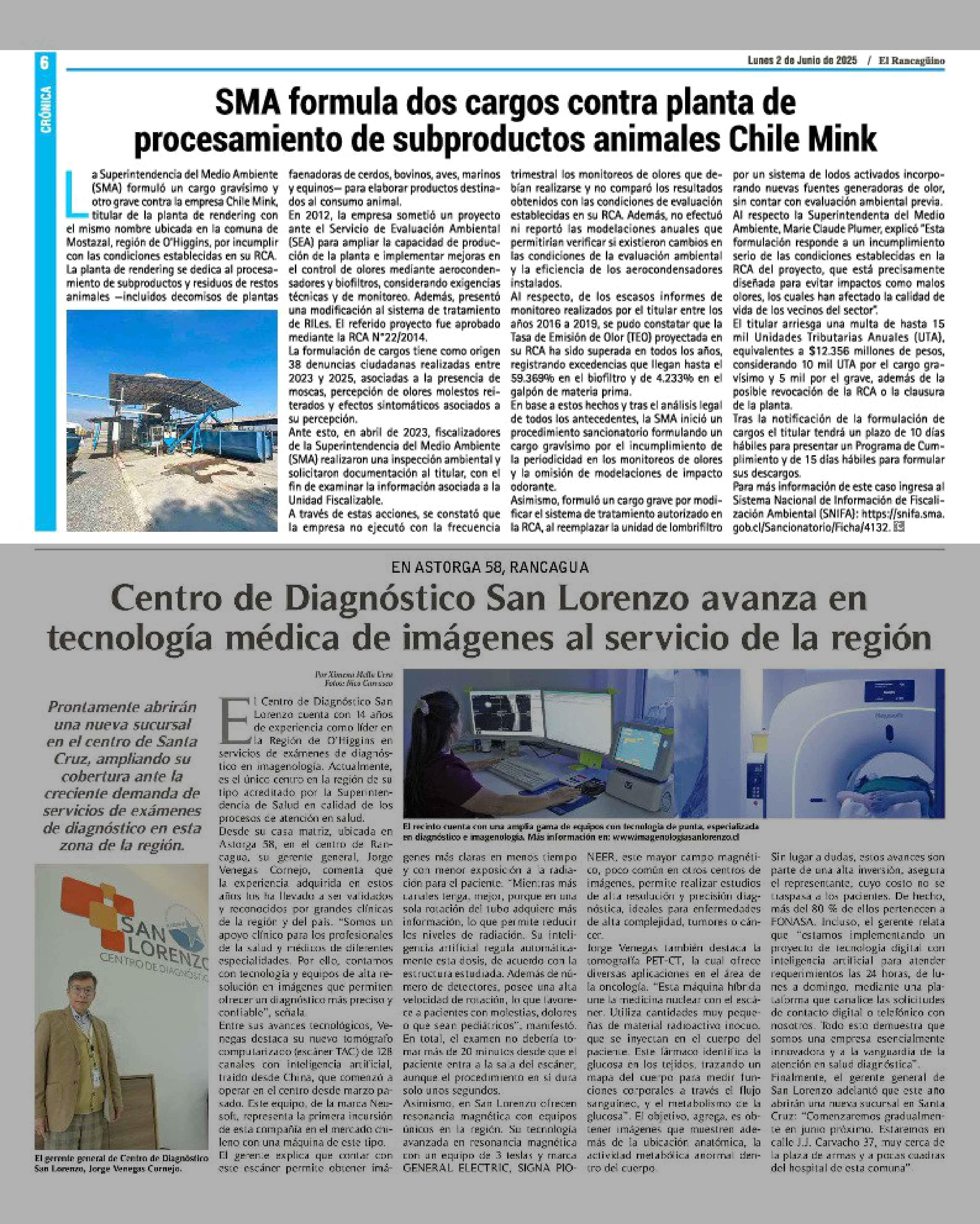 SMA formula dos cargos contra planta de procesamiento de subproductos animales Chile Mink 02-06-2025 El Rancagüino |