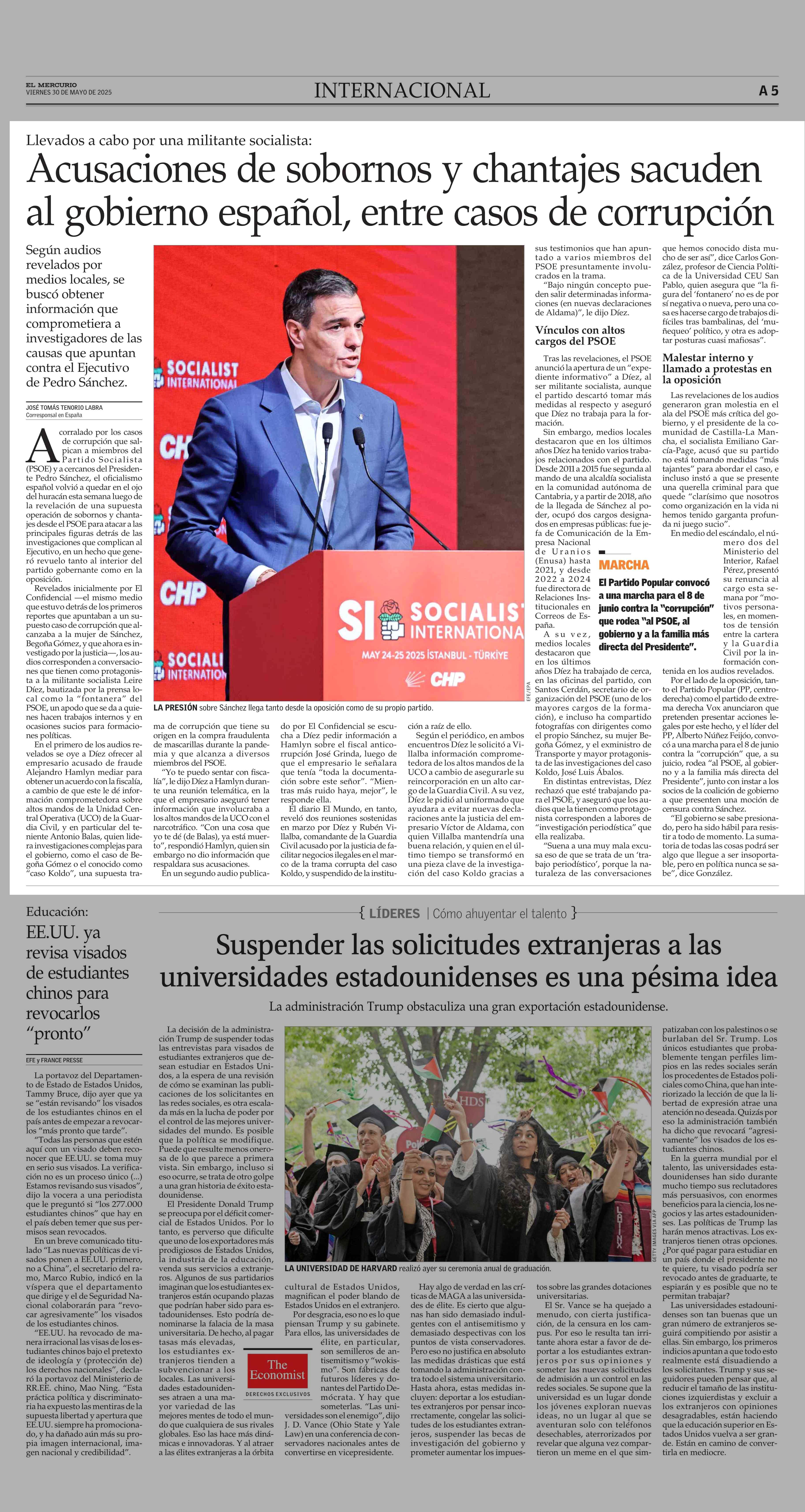 Acusaciones de sobornos y chantajes sacuden al gobierno español, entre casos de corrupción 30-05-2025 El Mercurio |