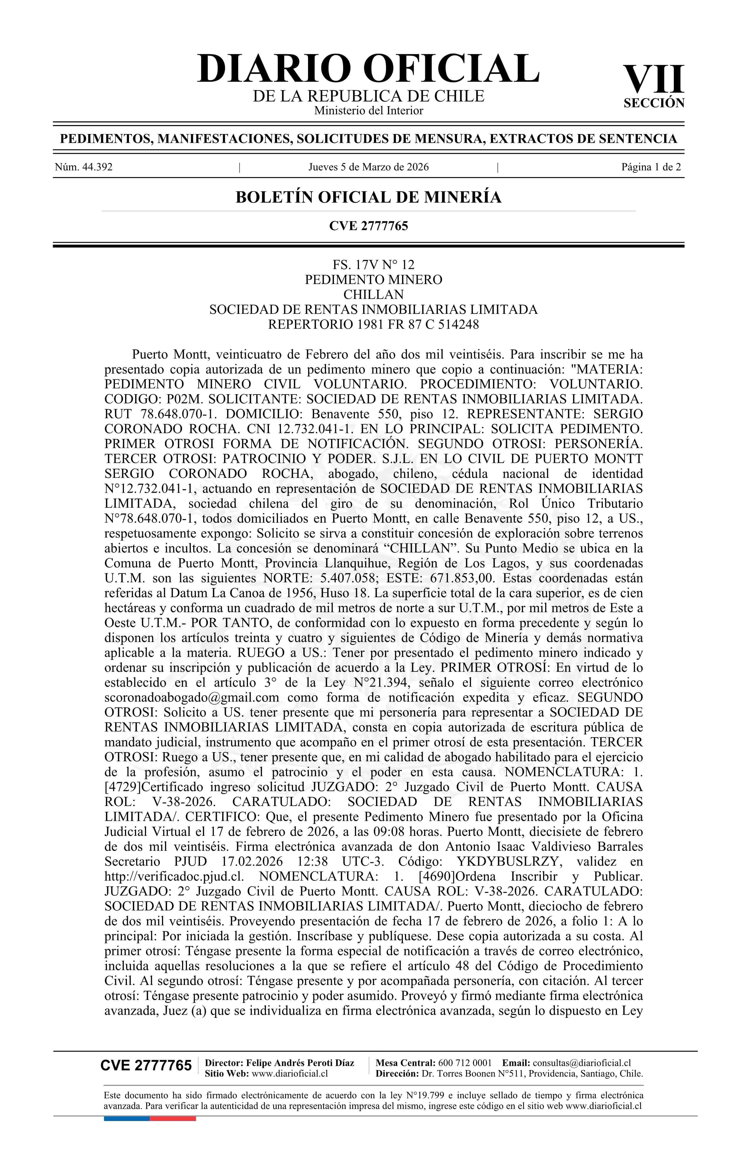 CHILLAN / Sociedad de Rentas Inmobiliarias Limitada 05-03-2026 DIARIO OFICIAL CHILE - BOLETÍN OFICIAL DE MINERÍA |