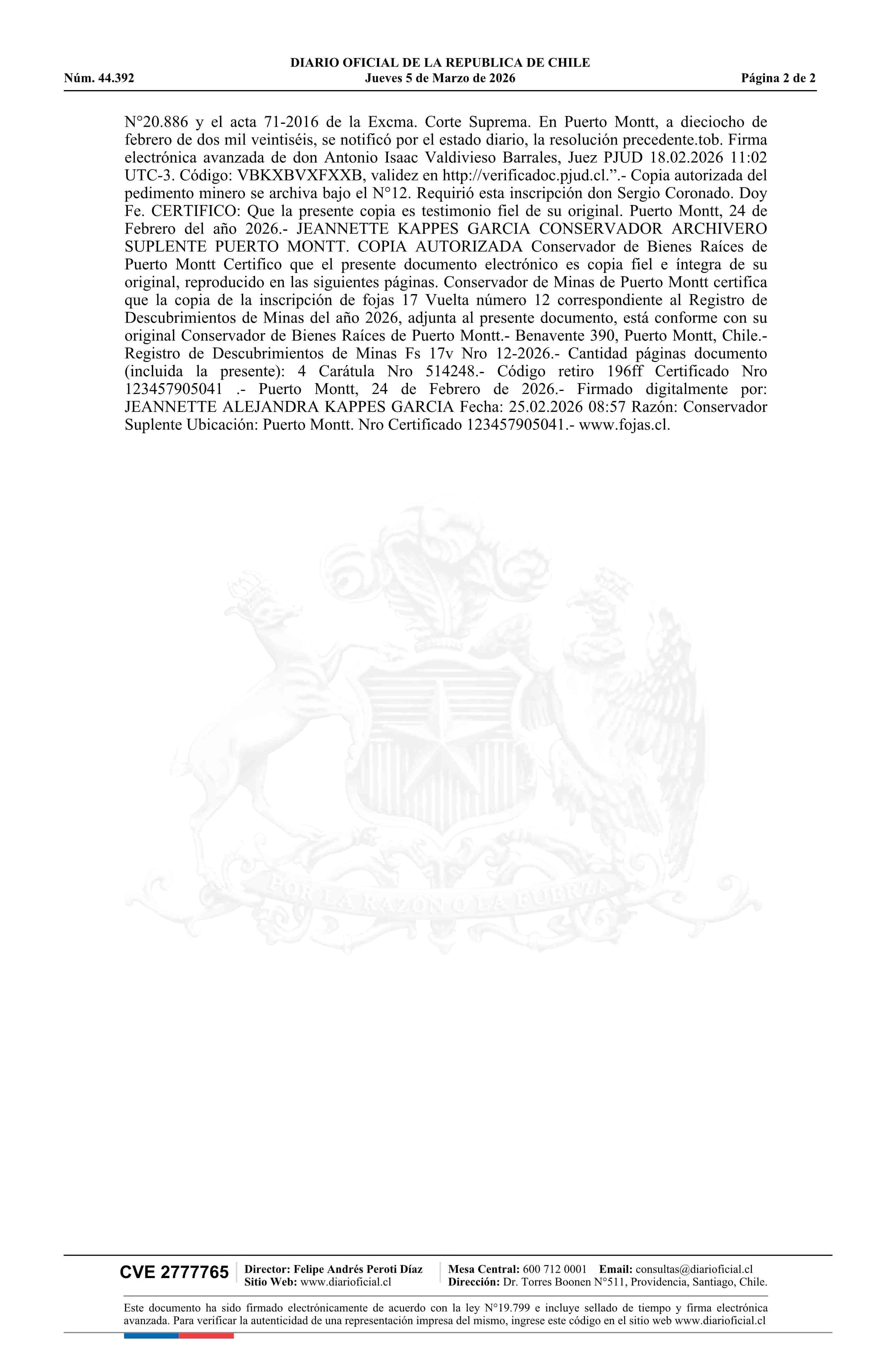 | Fuente: | DIARIO OFICIAL CHILE - BOLETÍN OFICIAL DE MINERÍA (DIARIO OFICIAL CHILE – BOM – PEDIMENTOS MINEROS) | Página(s): | 5-6 |