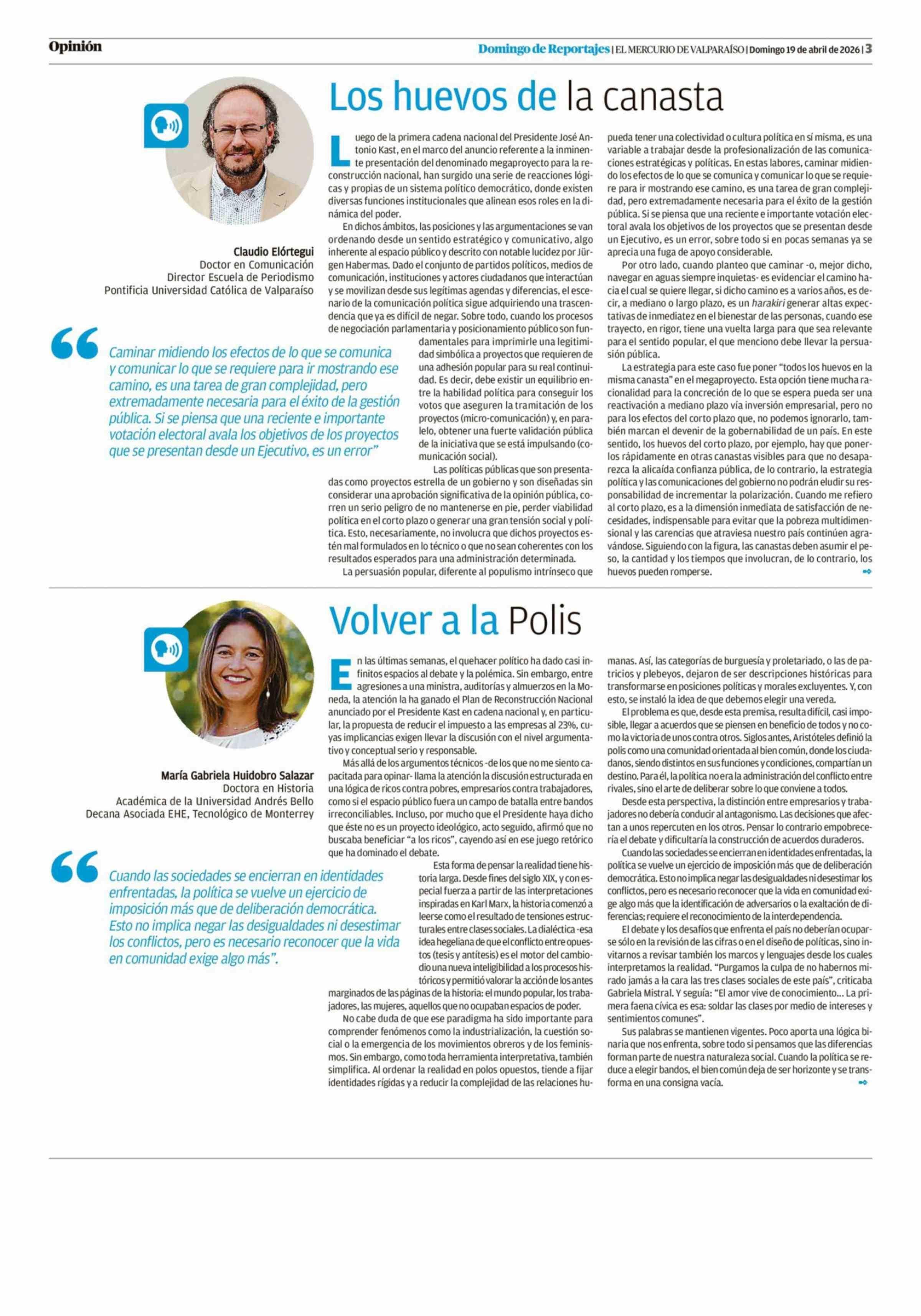 Columnas de Opinión: Los huevos de la canasta 19-04-2026 El Mercurio de Valparaíso |