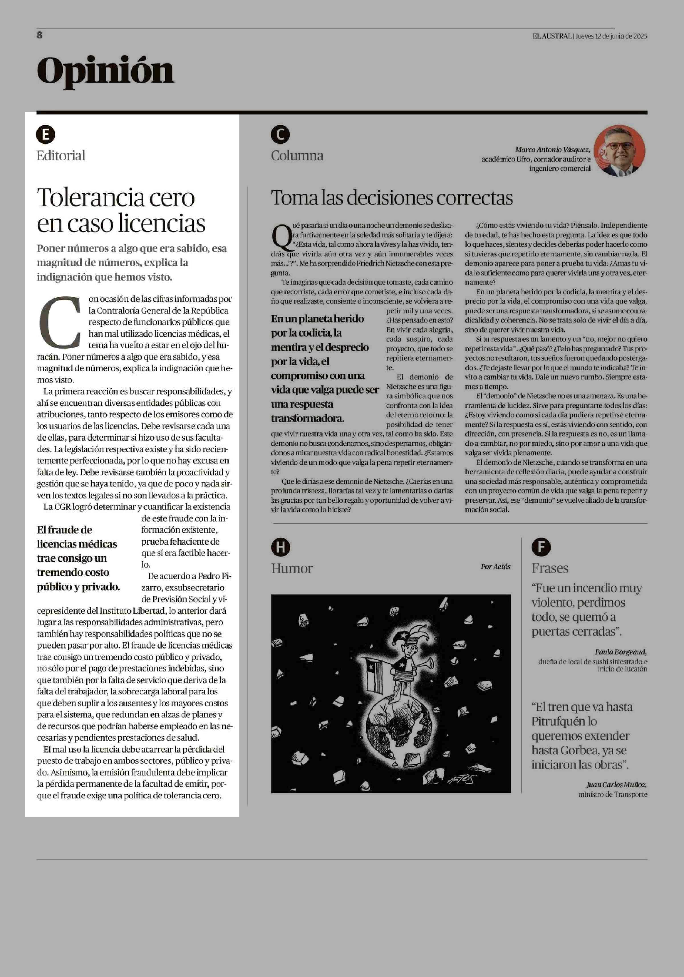 Editorial: Tolerancia cero en caso licencias 12-06-2025 El Austral de la Araucanía |