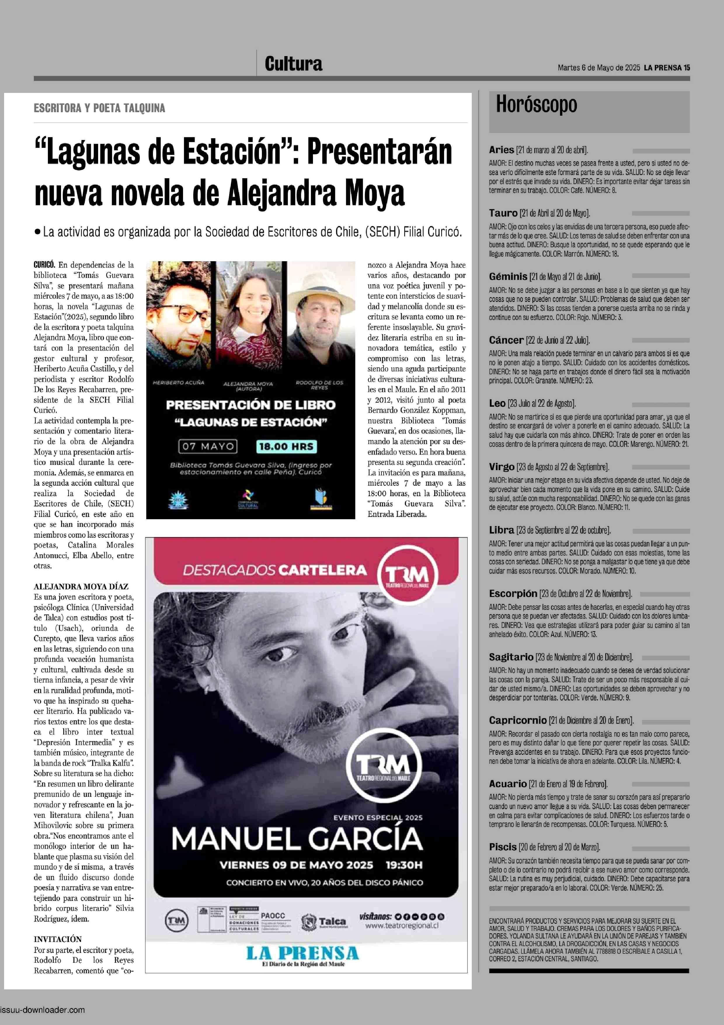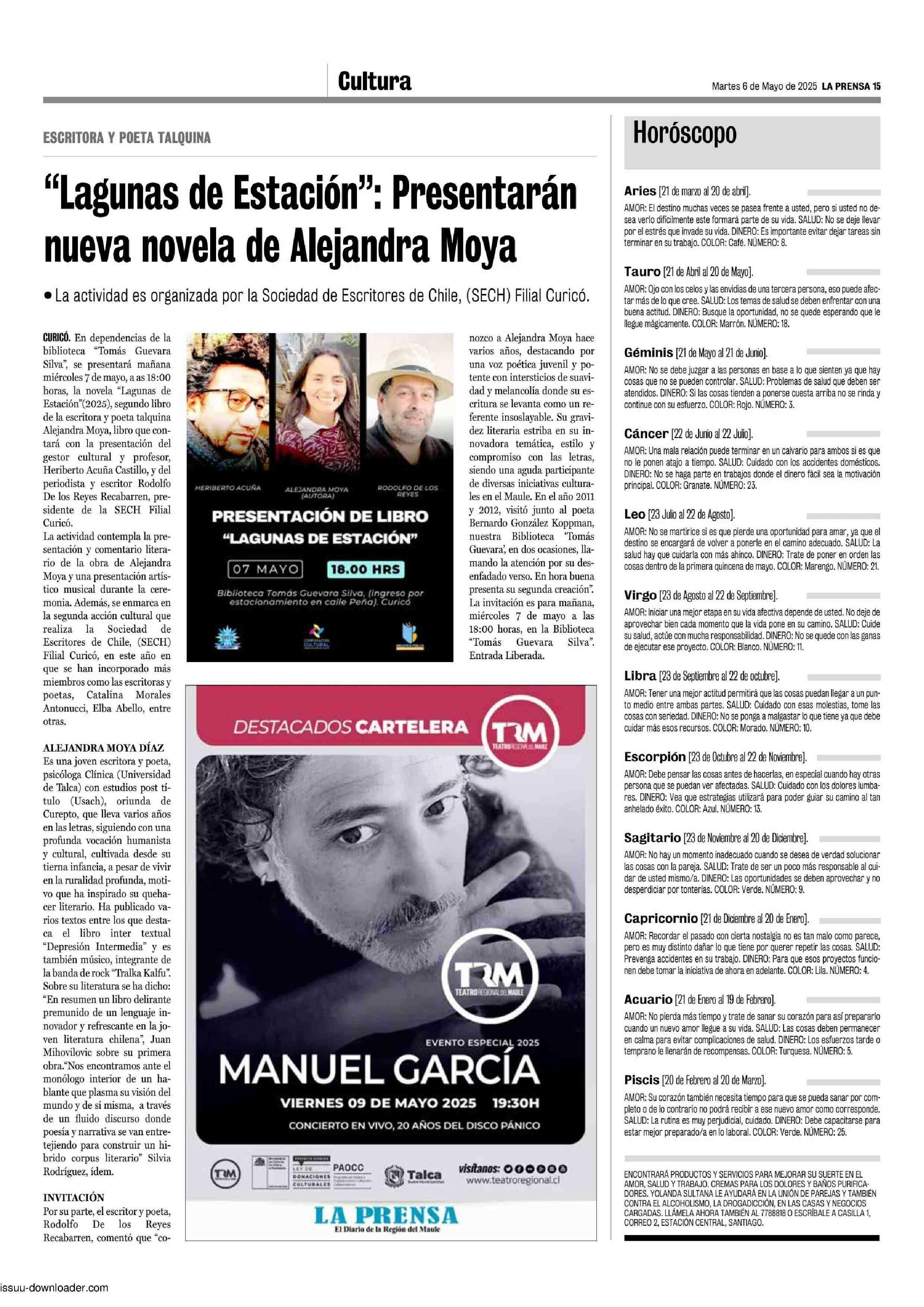 “Lagunas de Estación”: Presentarán nueva novela de Alejandra Moya 06-05-2025 La Prensa de Curicó |