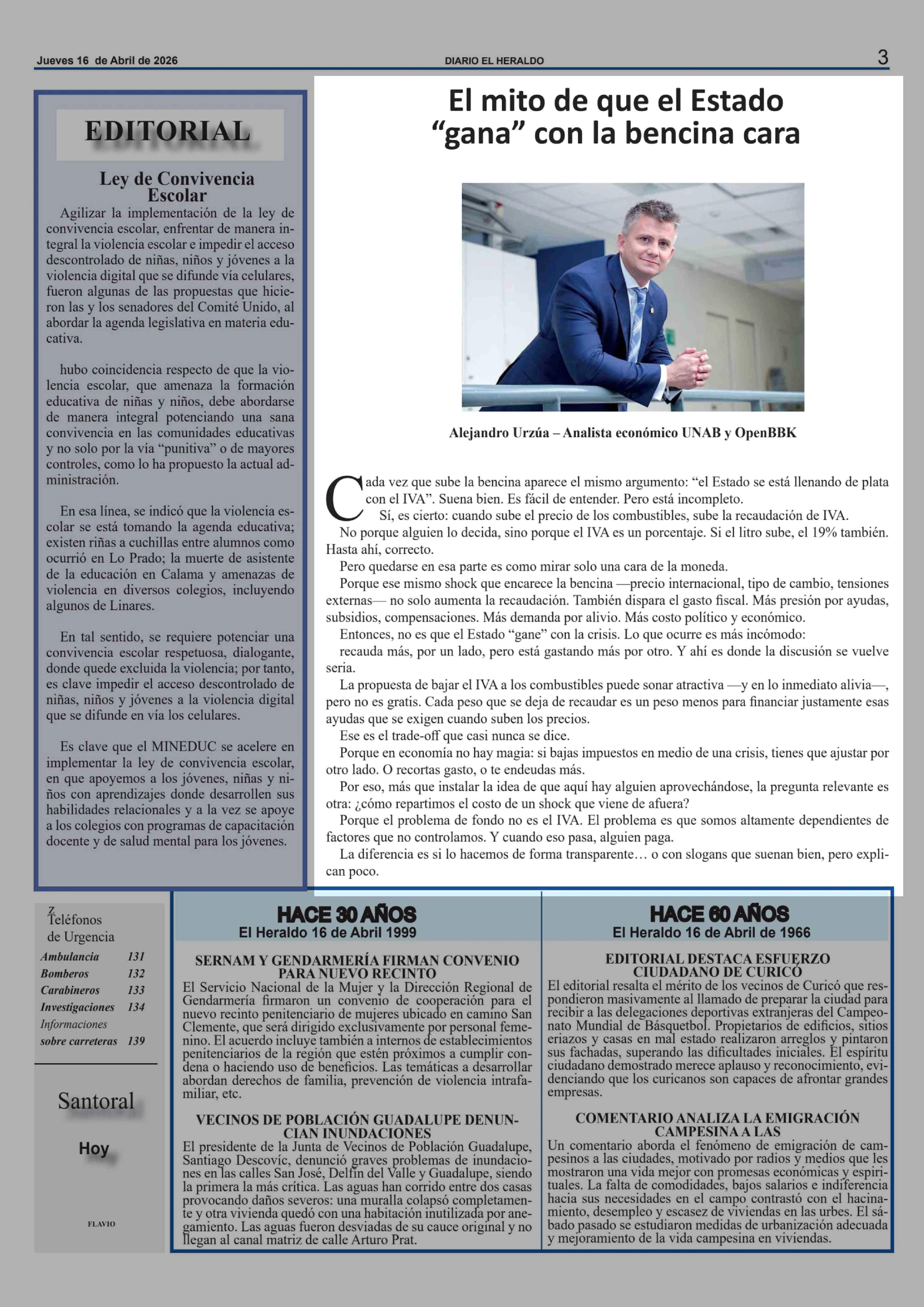 Columnas de Opinión: El mito de que el Estado "gana" con la bencina cara 16-04-2026 El Heraldo |