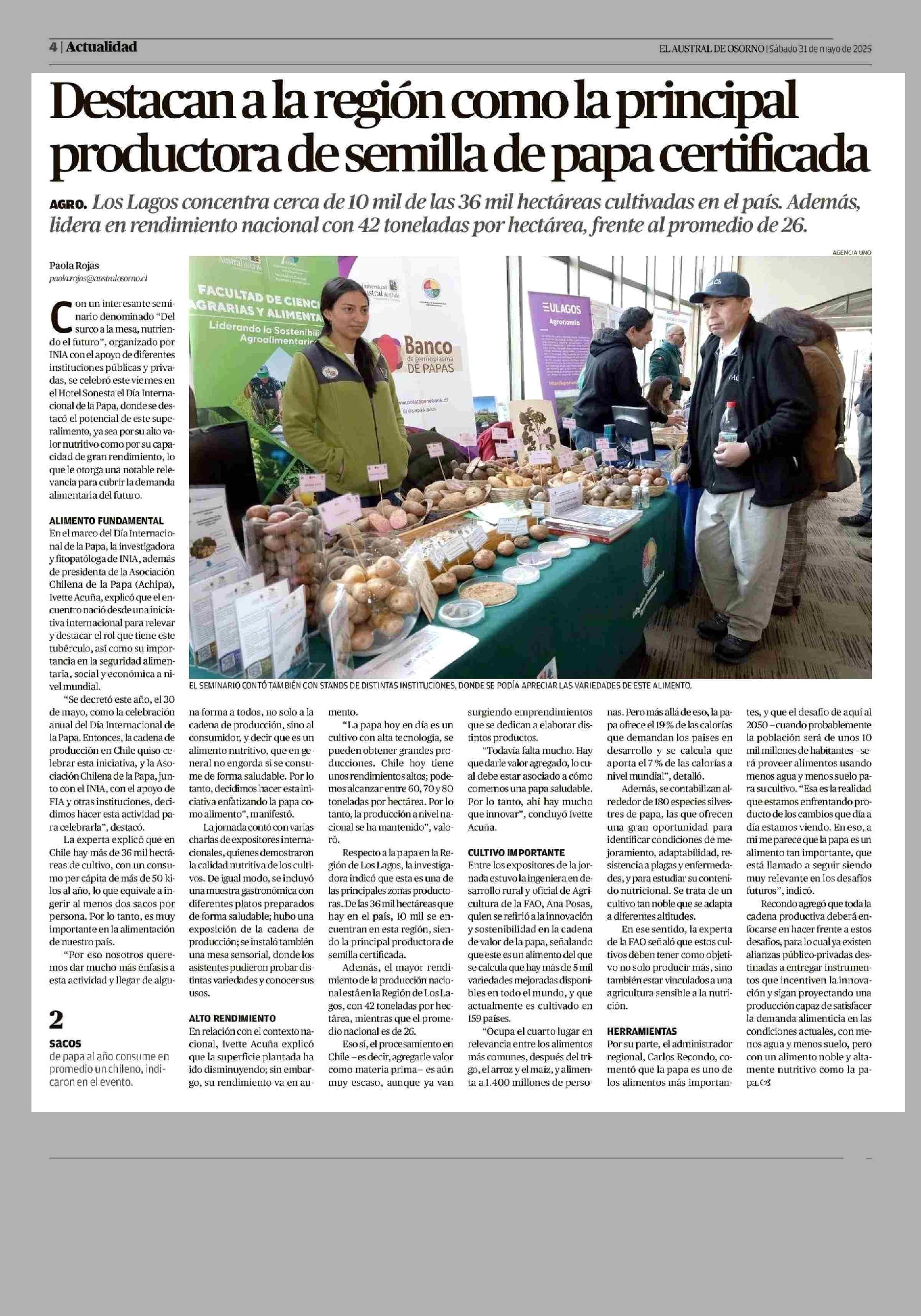 Destacan a la región como la principal productora de semilla de papa certificada 31-05-2025 El Austral de Osorno |