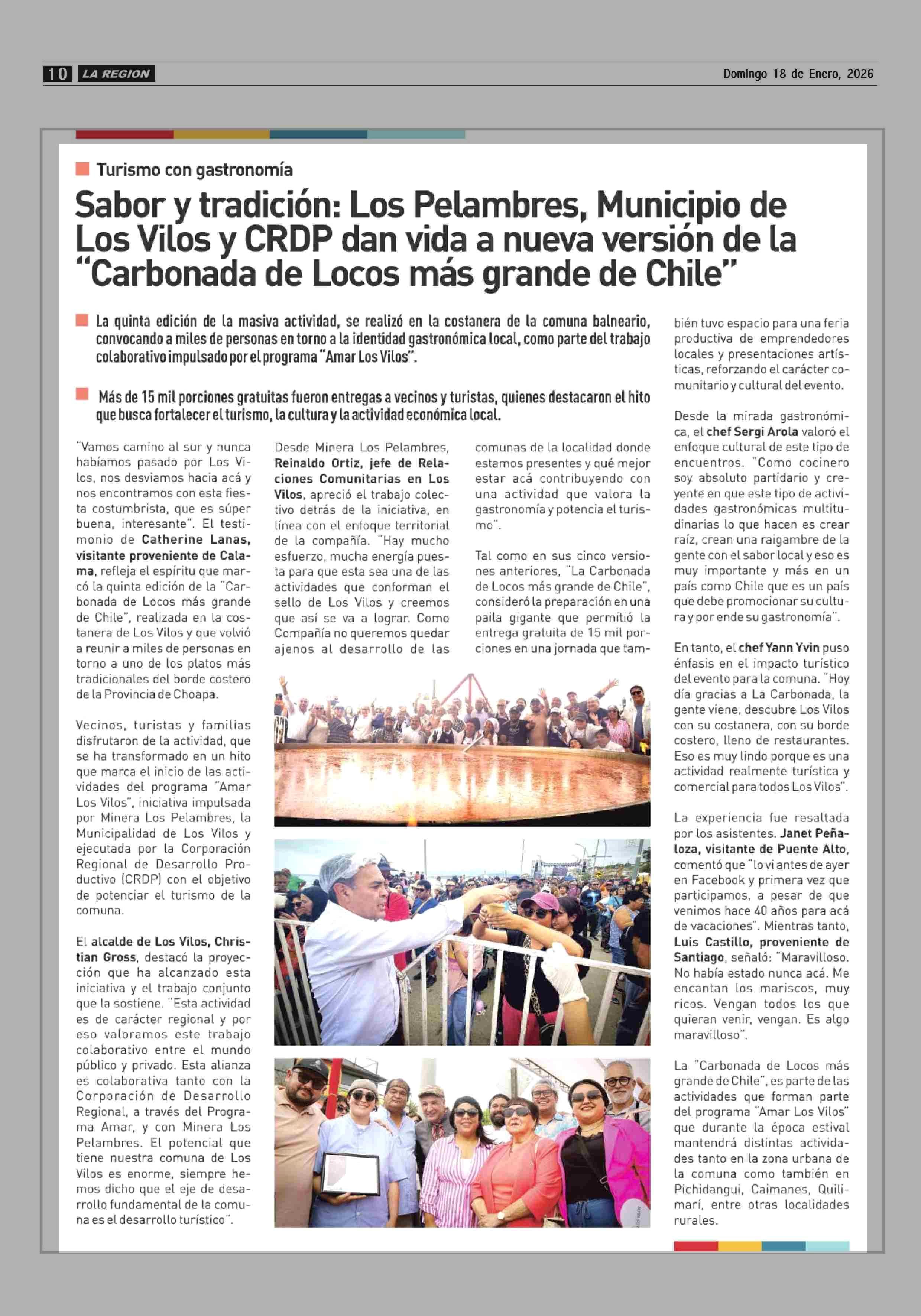 Sabor y tradición: Los Pelambres, Municipio de Los Vilos y CRDP dan vida a nueva version de la "Carbonada de Locos más grande de Chile" 18-01-2026 Diario la Región |