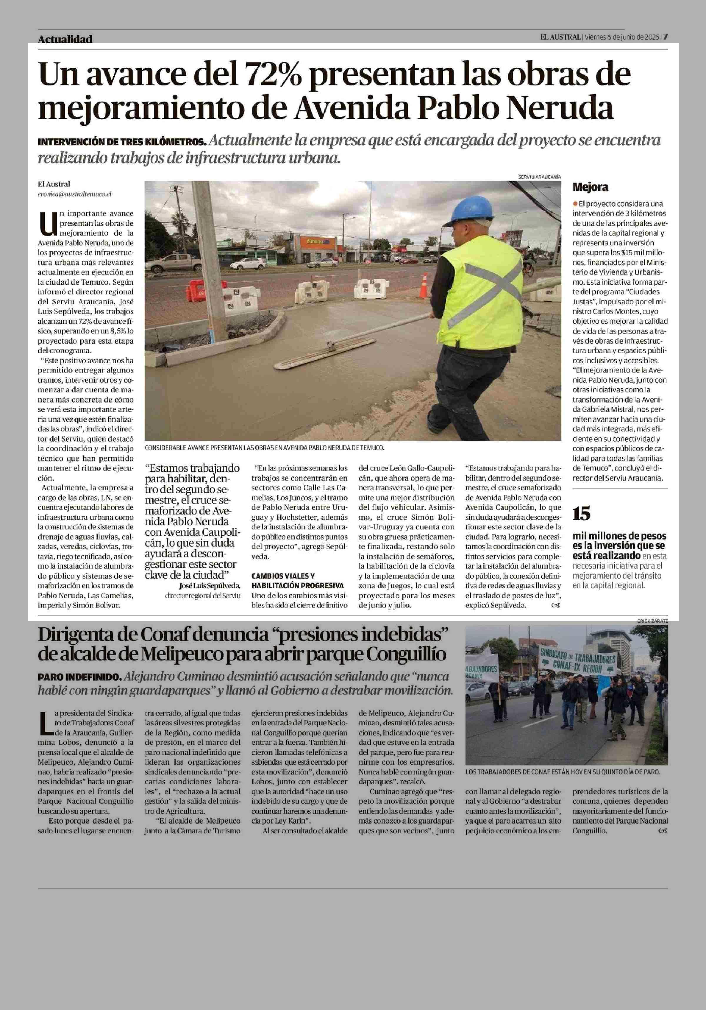Un avance del 72% presentan las obras de mejoramiento de Avenida Pablo Neruda 06-06-2025 El Austral de la Araucanía |